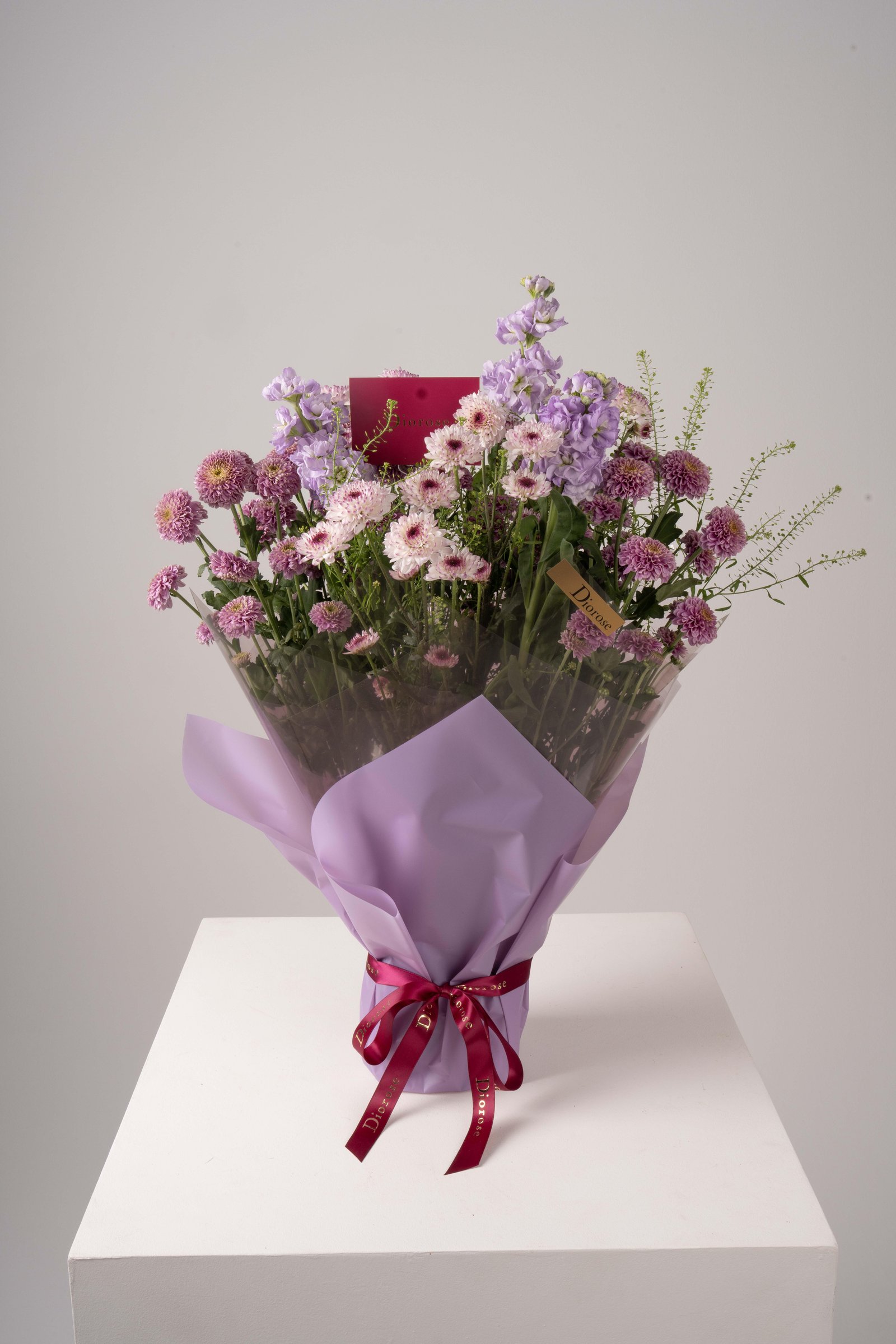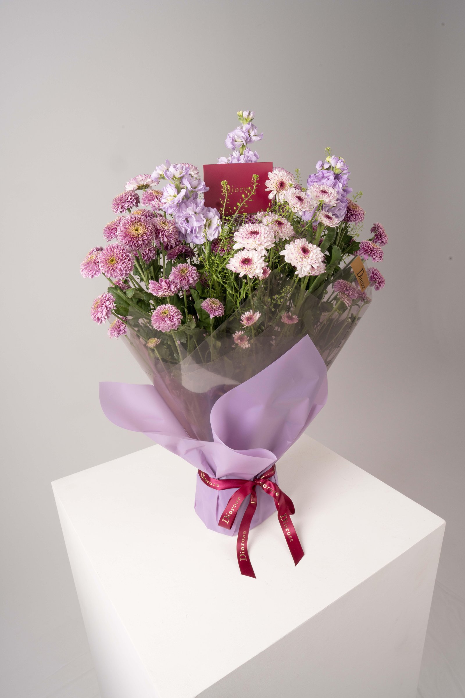 باقة يدتنسيق راقٍ يجمع بين ماتيلولا بنفسجية، وأزرار أقحوان بنفسجي غامق وفاتح، مع لمسة من ليبيديوم أخضر فريش. ملفوف بورق بنفسجي أنيق يمنح الباقة طابعًا راقيًا وفخمًا، مثالية لإضفاء لمسة متقنة على أي مناسبة.