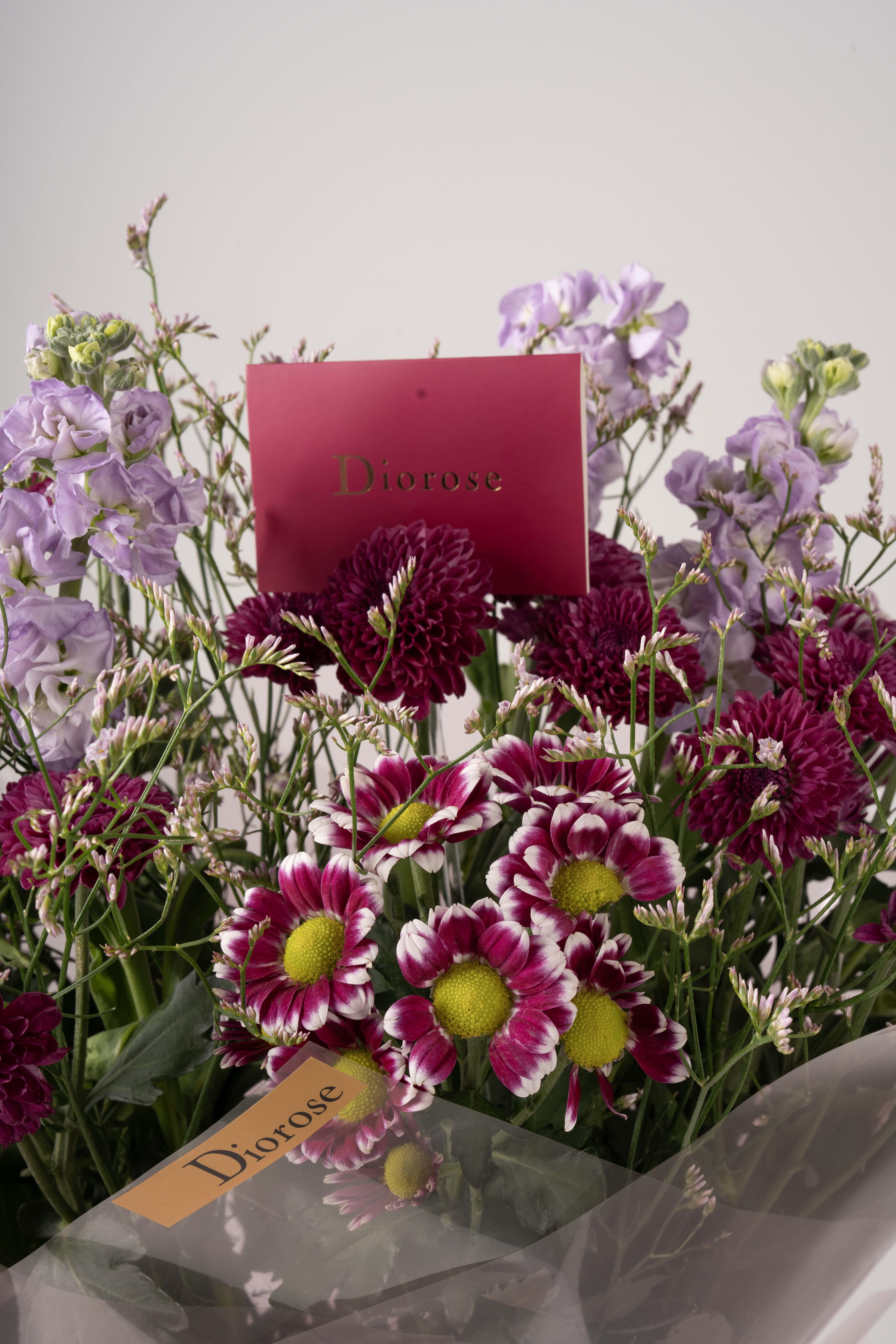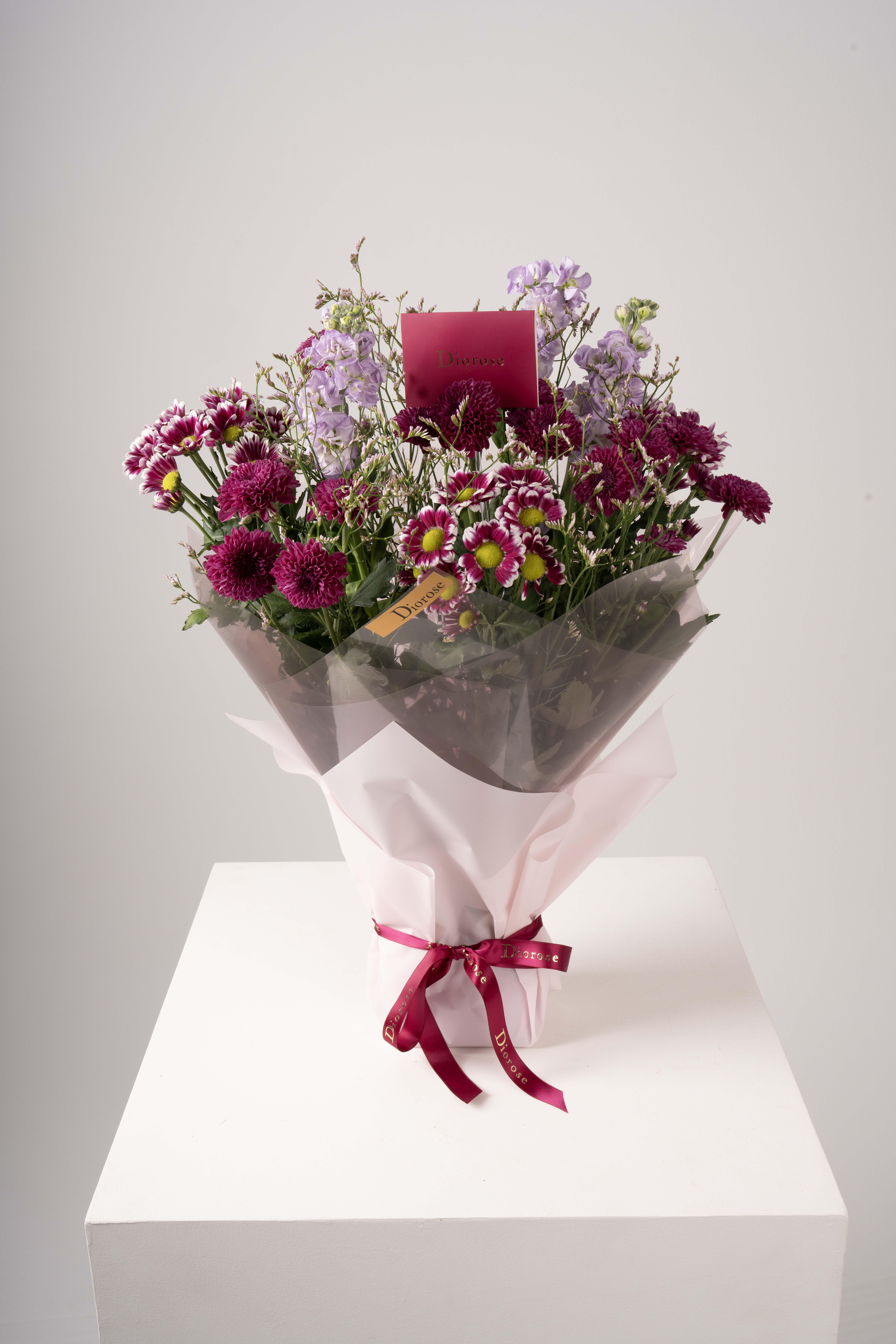 باقة يدتنسيق راقٍ يجمع بين ماتيلولا بنفسجية، وأزرار أقحوان بنفسجي غامق، وأقحوان صغير مزدوج بنفسجي، مع لمسة من ليمونيوم وردي ناعم. ملفوف بورق وردي أنيق يمنح الباقة طابعًا راقيًا وفخمًا، مثالية للاحتفال بأي مناسبة خاصة بأسلوب أنيق وراقي.