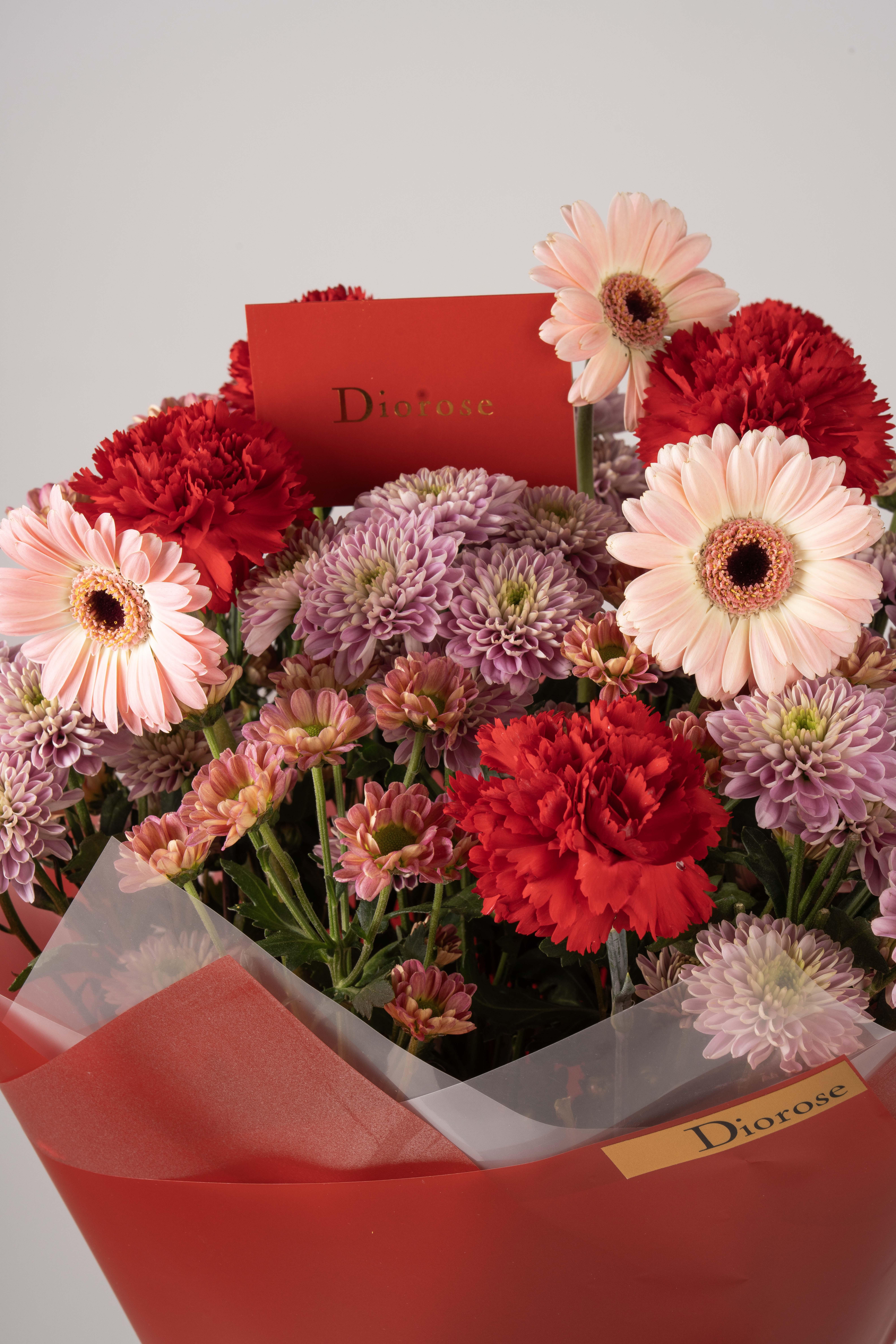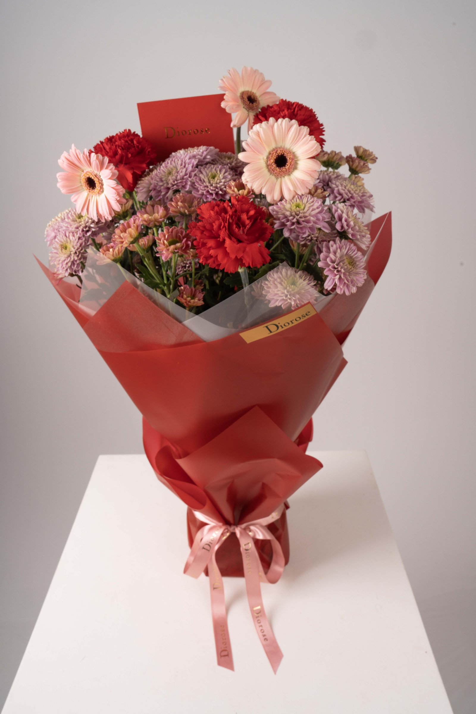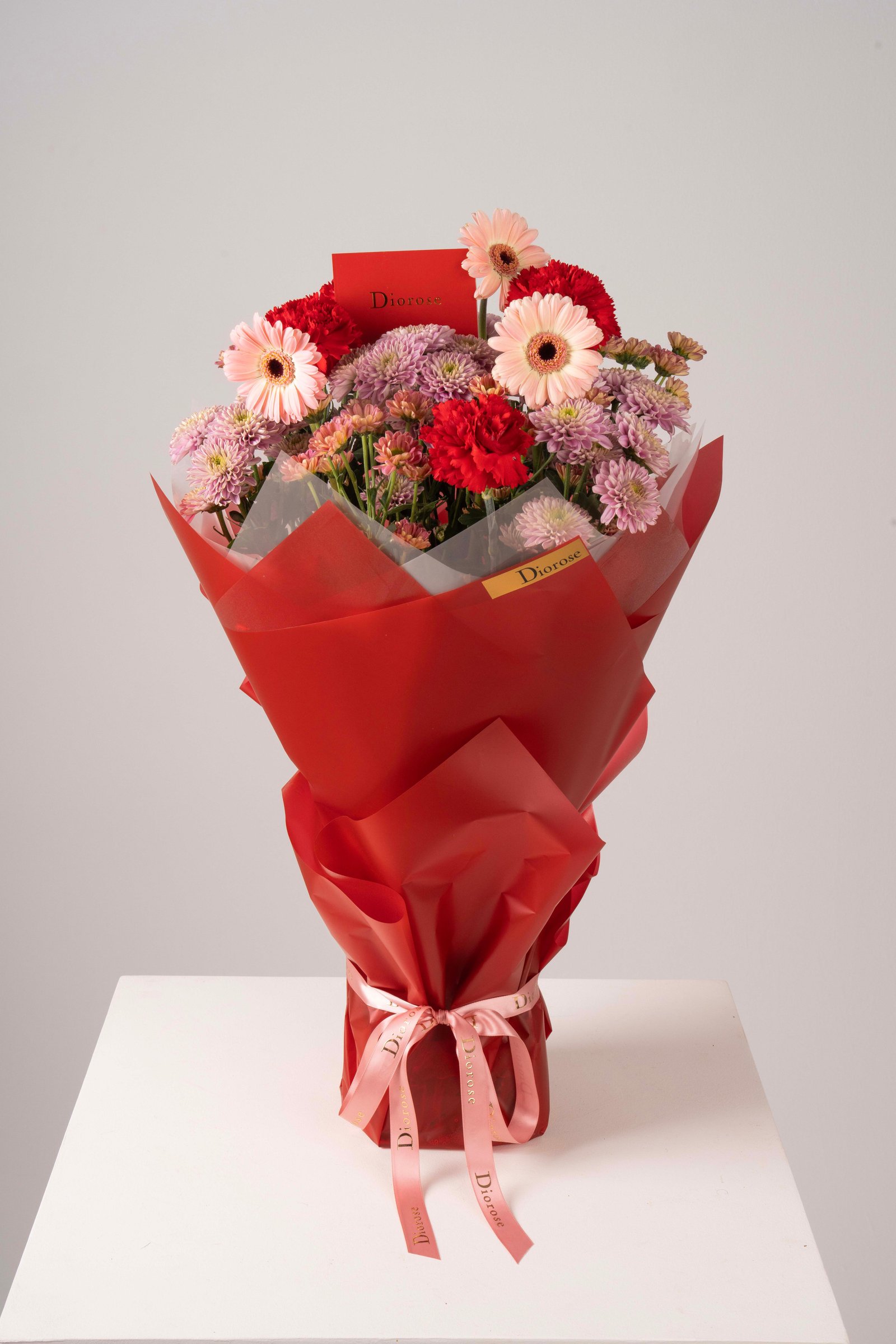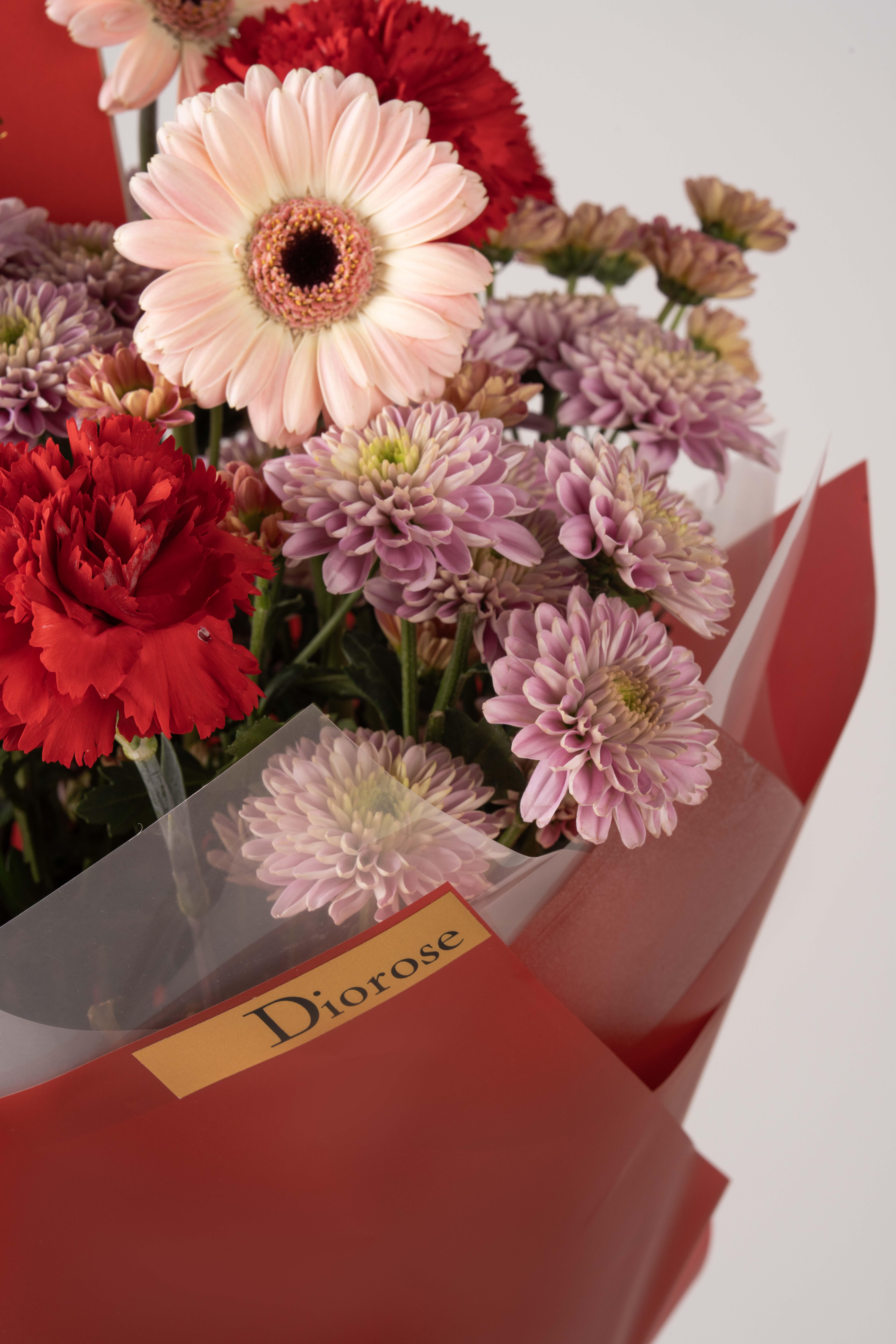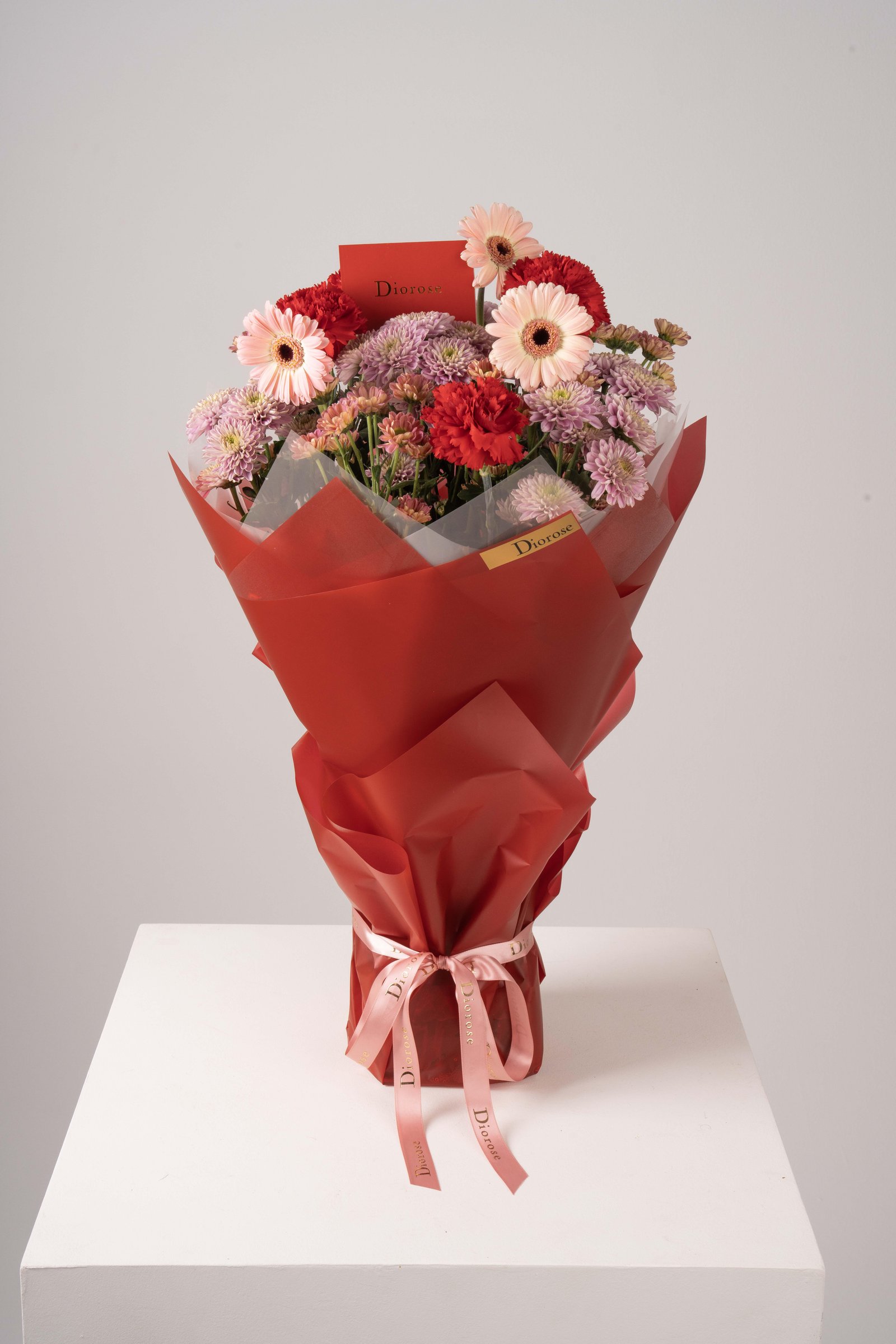 تناغم نابض بالحياة وأنيق من القرنفل الأحمر، الجربيرات الوردية الناعمة، داوودي بنفسجي فاتح دقيق، وداوودي صغير بيج ساحر. ملفوفة بأناقة بورق أحمر، تعكس هذه الباقة الرقي، الدفء، والفخامة الخالدة — مثالية لجعل أي مناسبة لا تُنسى.