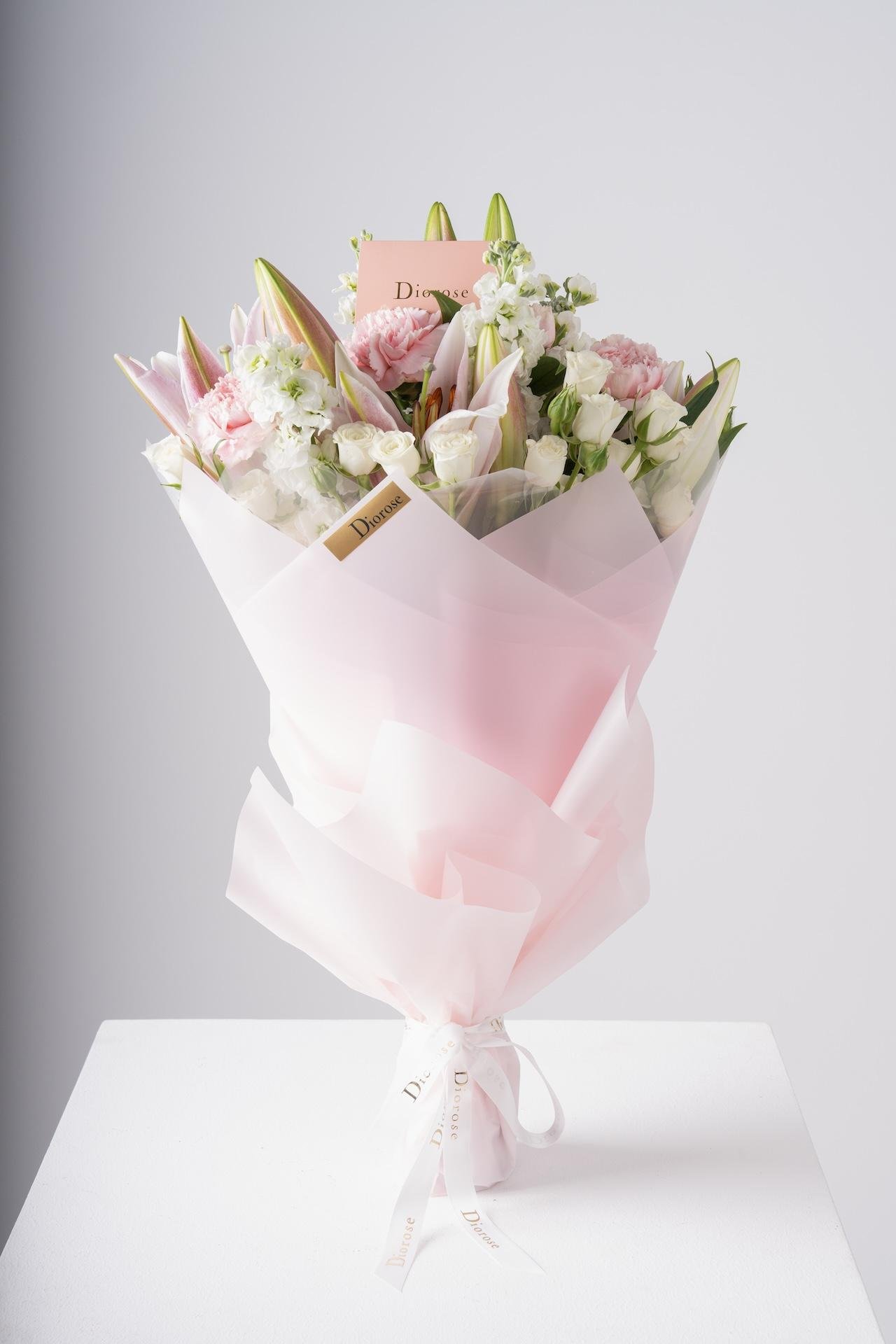 باقة يدتتميز هذه الباقة الجميلة بالزنابق الوردية، القرنفل الوردي، سبراي روز الأبيض الثلجي، والماثيولا البيضاء، مغلفة بورق تغليف تختار بين الوردي أو الأبيض. يمزج هذا التنسيق الرقيق بين ألوان الوردي والأبيض ليُشكّل باقة أنيقة وخالدة، مثالية لأي مناسبة أو كهدية معبرة تنبض بالجمال والرقي.