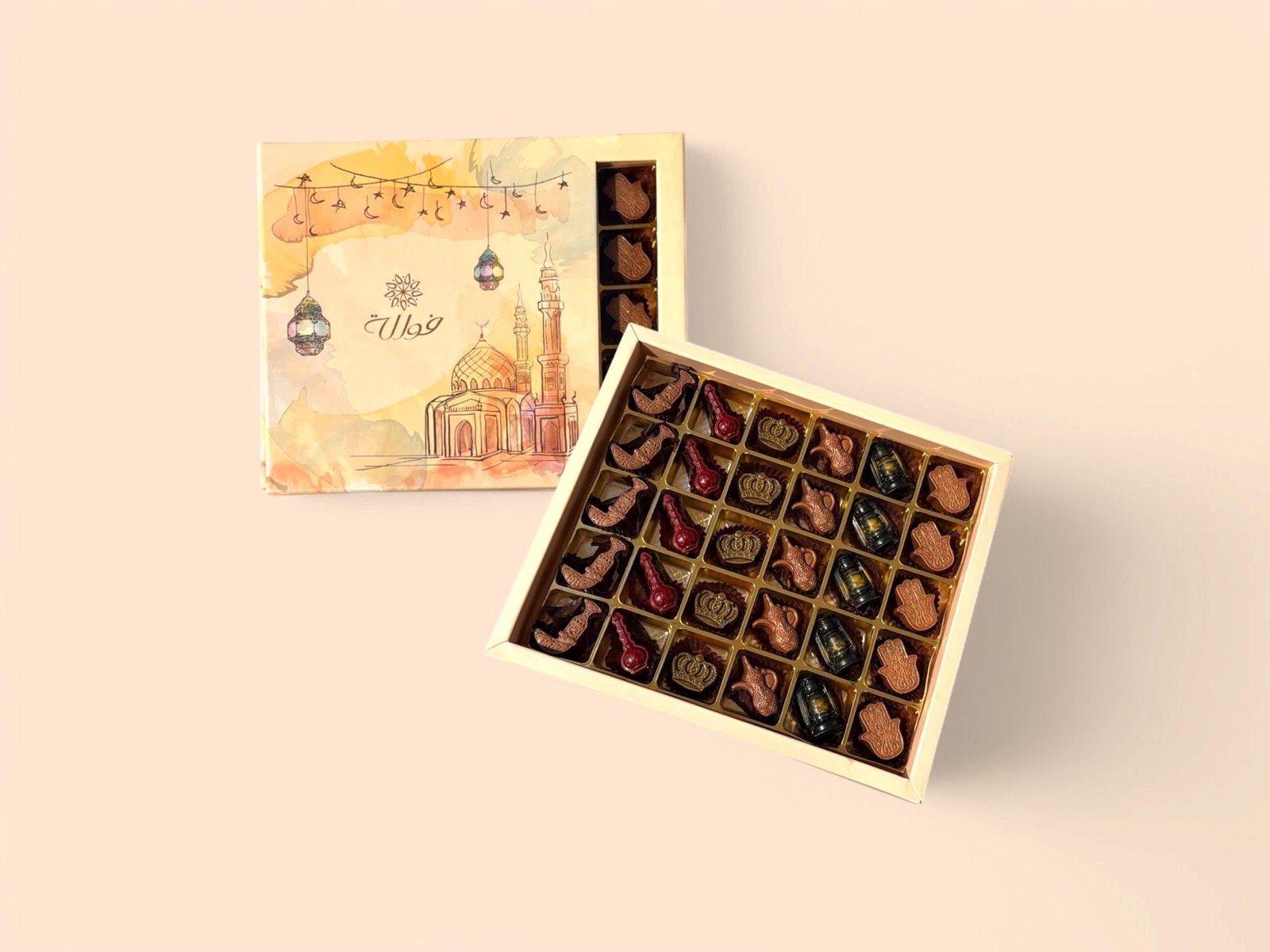 "30 pieces of chocolate with a variety of traditional Omani flavors… presented in a special box with a 5x6 grid design."