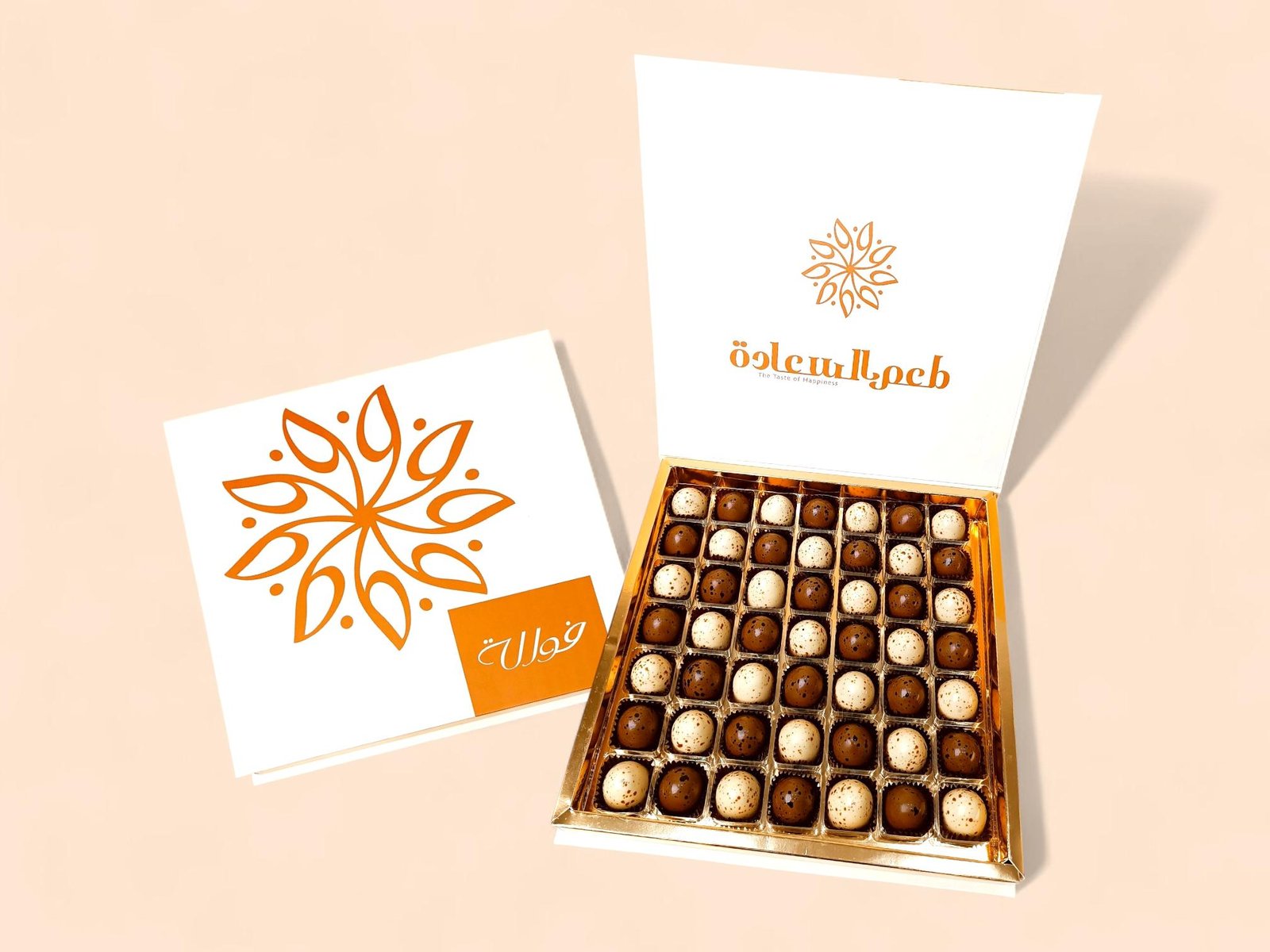 "Chocolate eggs, filled with biscuit and pistachio cream (in the white variety) and biscuit with hazelnut cream (in the dark variety)... presented in a large box containing 49 pieces of chocolate."
