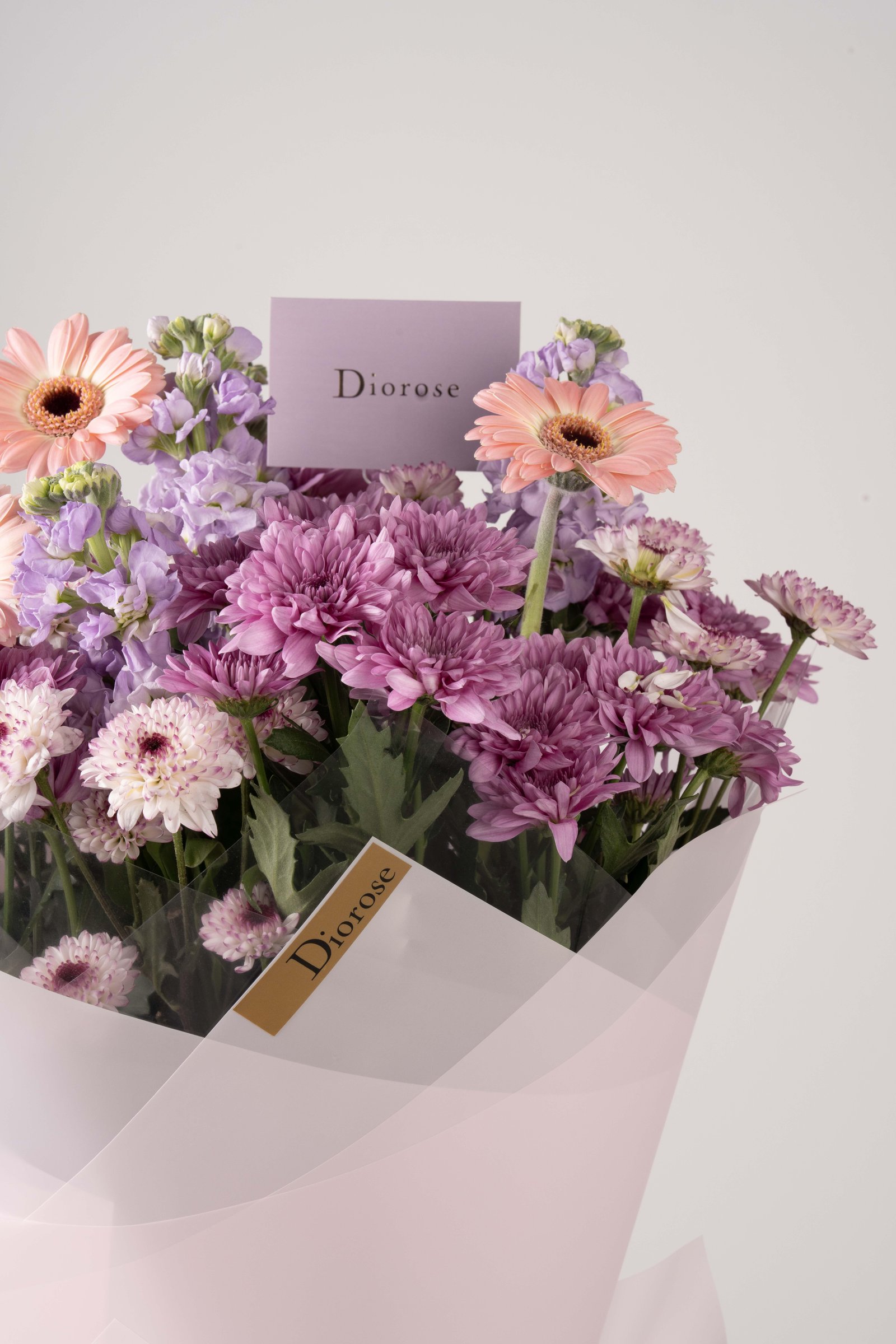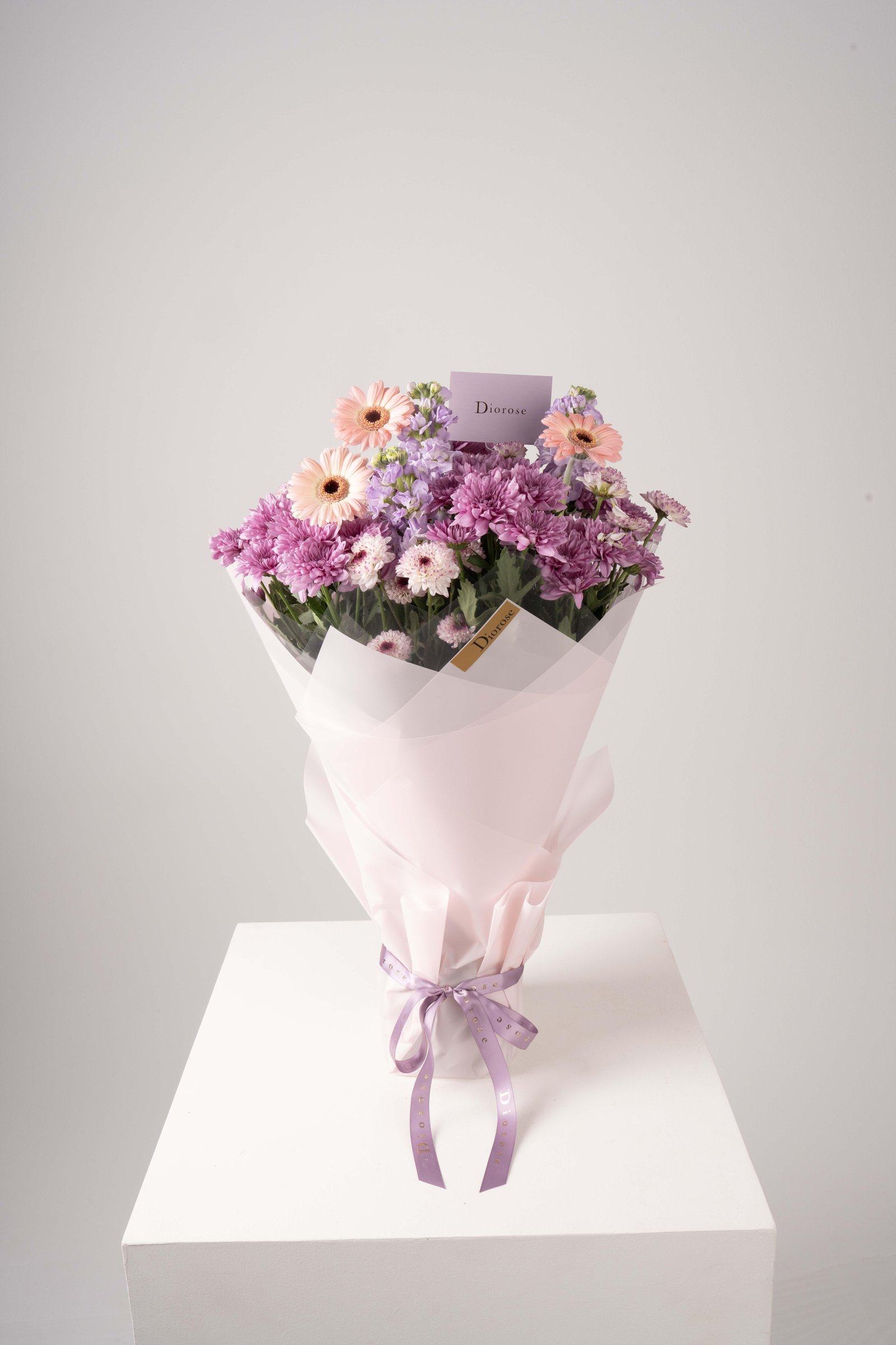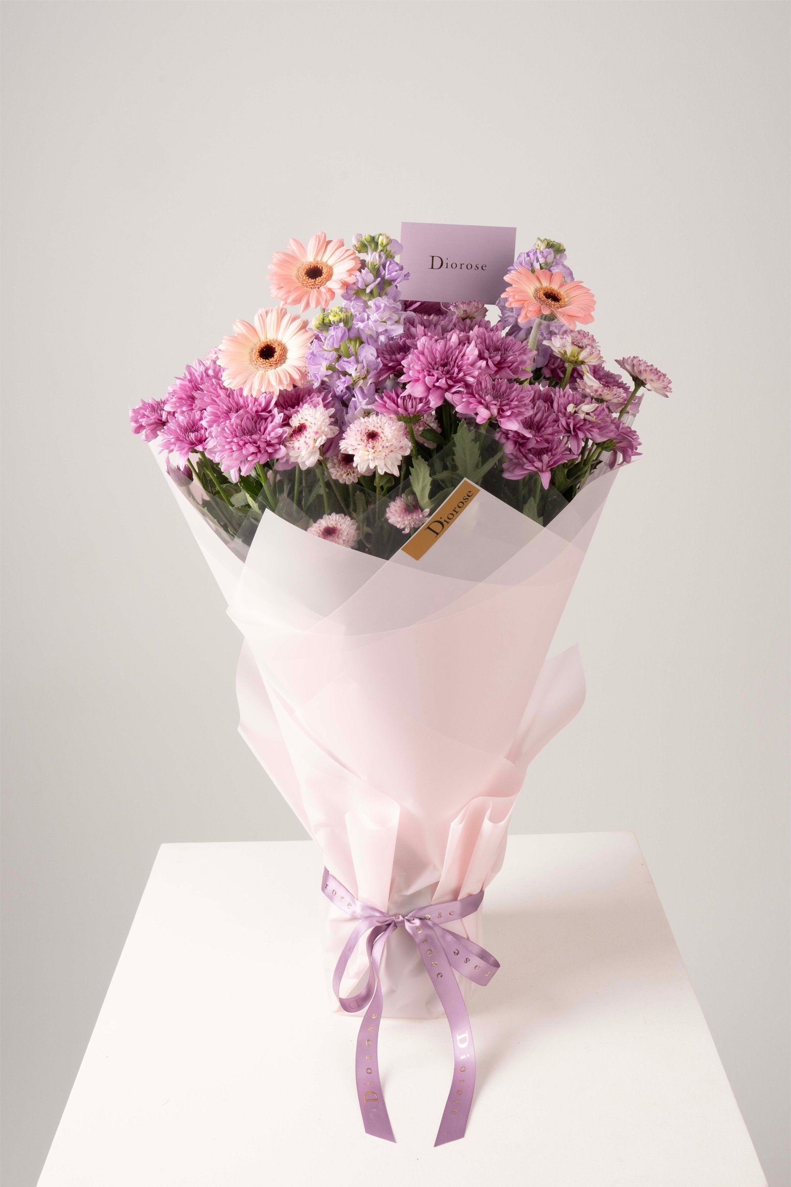 A graceful blend of pink and purple hues, this bouquet captures pure elegance and charm. Featuring soft pink gerberas, fragrant purple matthiolas, and delicate chrysanthemums wrapped in pastel pink paper — it’s a perfect balance of simplicity and luxury. Ideal for heartfelt occasions or a gentle touch of beauty in any moment.