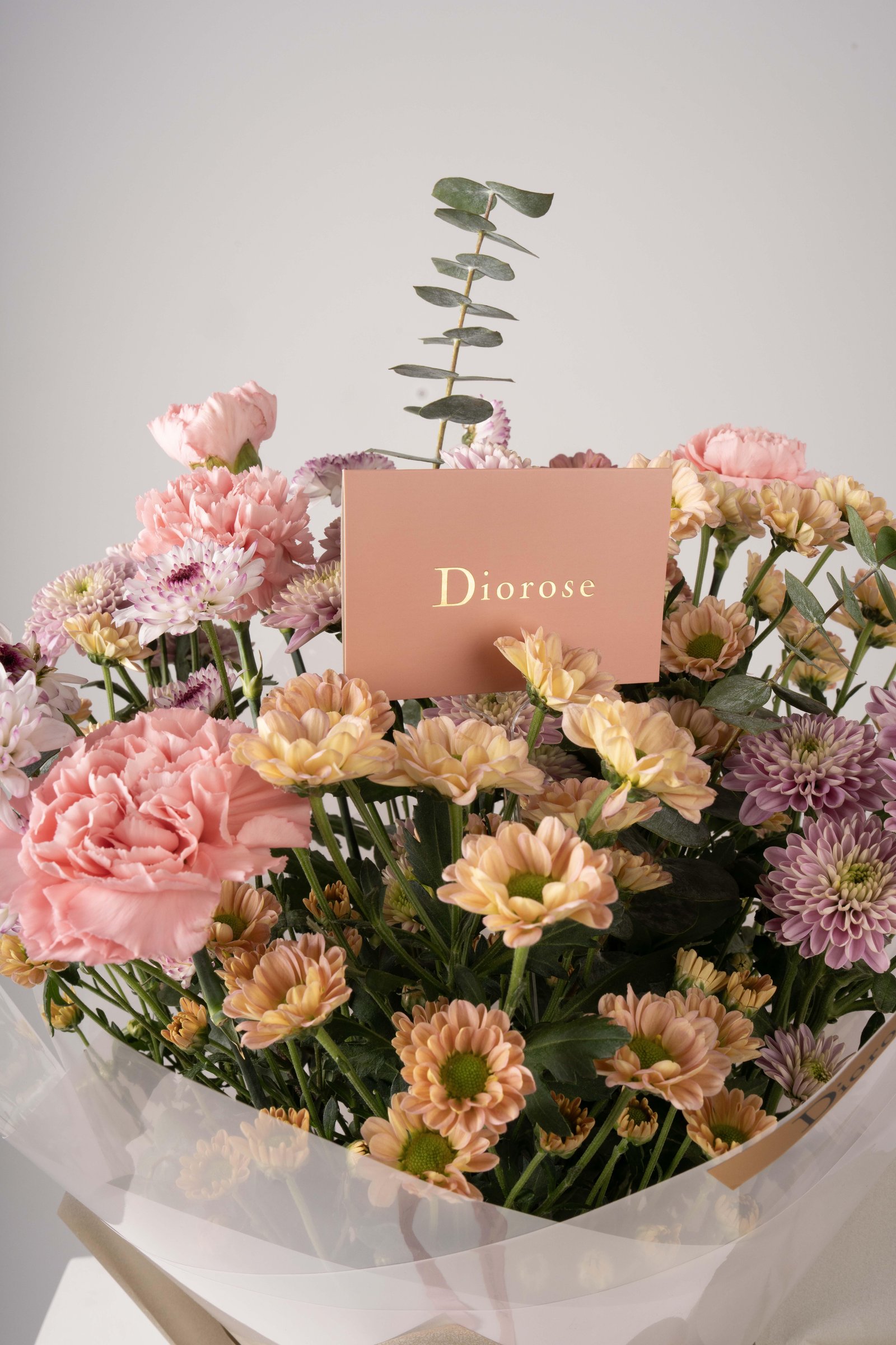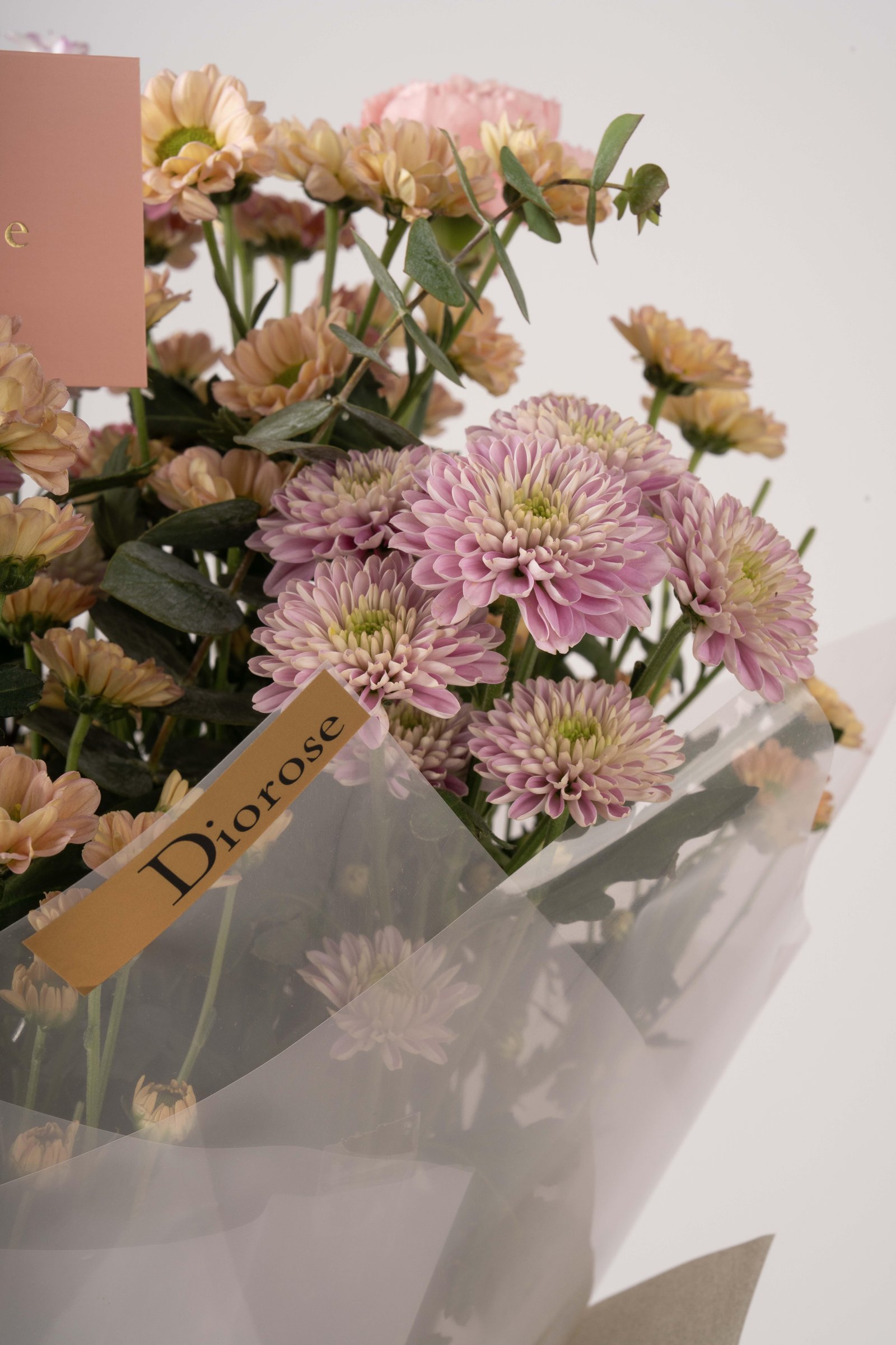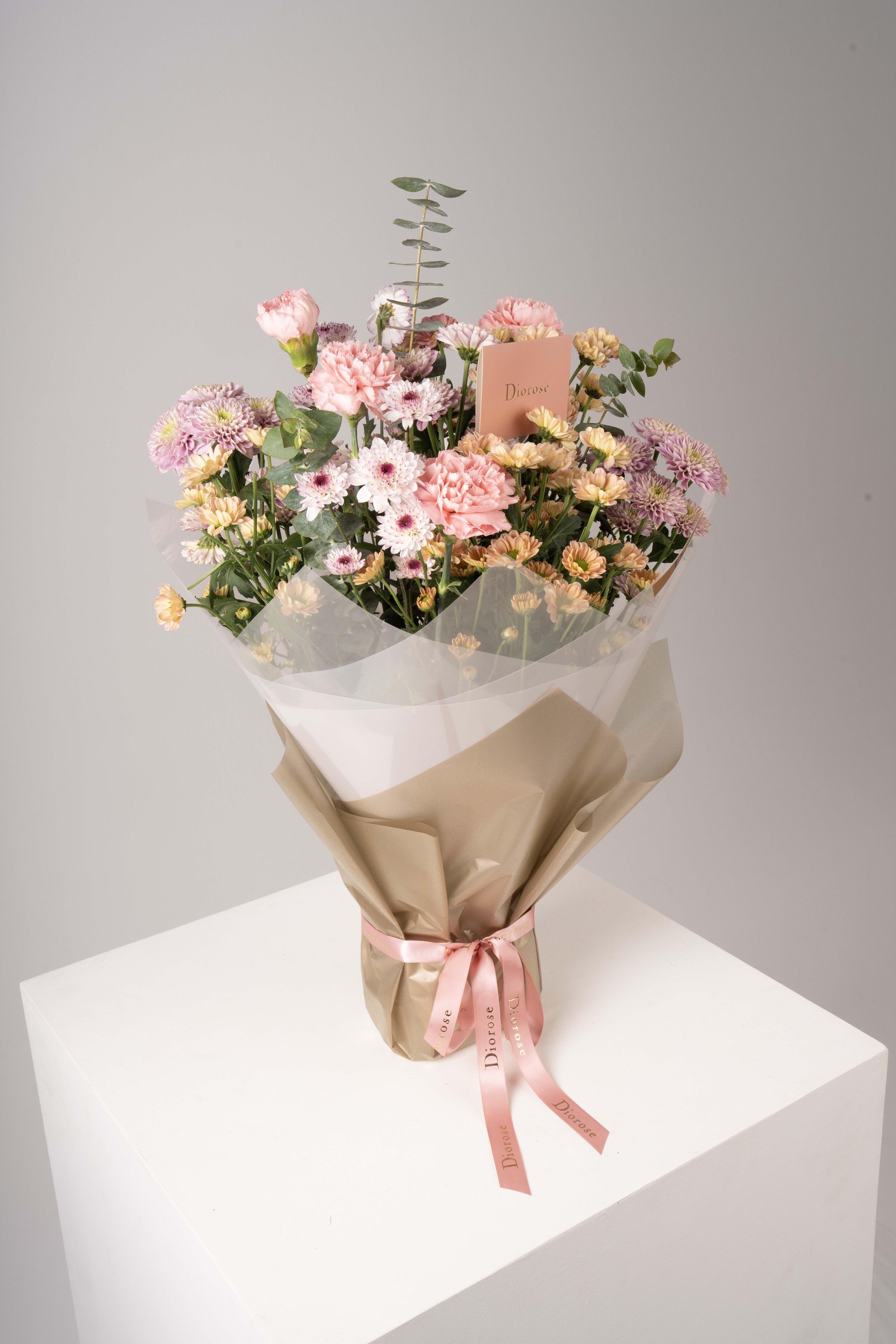 HAND BOUQUETA delicate blend of pink carnations, beige baby chrysanthemums, and light and dark purple button chrysanthemums, accented with fresh dollar eucalyptus. Wrapped in elegant gold paper, this bouquet radiates sophistication, charm, and timeless luxury — perfect for celebrating any special occasion with elegance.