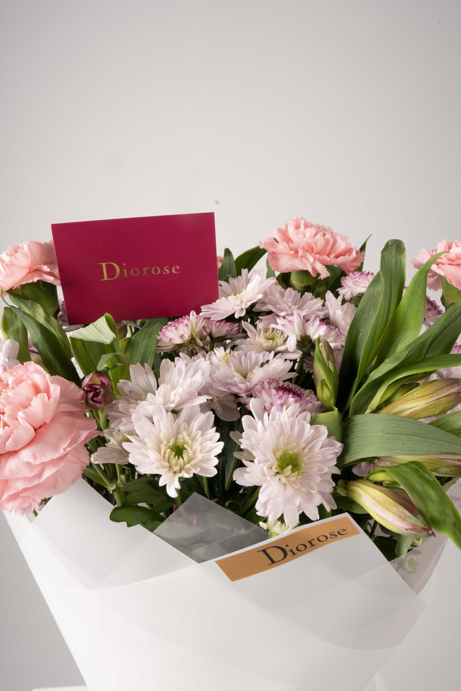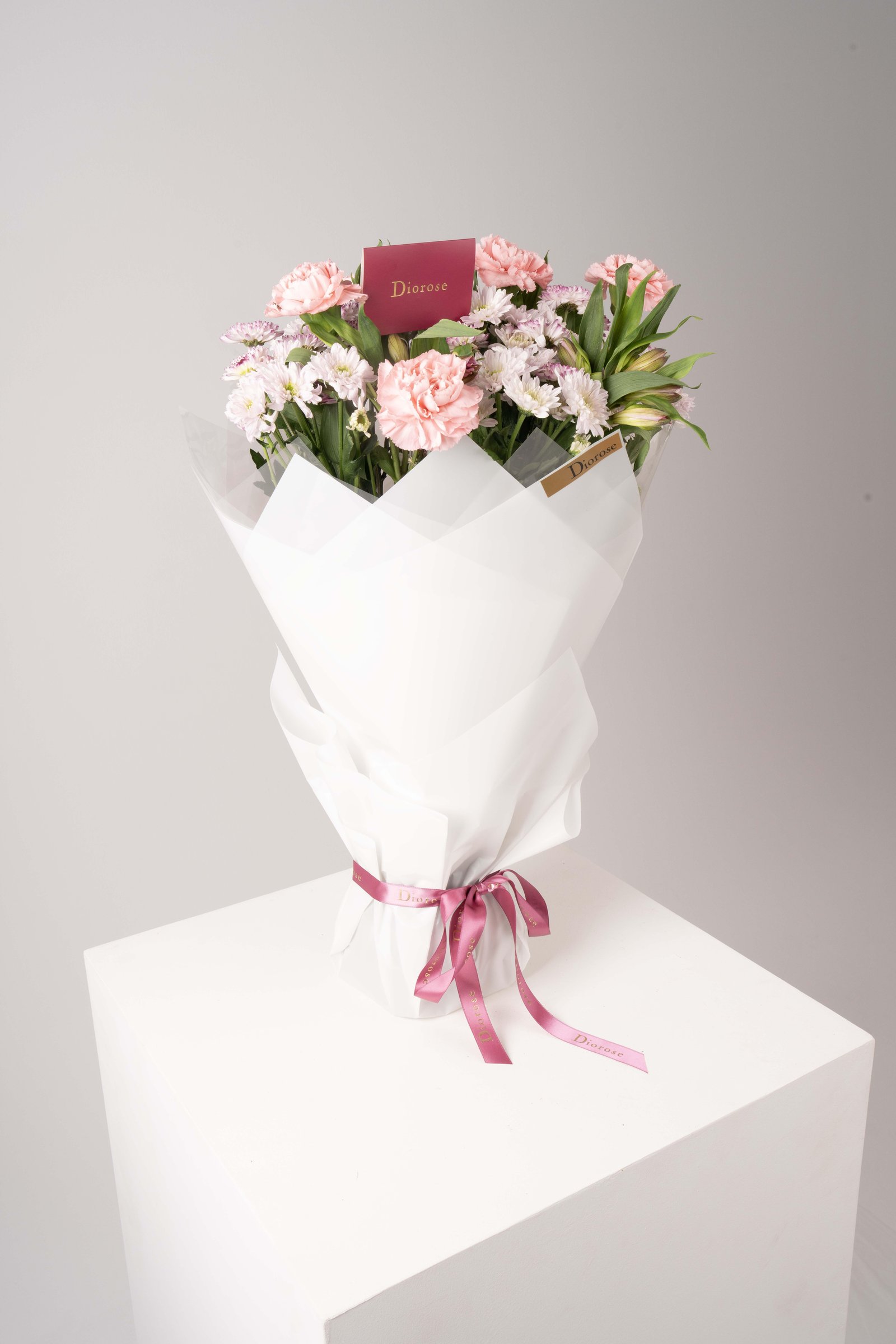 HAND BOUQUETA graceful arrangement of soft pink alstroemerias and carnations, paired with light and dark purple chrysanthemums. Wrapped elegantly in white paper, this bouquet exudes sophistication, charm, and timeless luxury — perfect for celebrating special moments with elegance.