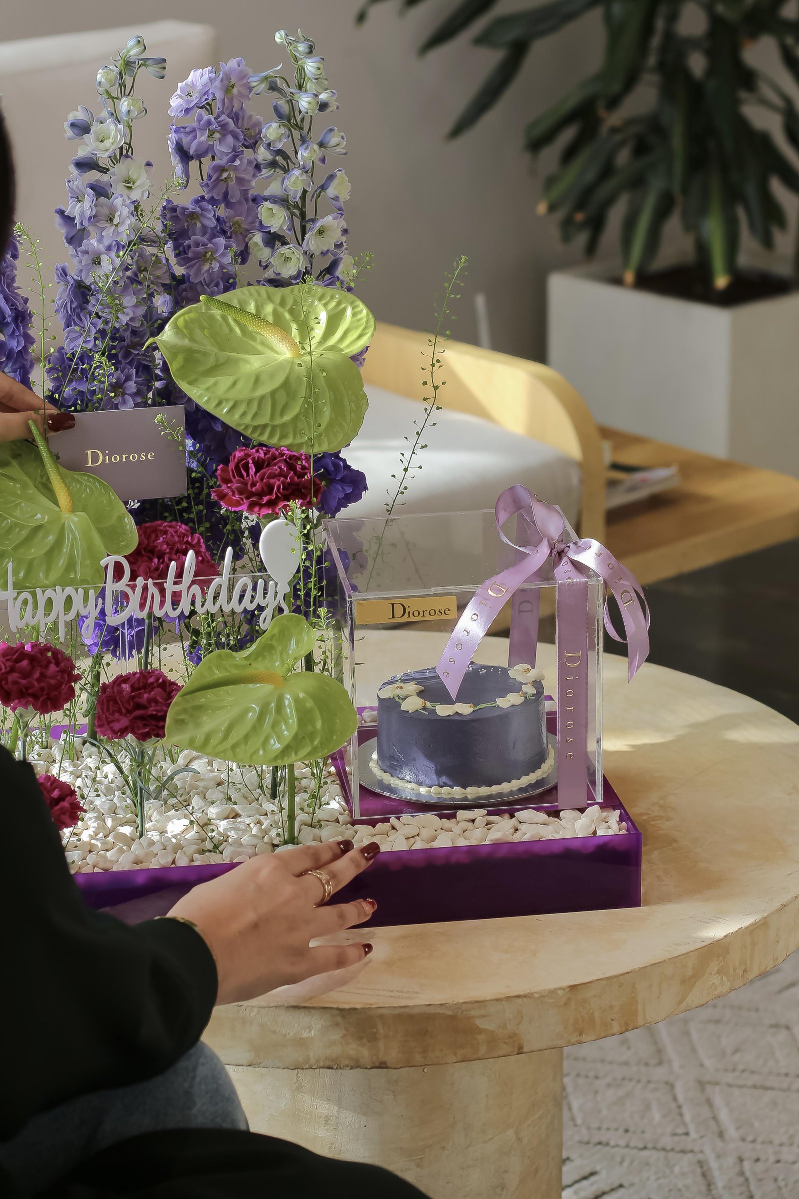 ORCHIDDelicate yet striking, this romantic birthday arrangement blends graceful purple delphiniums with soft green anthuriums and hot pink carnations. Nestled among airy lipidium greenery and white stones, the florals are presented in a purple acrylic tray and accompanied by a charming mini cake, making it a heartfelt birthday surprise.