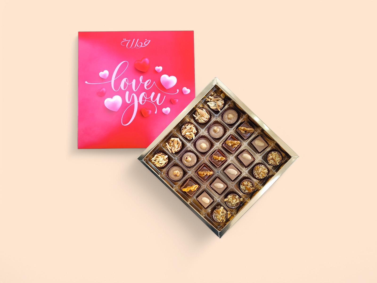25 pieces assorted flavors chocolates with mixed nuts inside, on a box designed to share love on Valentines day.