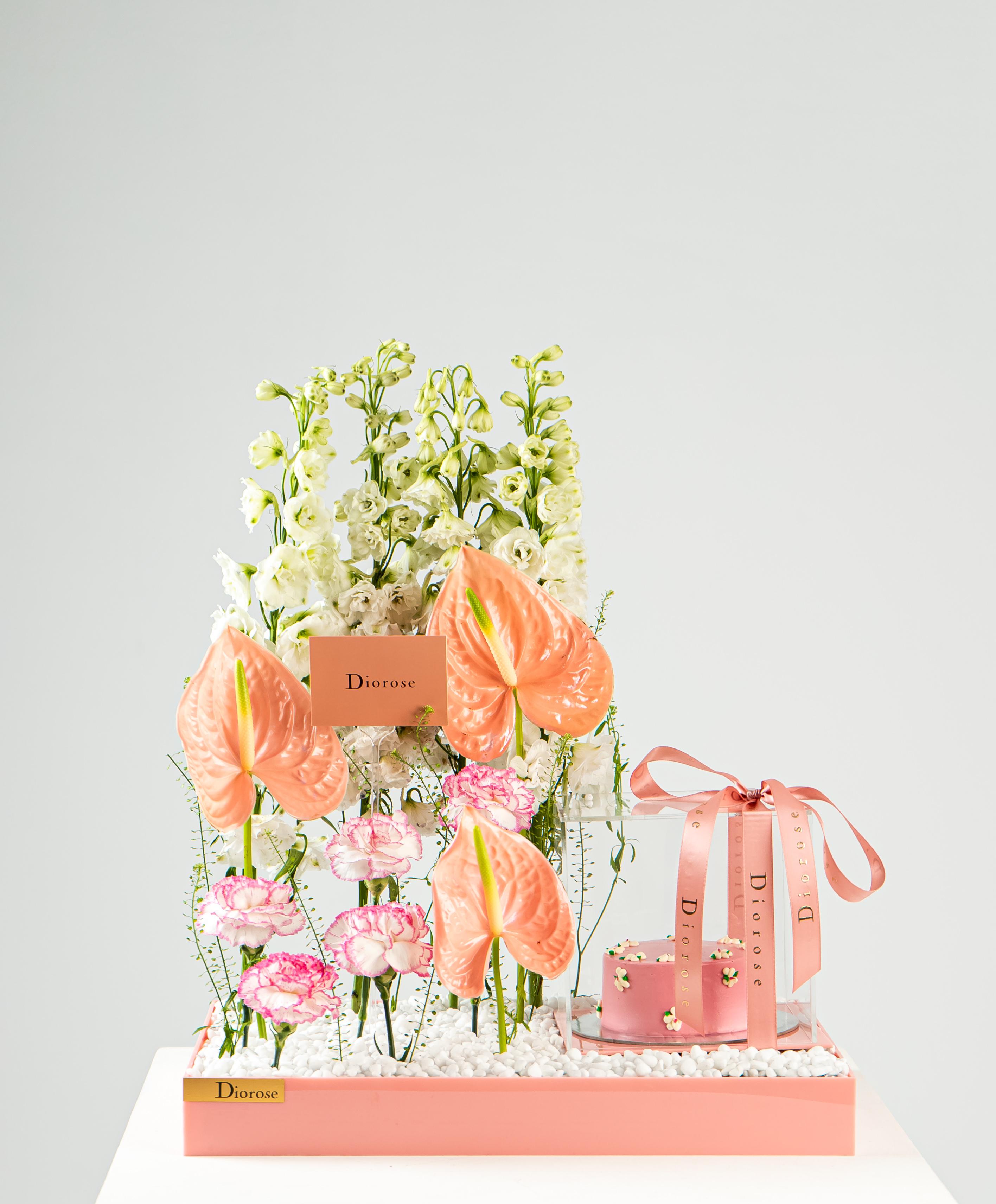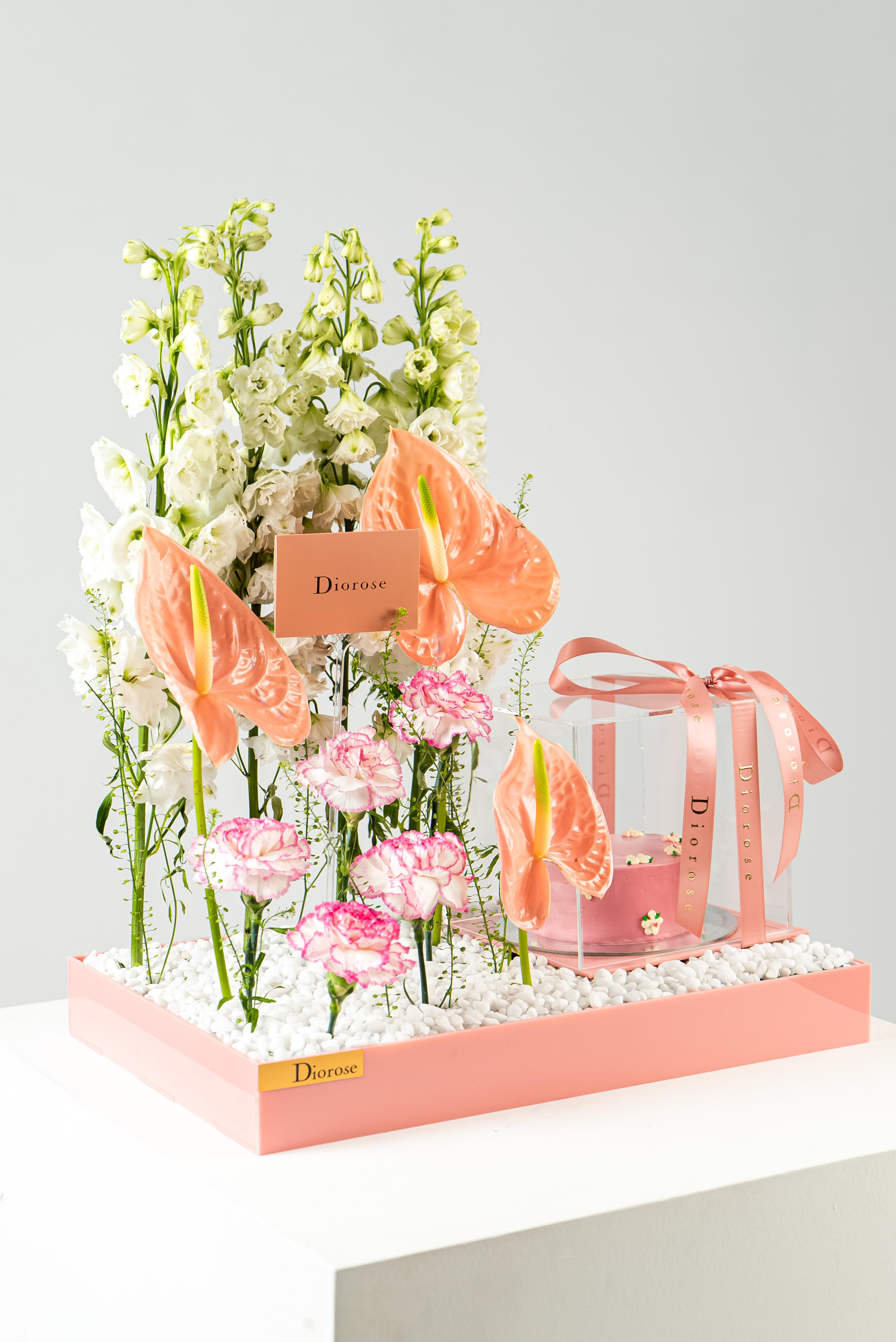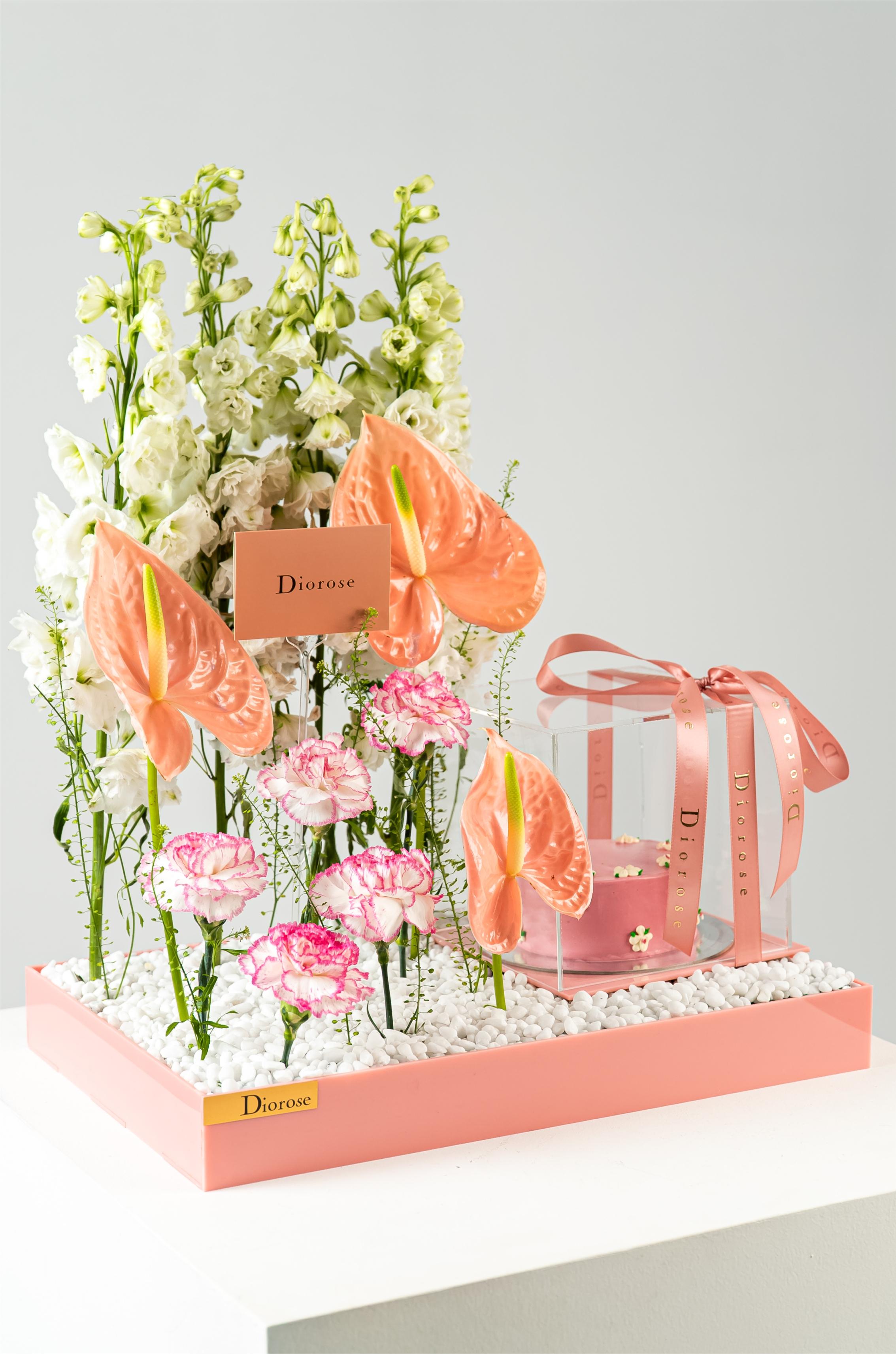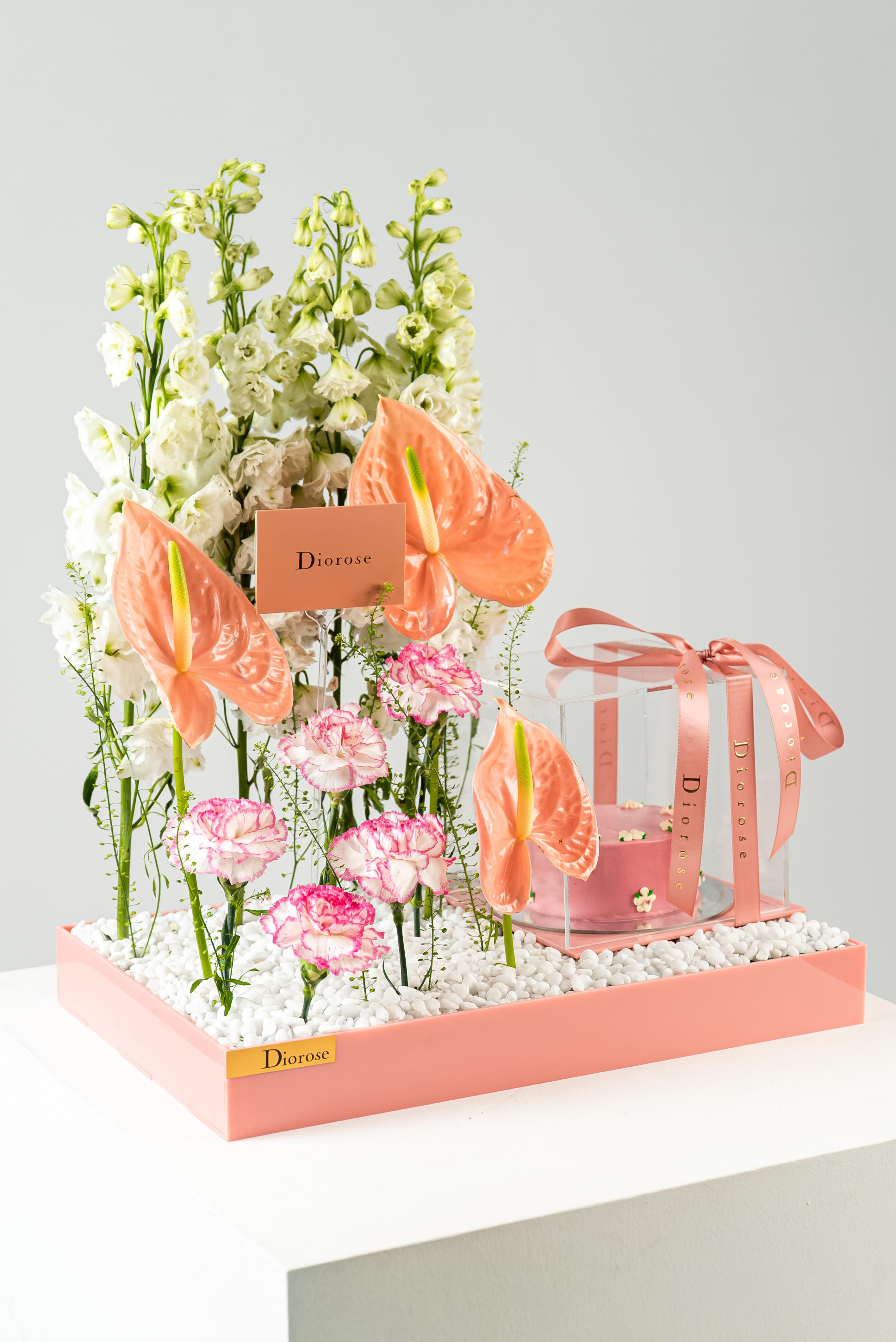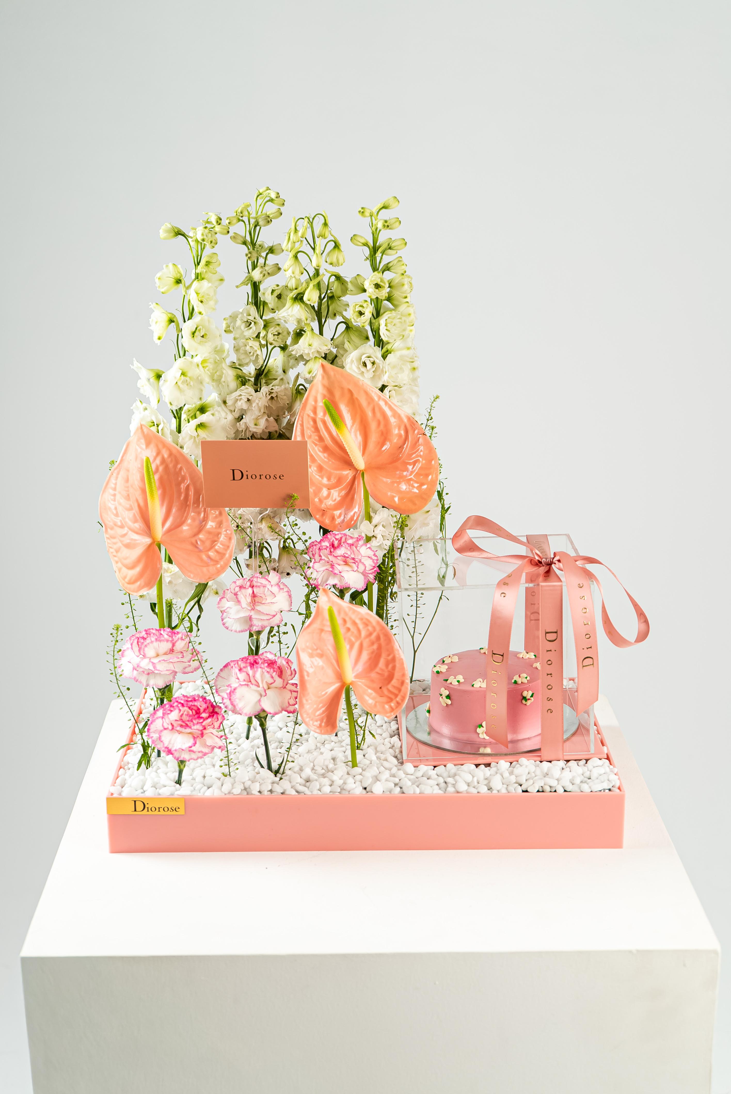 ACRYLICCelebrate beauty and sweetness with this exquisite pink acrylic tray, thoughtfully designed to delight the senses. A graceful arrangement of white Delphinium, soft pink Carnation, vibrant green Anthurium, and delicate Lipidium creates a harmonious floral display that radiates freshness and elegance. Nestled beside the blooms is a pink cake, perfectly encased in a transparent acrylic box, showcasing its charming detail while keeping it pristine. This stunning ensemble is ideal for gifting on birthdays, anniversaries, or any special moment—where flowers and sweetness come together in perfect harmony.