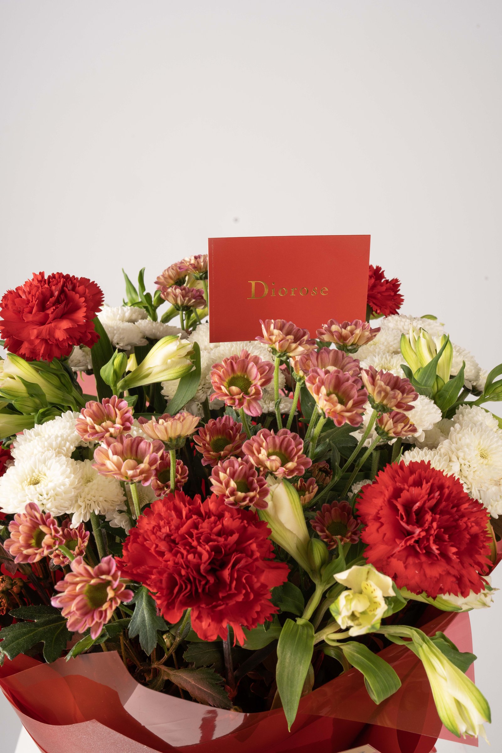 HAND BOUQUETRadiate love and warmth with the Crimson Elegance Hand Bouquet. Beautifully arranged with vibrant red carnations, soft white blooms, and delicate pink accents, this bouquet is wrapped in luxurious red paper and tied with a satin ribbon. Perfect for expressing passion, admiration, or heartfelt celebration — an ideal gift for anniversaries, birthdays, or any special moment.