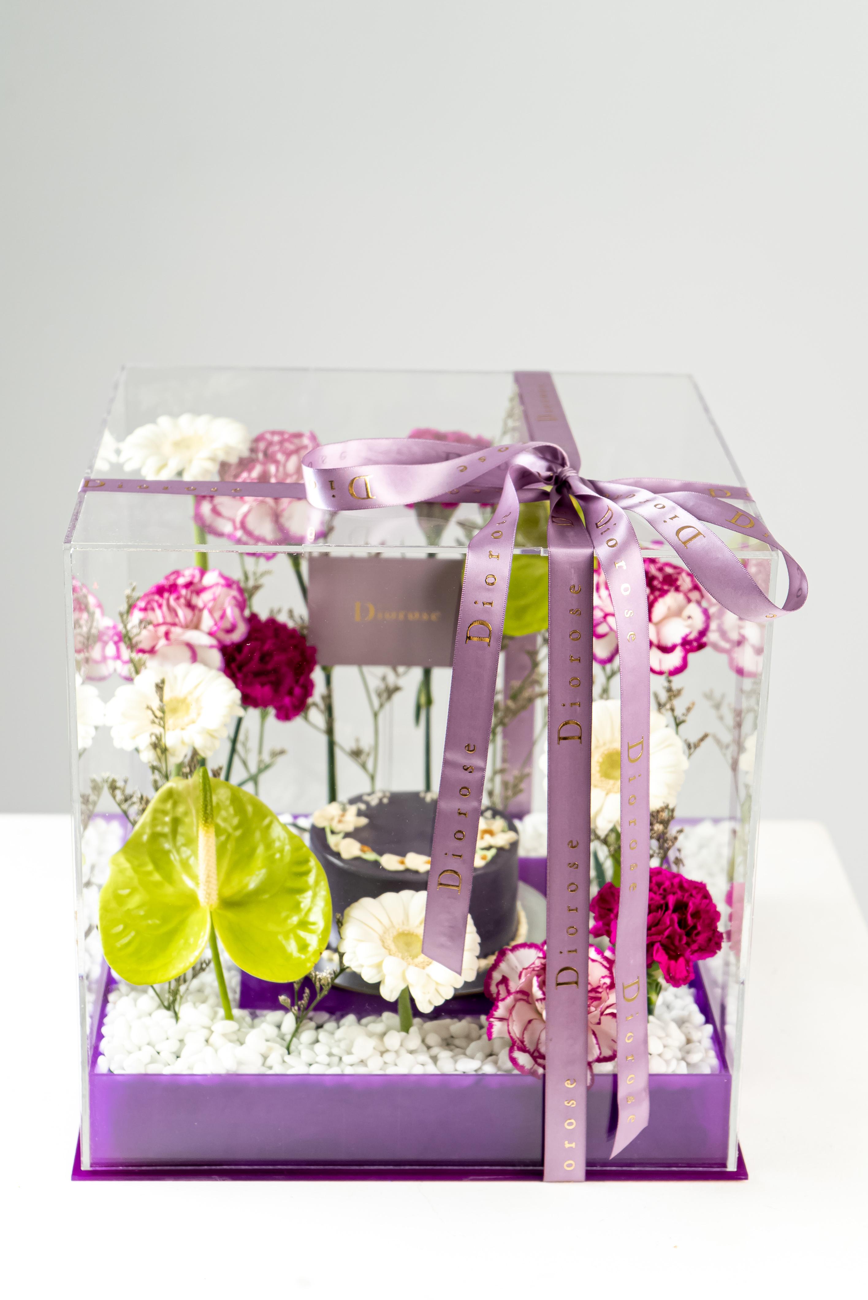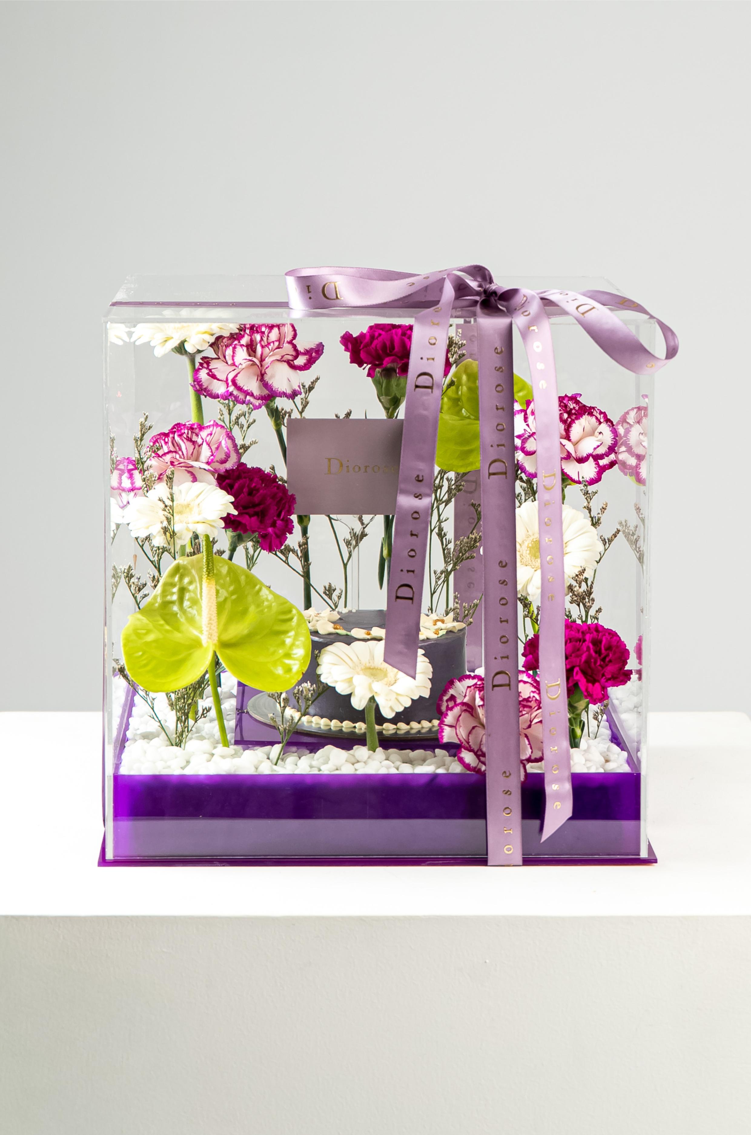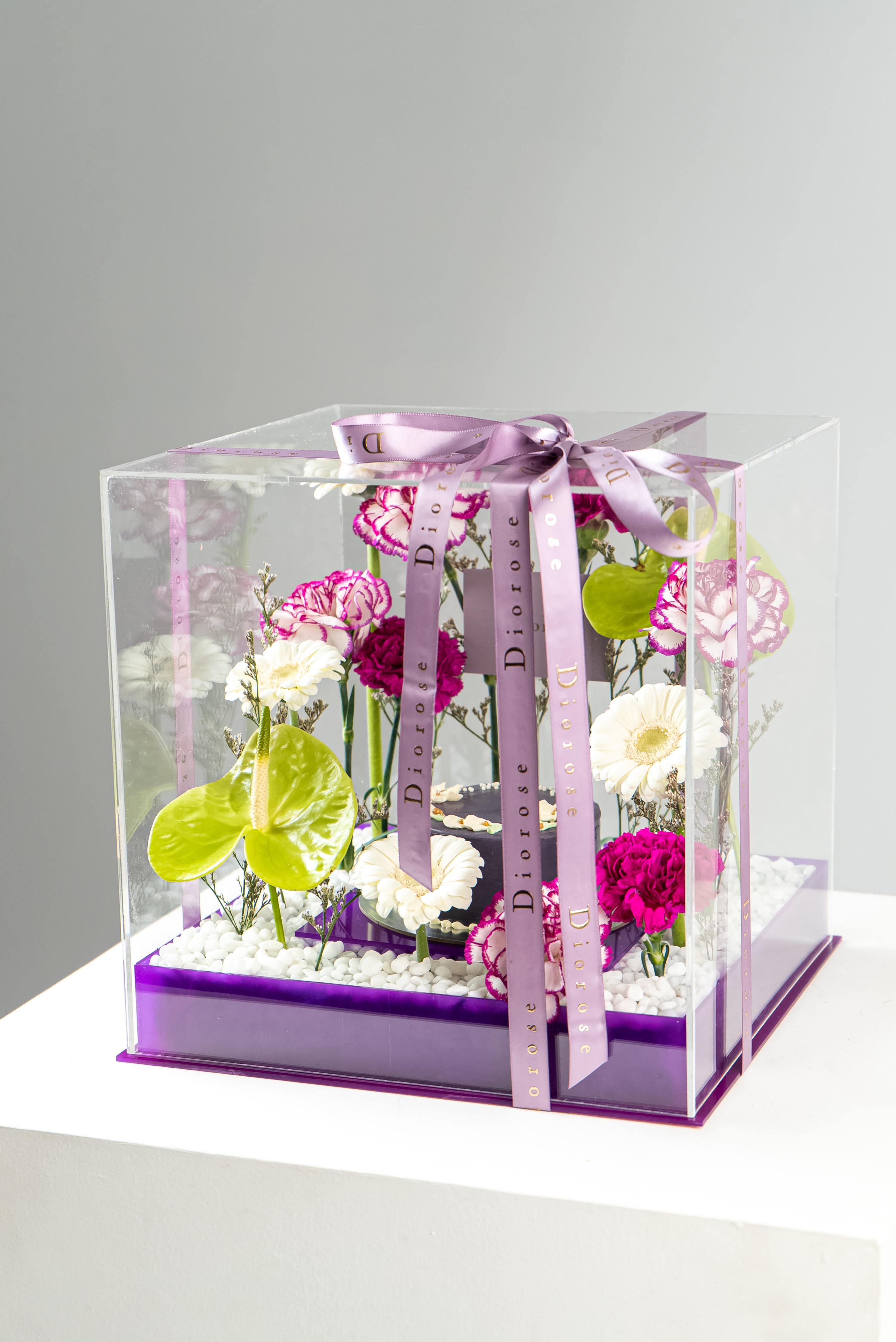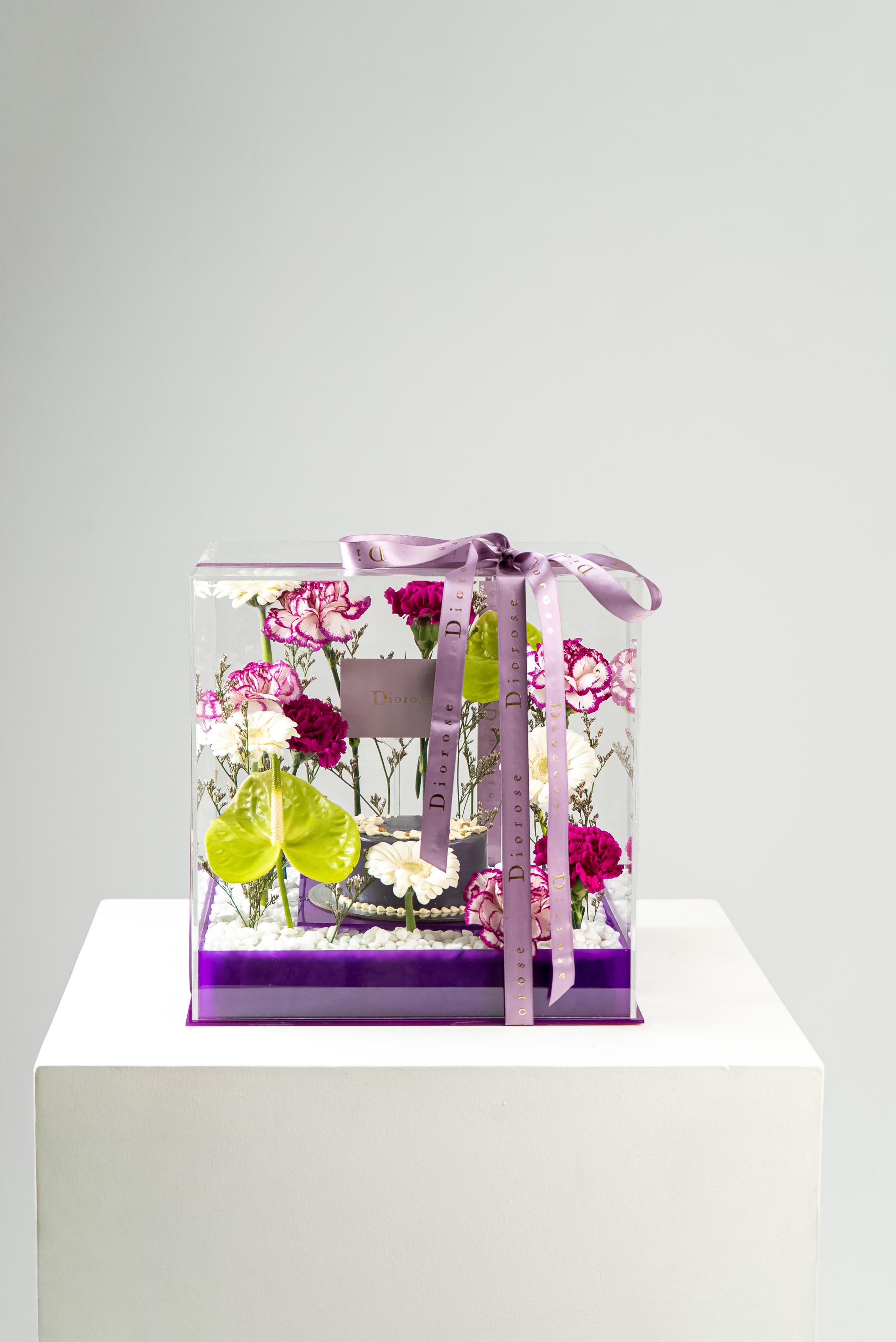ACRYLICA striking celebration of elegance and color, this luxurious arrangement is presented in a clear acrylic box with a rich purple acrylic base. At its heart sits a beautifully crafted purple cake, surrounded by a refined floral composition. Green anthuriums add a bold, modern accent, while white gerberas bring softness and balance. Layers of purple carnations and double-color purple carnations create depth and texture, complemented by delicate purple limonium. Finished with white decorative stones, this arrangement is perfect for birthdays, anniversaries, and sophisticated celebrations.