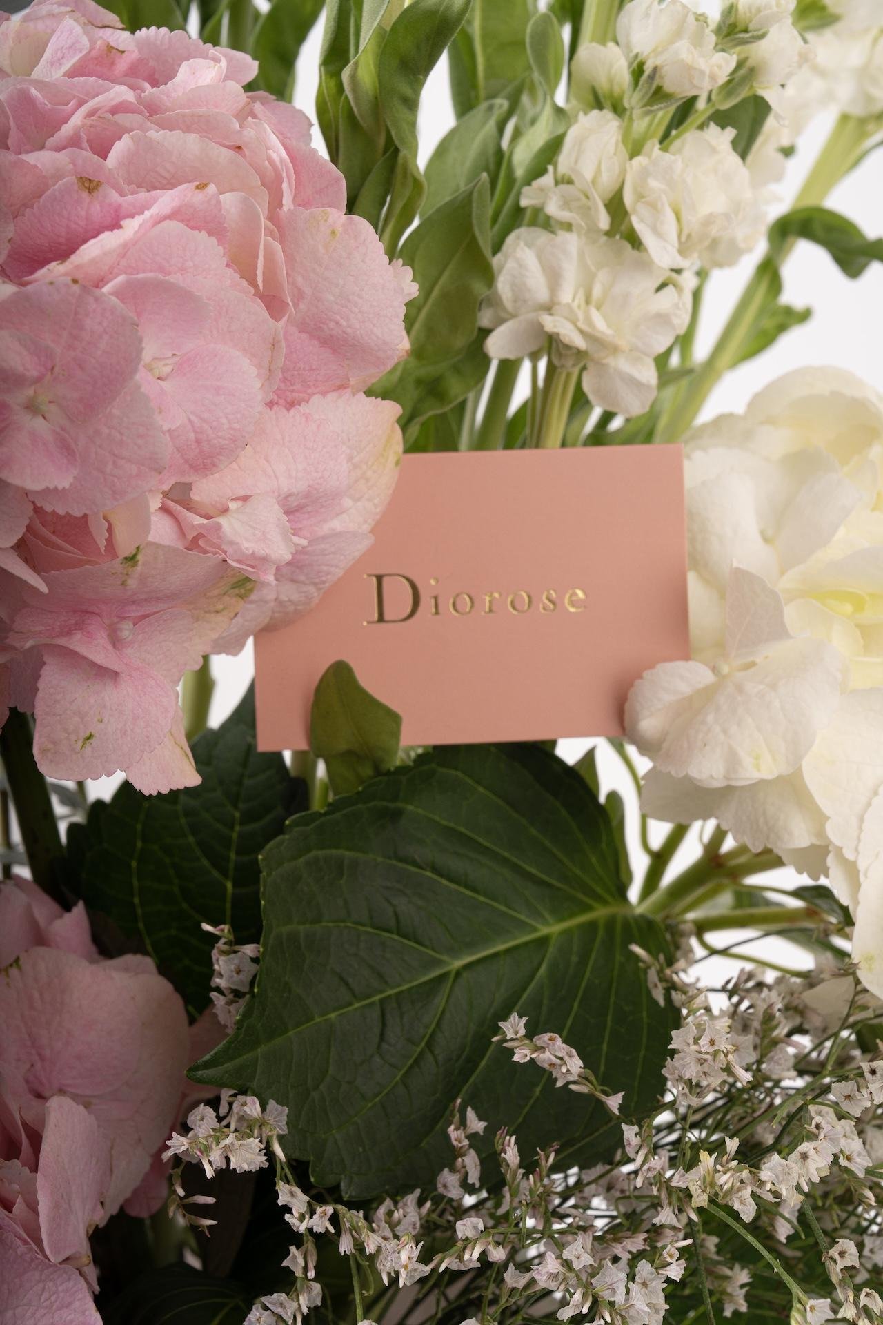 VASESElevate any space with soft luxury and timeless beauty. This elegant arrangement features a blend of light pink and ice white hydrangeas, paired with delicate matthiola, limonium, and fresh eucalyptus, all styled in a luxury pink glass vase that adds a modern, feminine touch.