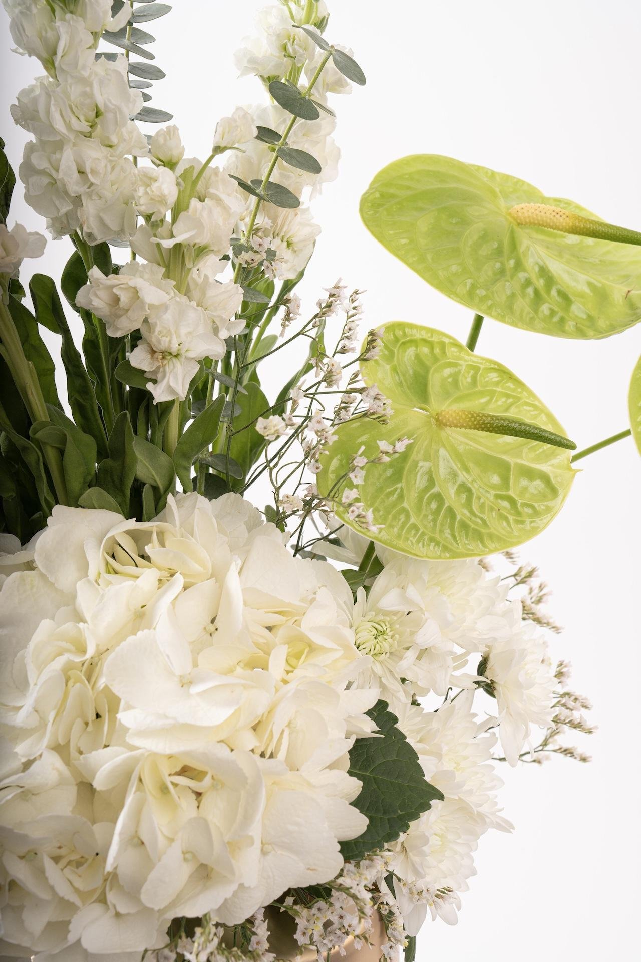 VASESA refined blend of freshness and sophistication. This striking arrangement features ice white hydrangeas, green anthurium, matthiola, white chrysanthemums, and eucalyptus — all beautifully styled in a fancy gold vase that adds a touch of modern luxury.