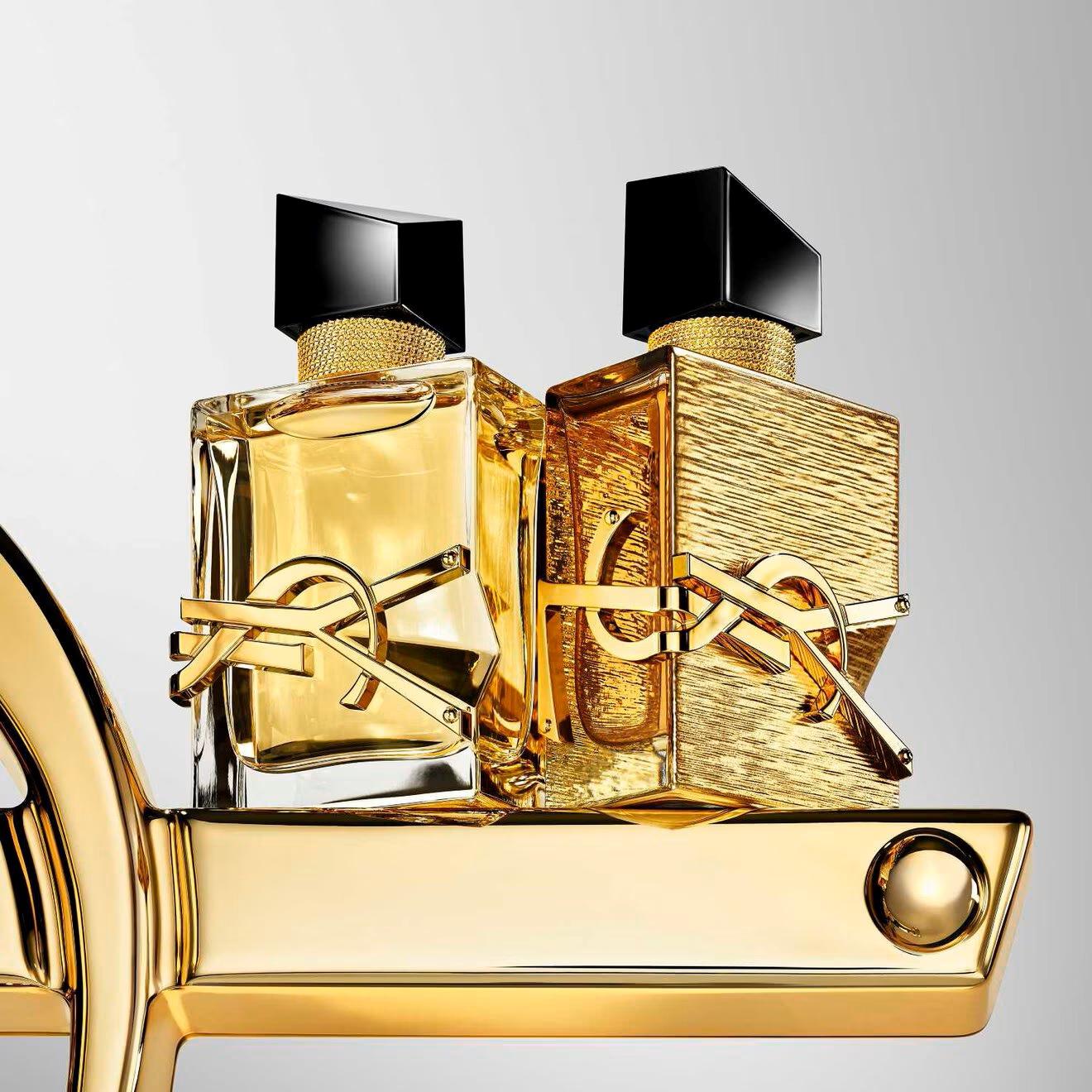 The iconic Libre bottle is transformed into a precious untamed jewel dressed inside and out with gold. Outside, its sharp, geometric silhouette, is enveloped in richly textured metallic gold, inspired by the Saint Laurent wardrobe. The daring open sides reveal a glimpse of a new golden juice starring a vanilla caviar dipped in gold liquor—the very essence of freedom. An audacious yet ultra-feminine couture object, reflecting bold sophistication and warm sensuality.