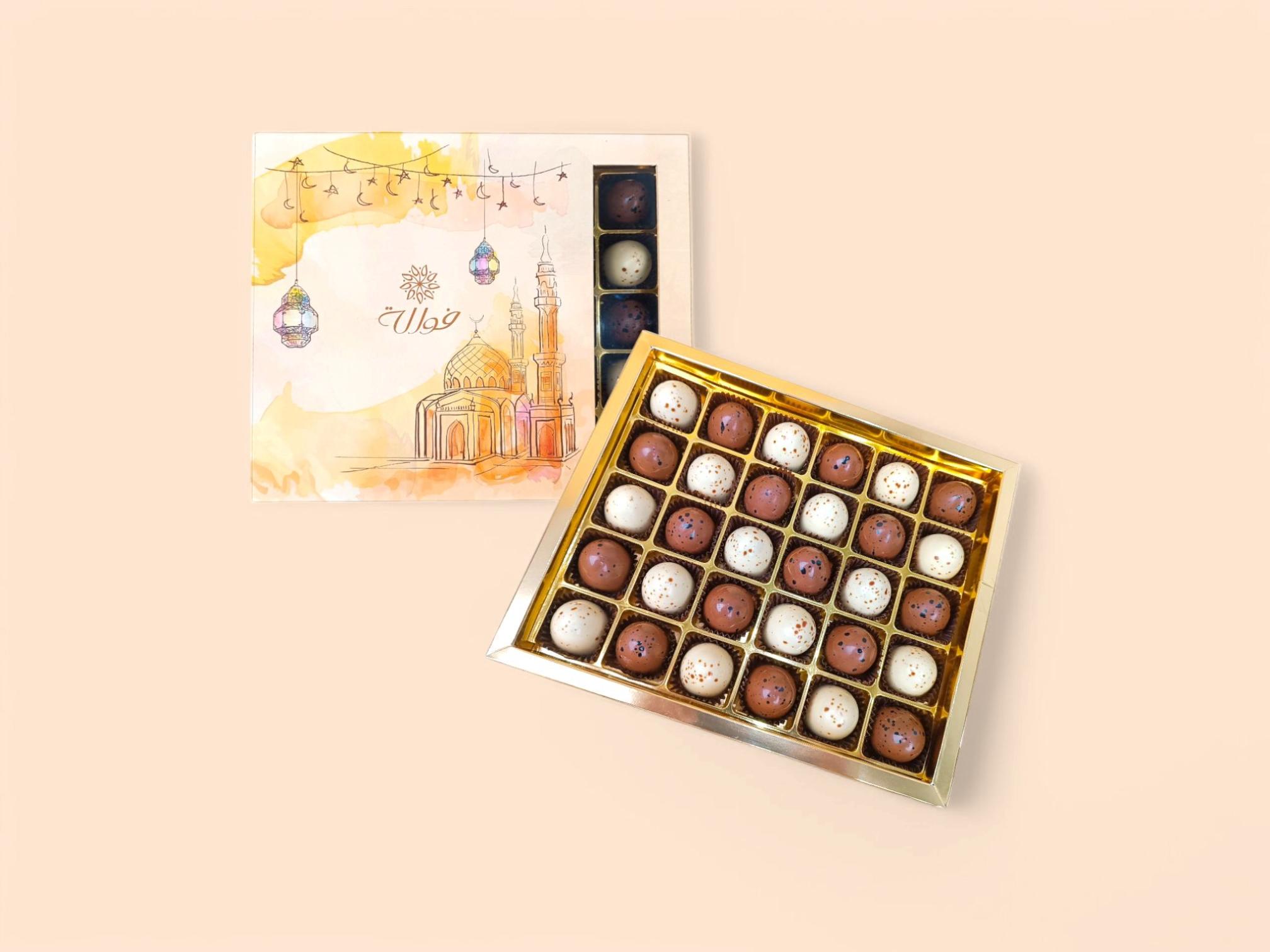 "٣٠ قطعة شوكولاتة بنكهات متنوعة، محشوة بكريمة الفستق مع ويفر وكريمة البندق مع ويفر… مقدمة في علبة خاصة بتصميم ٥×٦."