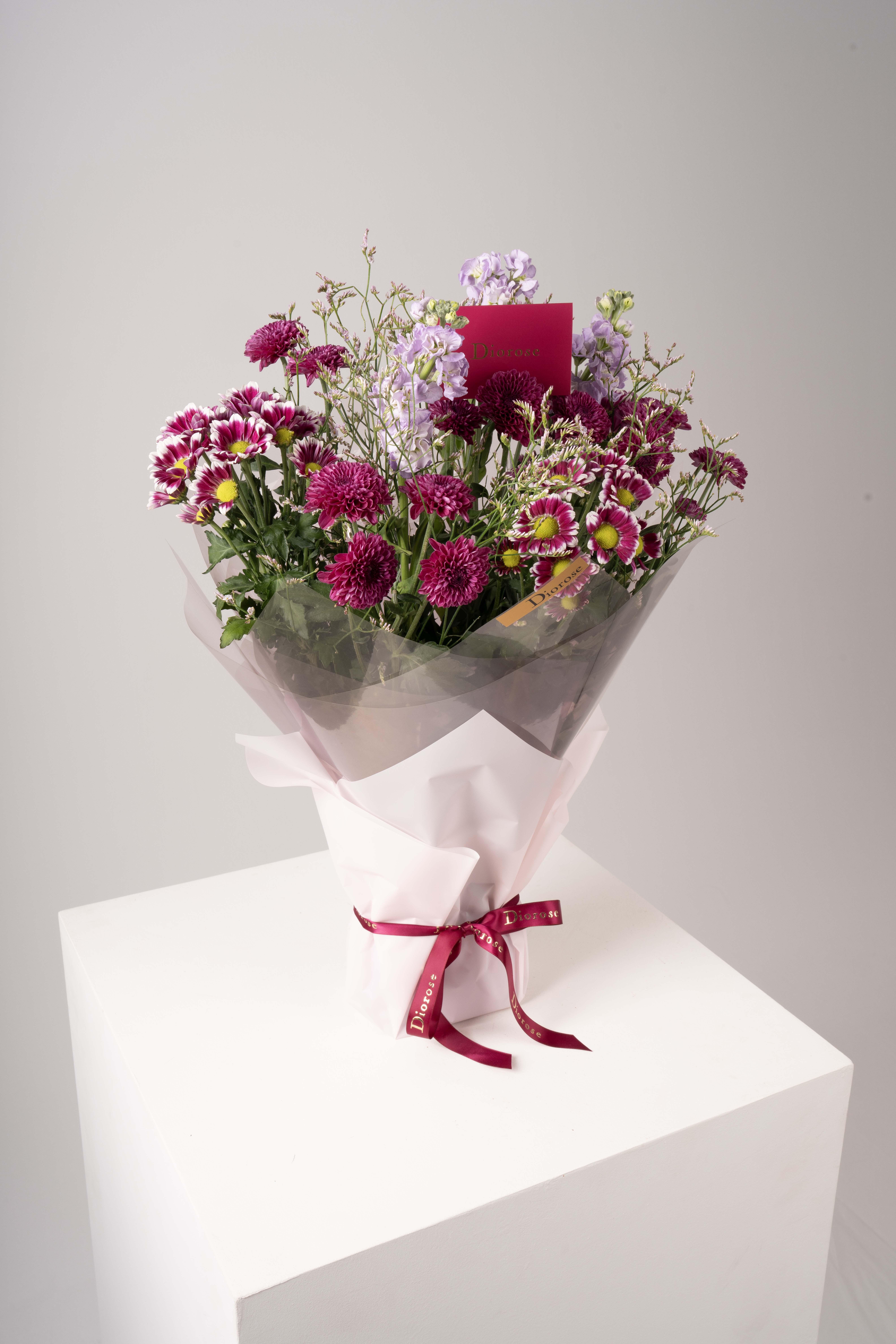 باقة يدتنسيق راقٍ يجمع بين ماتيلولا بنفسجية، وأزرار أقحوان بنفسجي غامق، وأقحوان صغير مزدوج بنفسجي، مع لمسة من ليمونيوم وردي ناعم. ملفوف بورق وردي أنيق يمنح الباقة طابعًا راقيًا وفخمًا، مثالية للاحتفال بأي مناسبة خاصة بأسلوب أنيق وراقي.