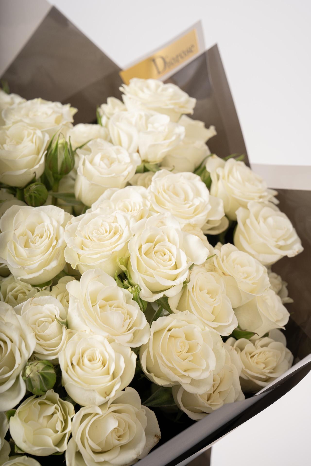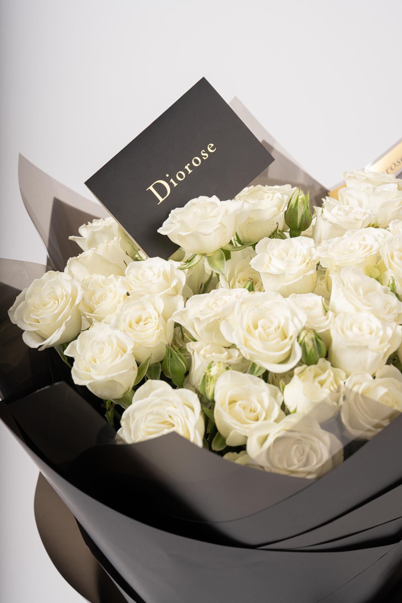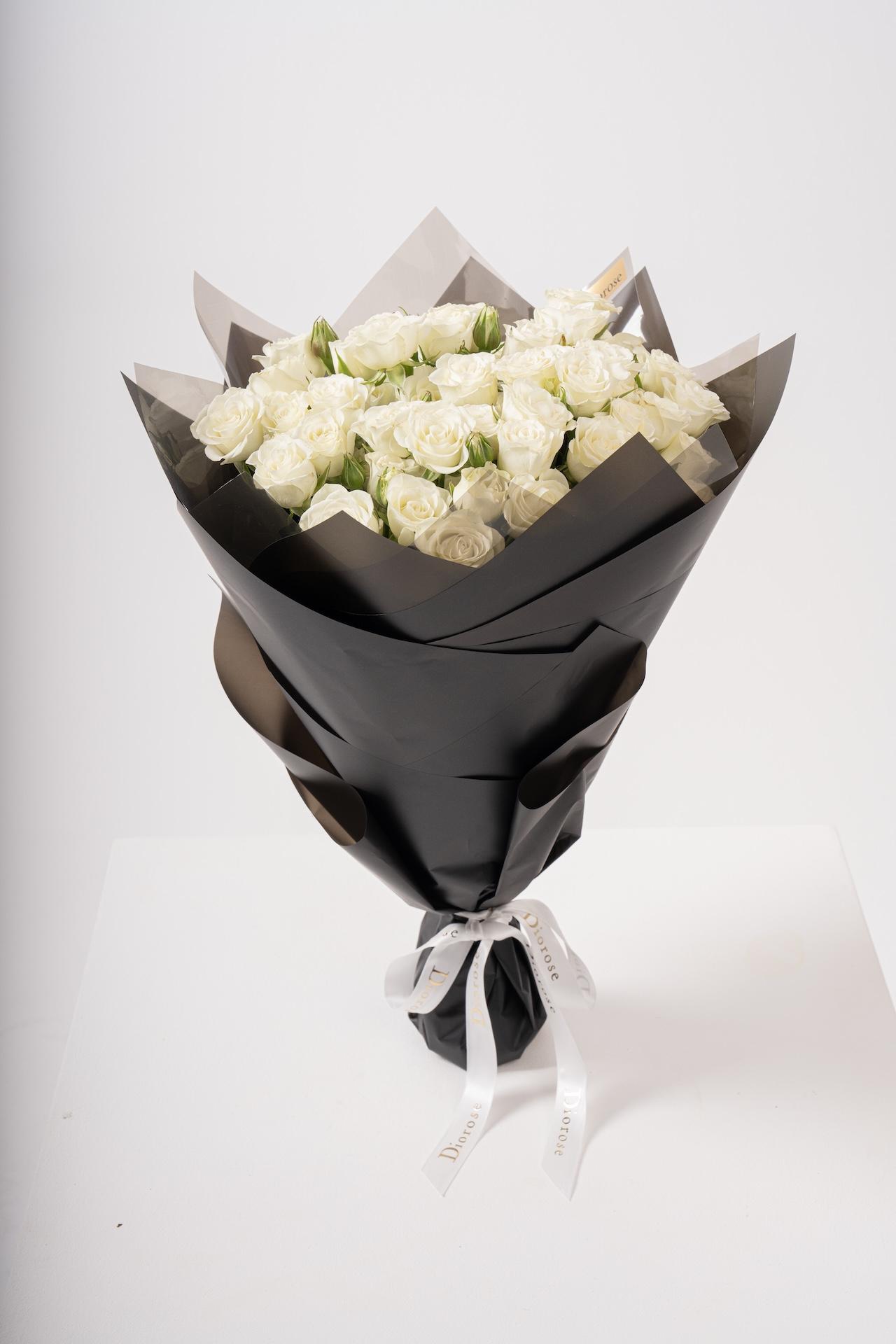 مزيج الأبيض الكلاسيكي مع التغليف الأسود يمنح هذه الباقة حضوراً مميزاً لا يُقاوم، ما يجعلها الخيار المثالي لمن يقدّر الجمال الهادئ والأنوثة الفاخرة.