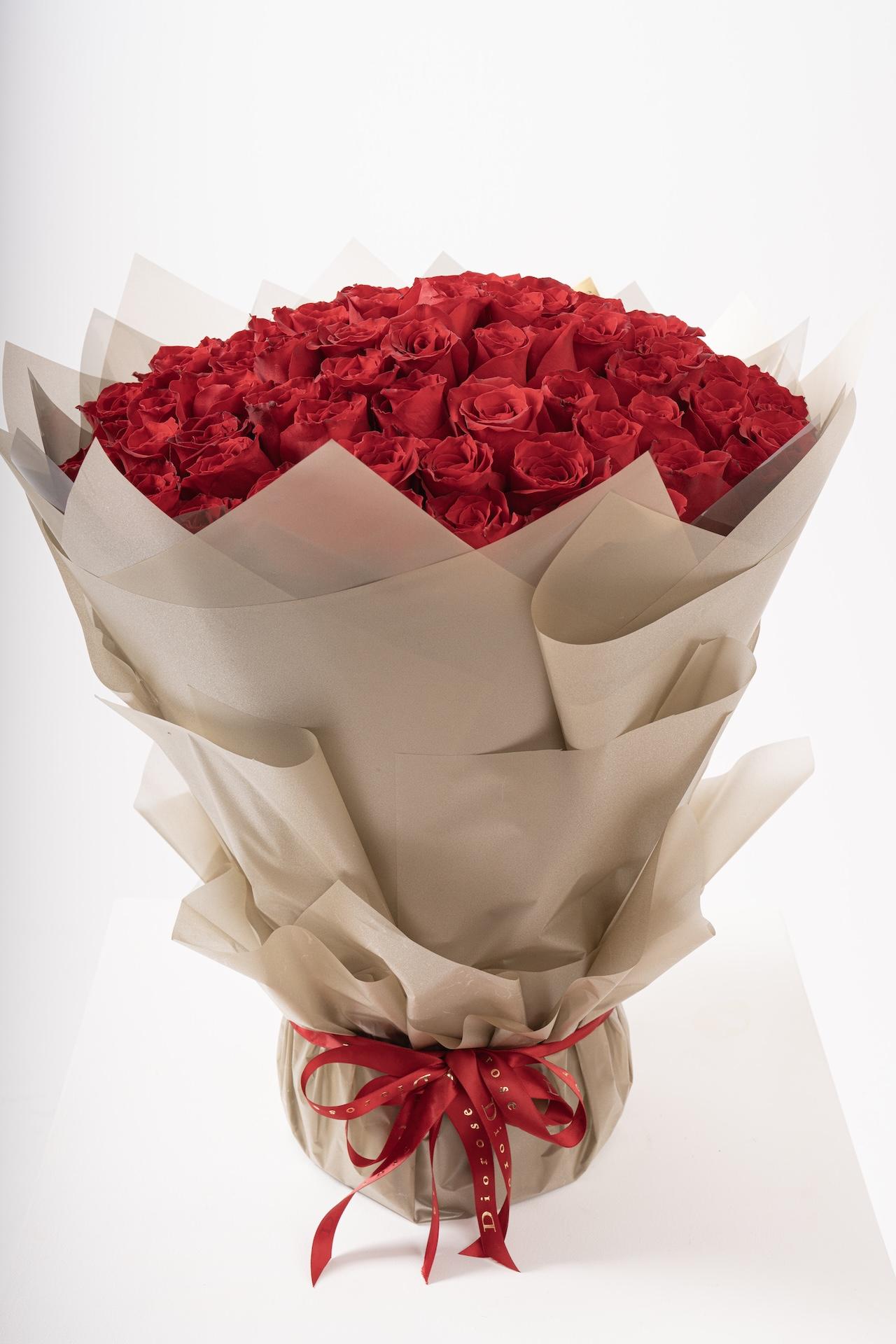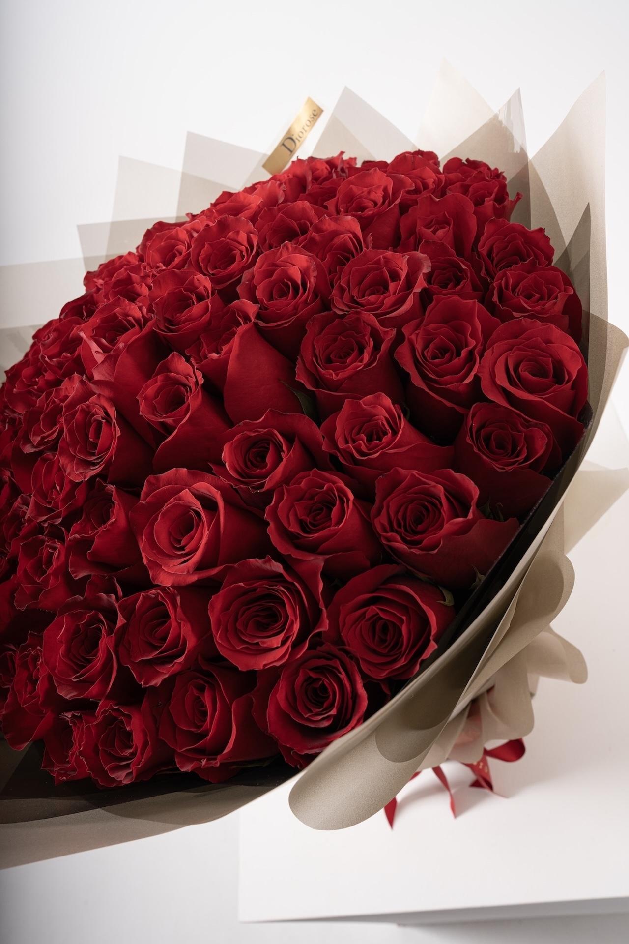 HAND BOUQUETCelebrate love and affection with our stunning 100 red roses bouquet, a symbol of passion and devotion. Handpicked for their vibrant color and perfect bloom, this bouquet is wrapped in your choice of premium wrapping. A beautiful and charming way to express your deepest feelings for someone special.