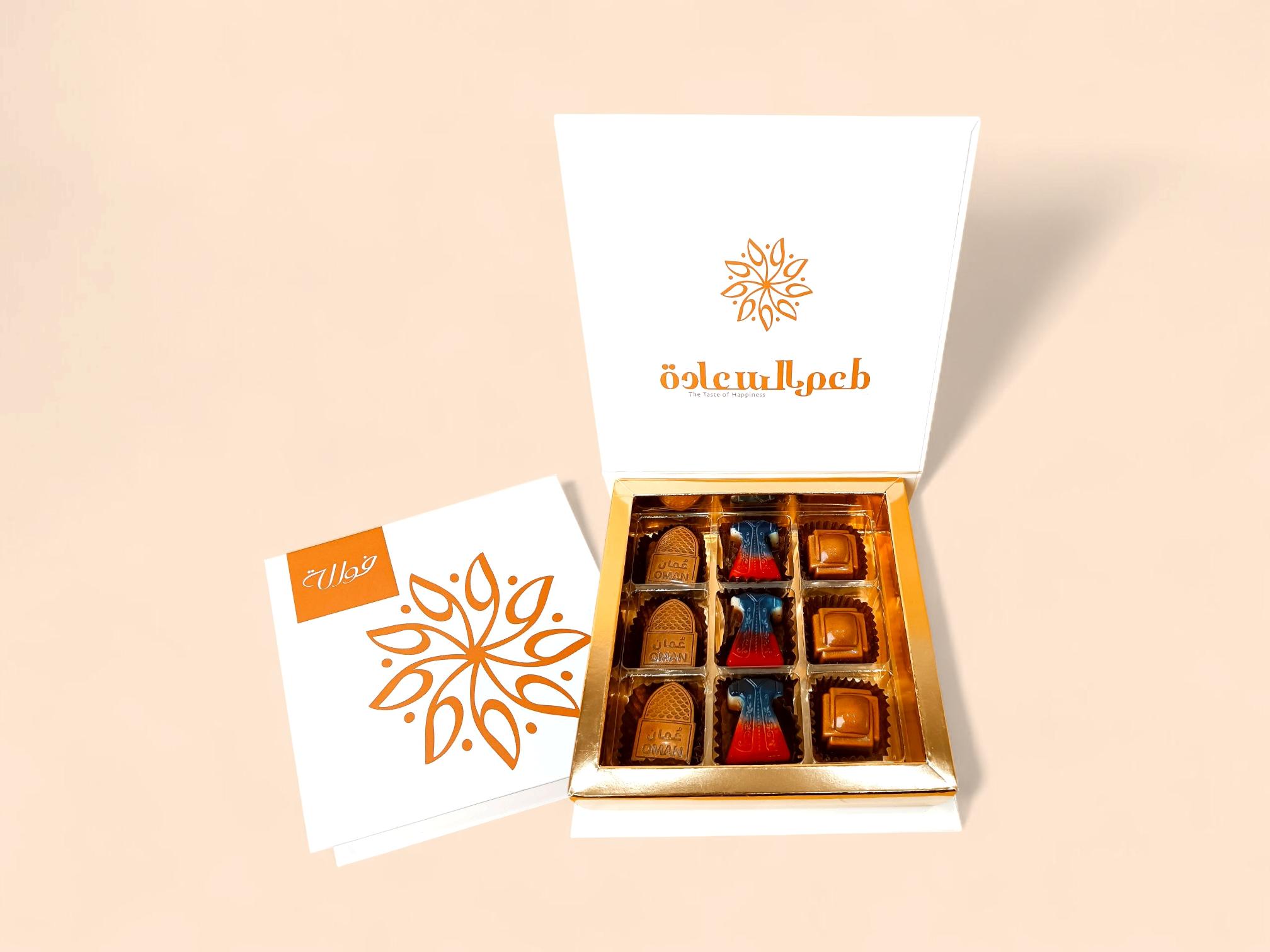 A selection of chocolates with distinctive Omani flavors such as Omani sweets, Omani chips, rose water, Omani dates, honey, cardamom, Omani frankincense, and more… presented in a small box containing 9 pieces of chocolate.