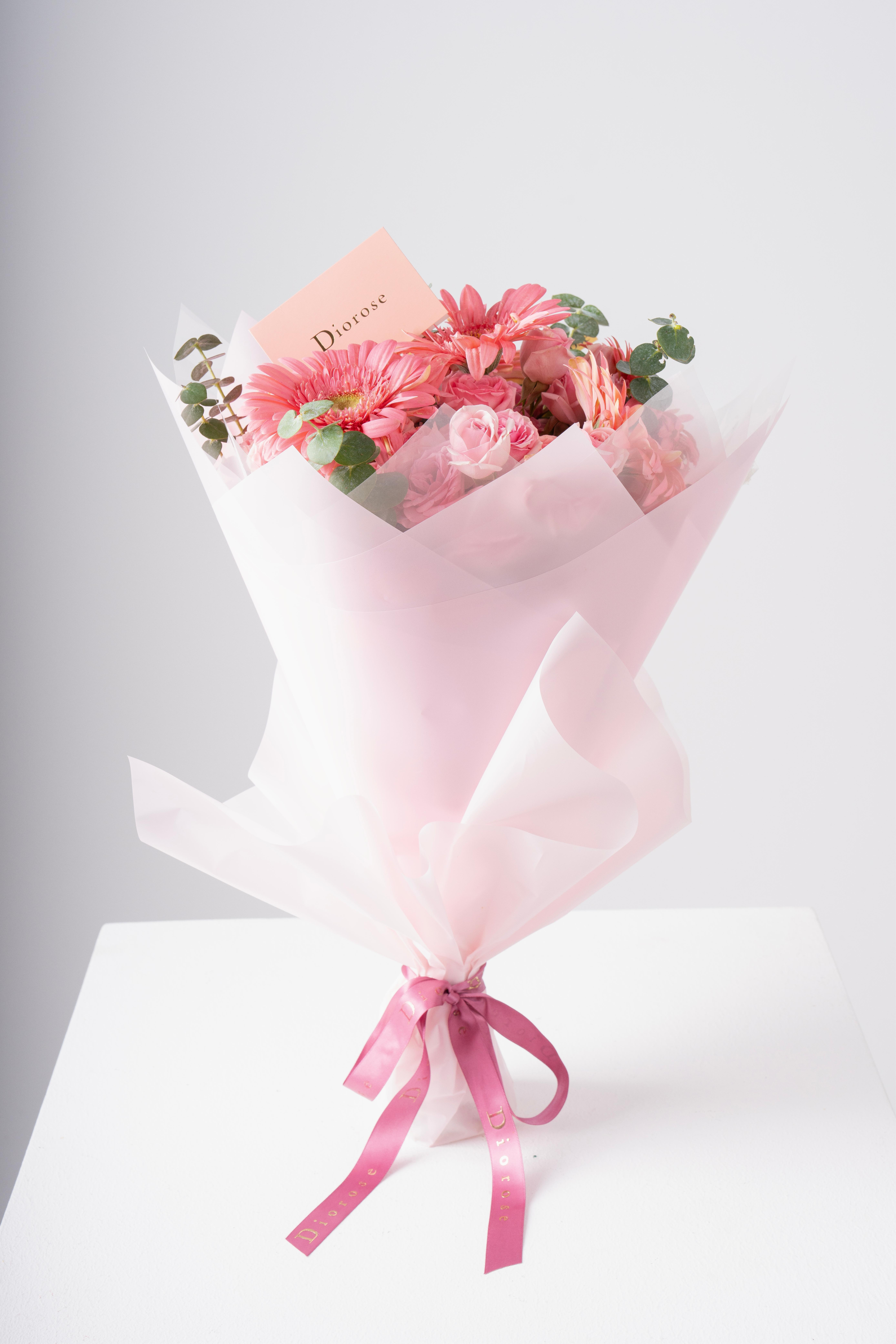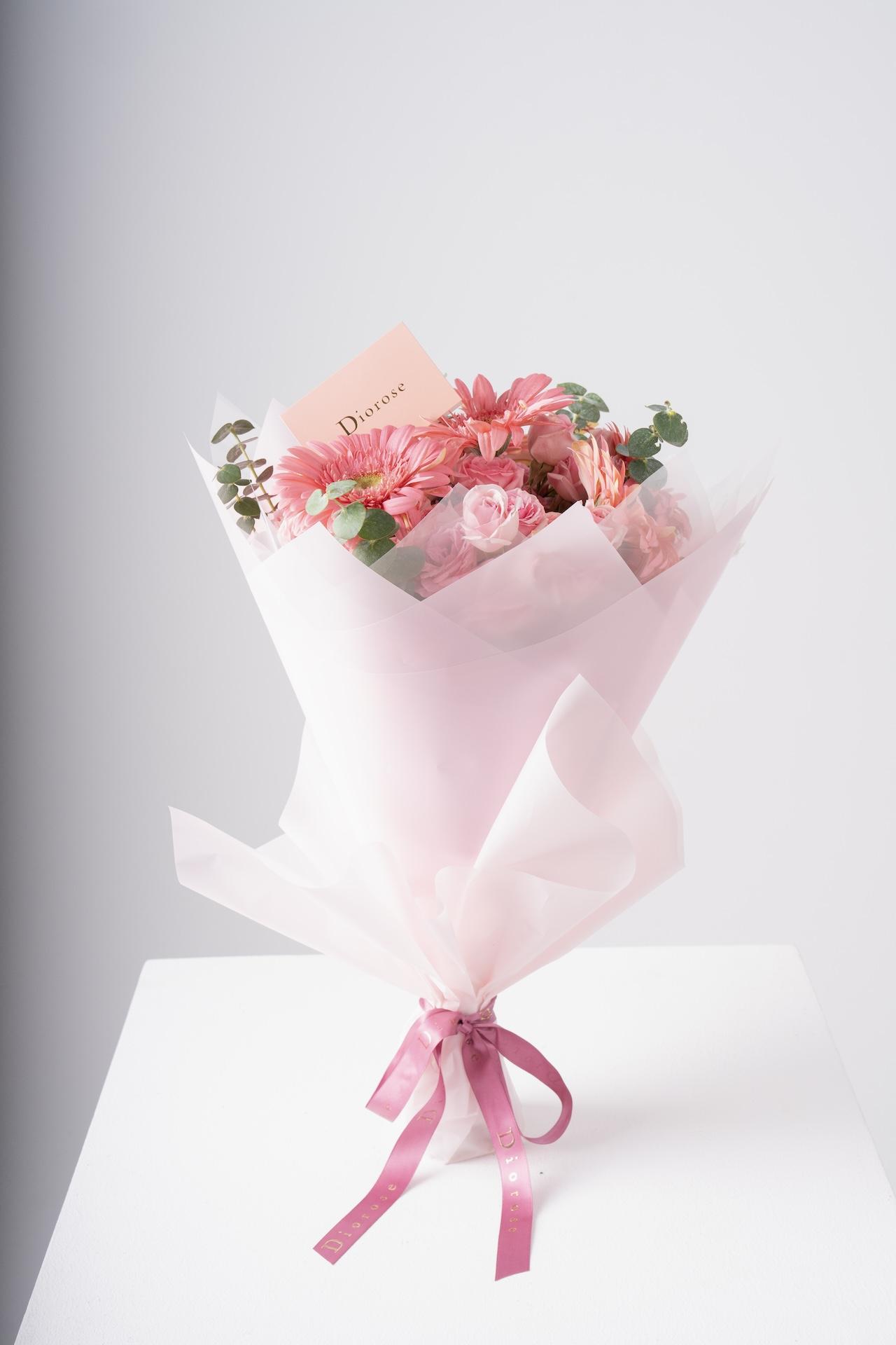 HAND BOUQUETA graceful hand bouquet combining the charm of soft pink Gerbera, the romance of dark pink baby roses, and the purity of snow white baby roses. Accented with refreshing blue eucalyptus and wrapped in delicate pink paper, this arrangement exudes elegance and warmth — perfect for expressing love, joy, or appreciation on any occasion.