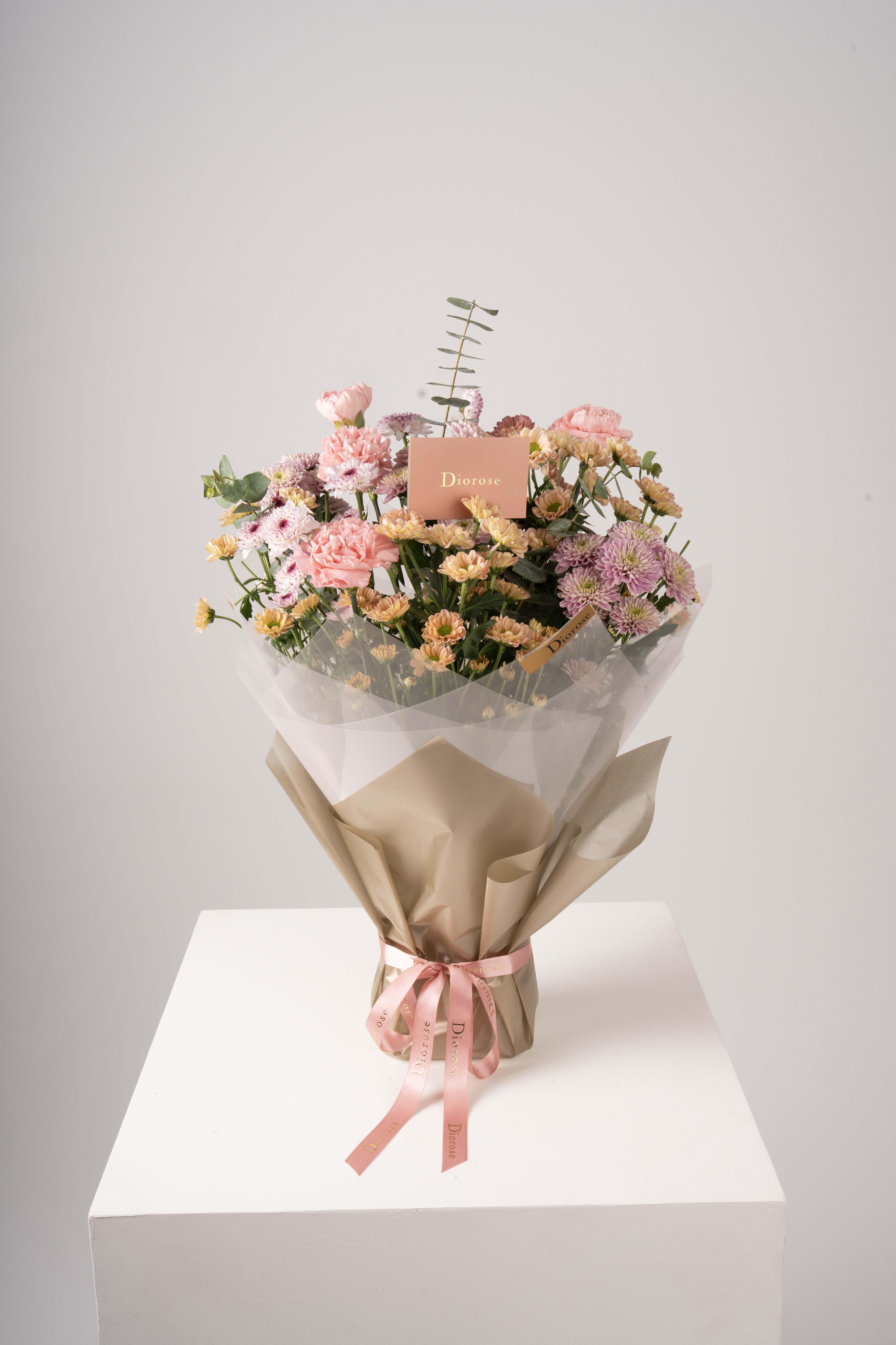 HAND BOUQUETA delicate blend of pink carnations, beige baby chrysanthemums, and light and dark purple button chrysanthemums, accented with fresh dollar eucalyptus. Wrapped in elegant gold paper, this bouquet radiates sophistication, charm, and timeless luxury — perfect for celebrating any special occasion with elegance.
