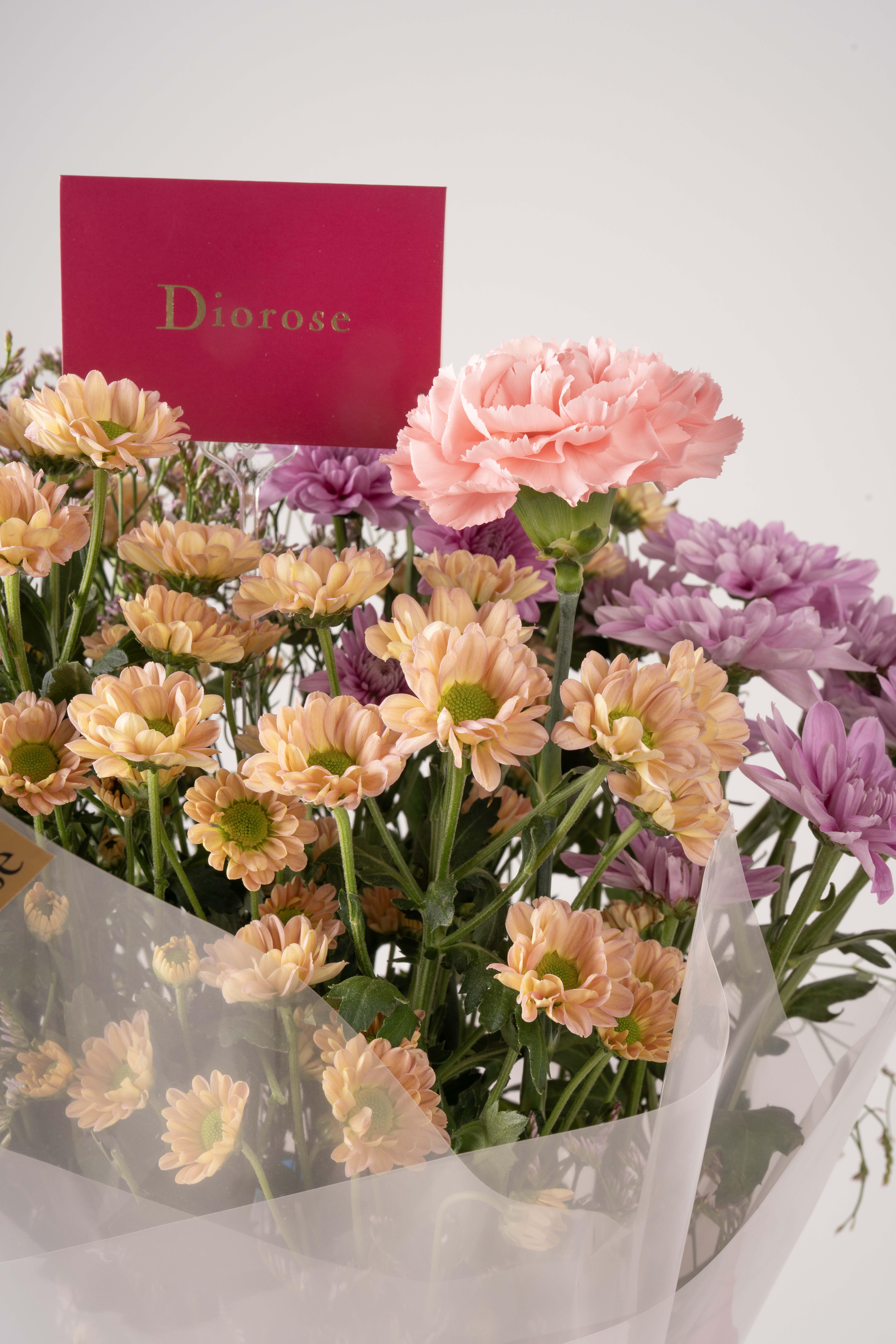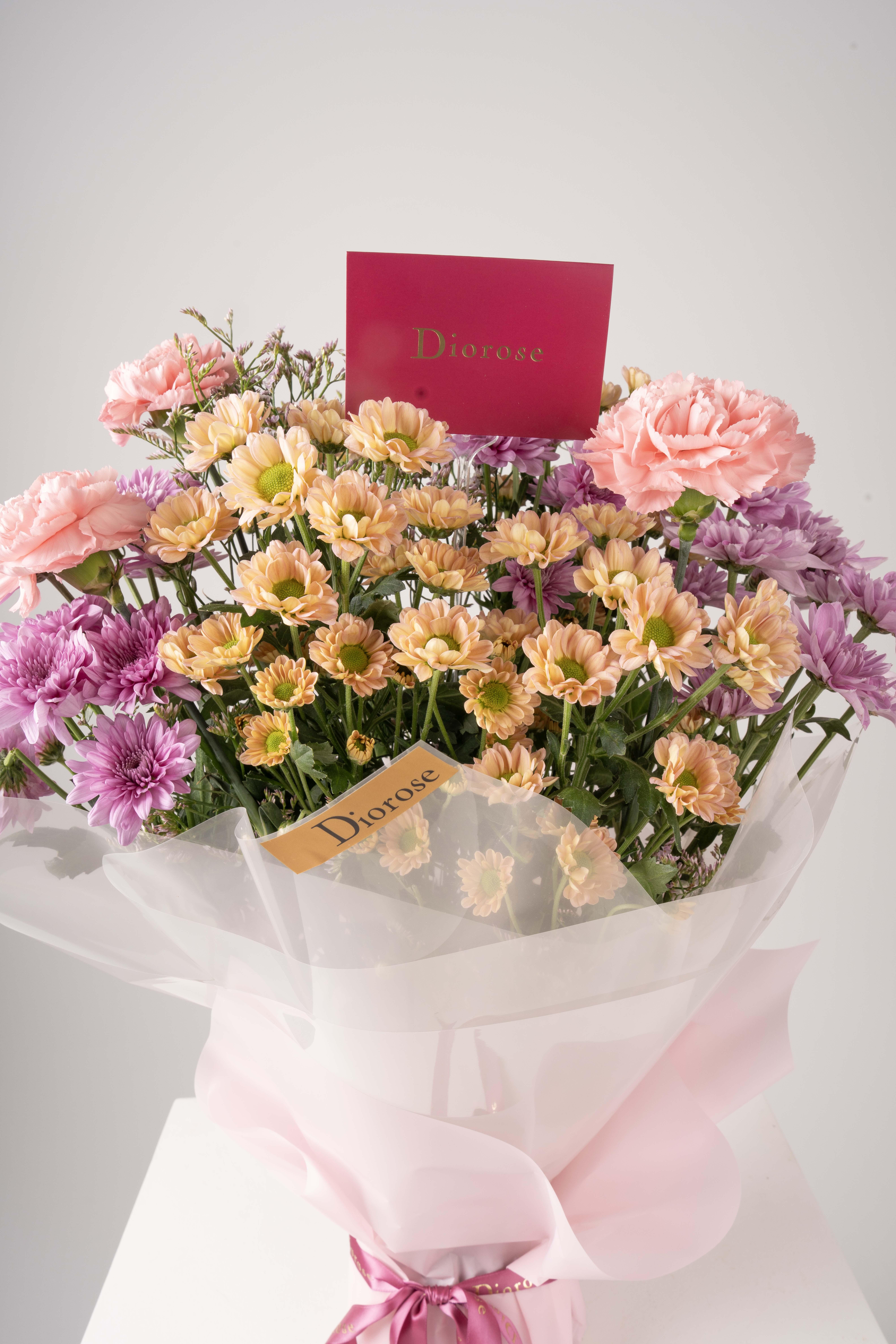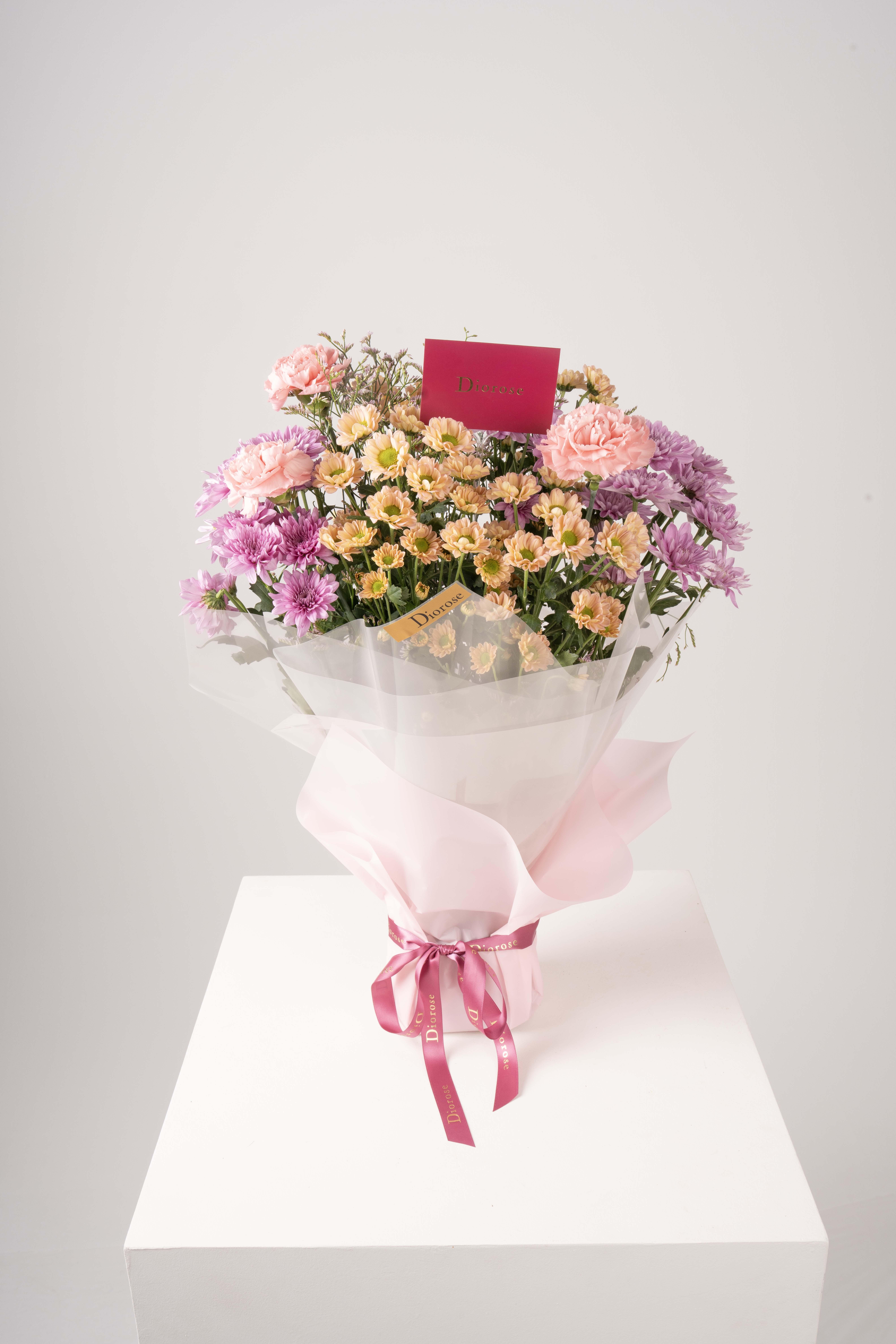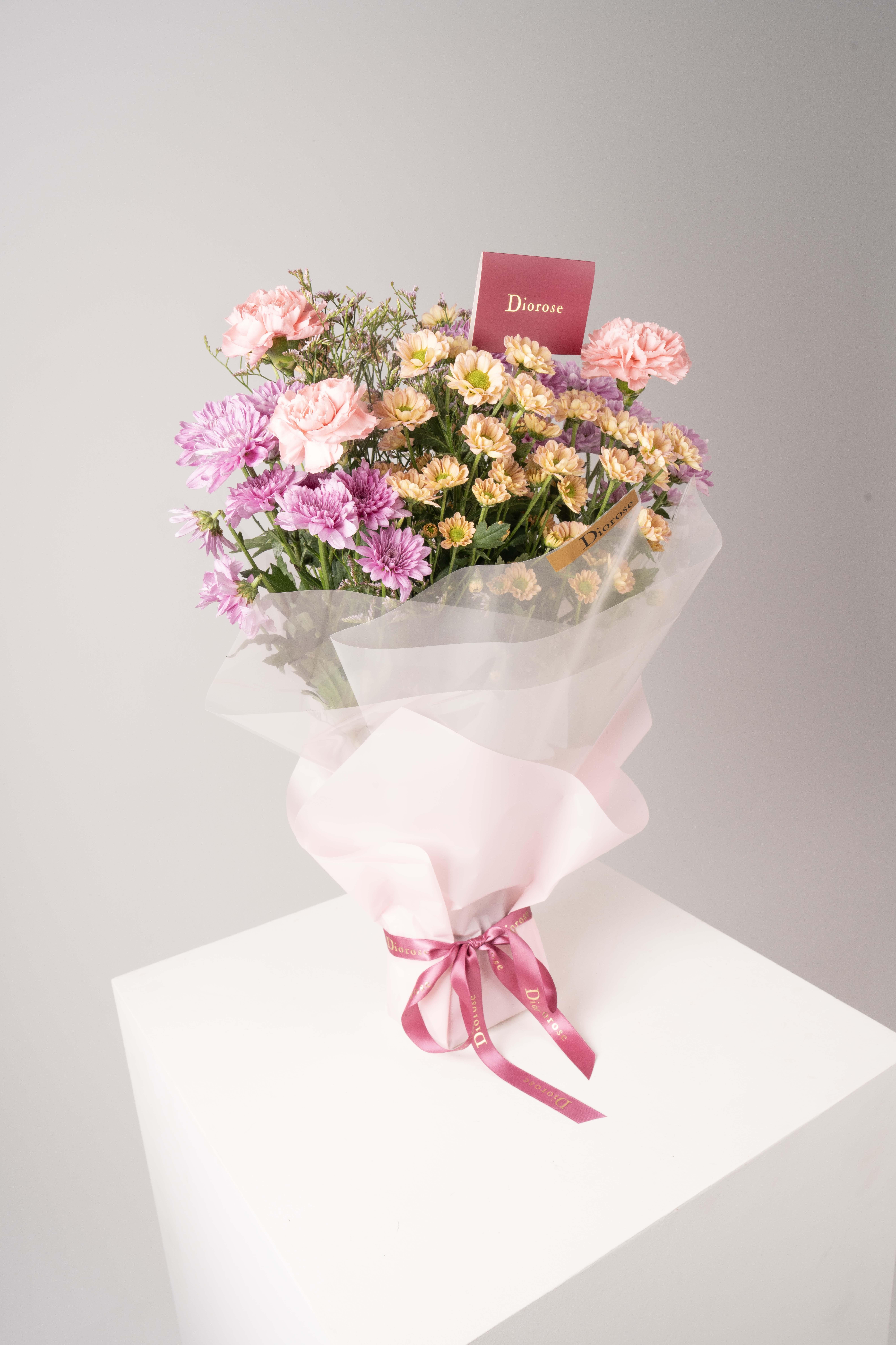 HAND BOUQUETA delicate arrangement of pink carnations, light purple chrysanthemums, beige baby chrysanthemums, and soft pink limonium. Wrapped in pink paper, this bouquet exudes grace, sophistication, and timeless luxury — perfect for brightening any special occasion.