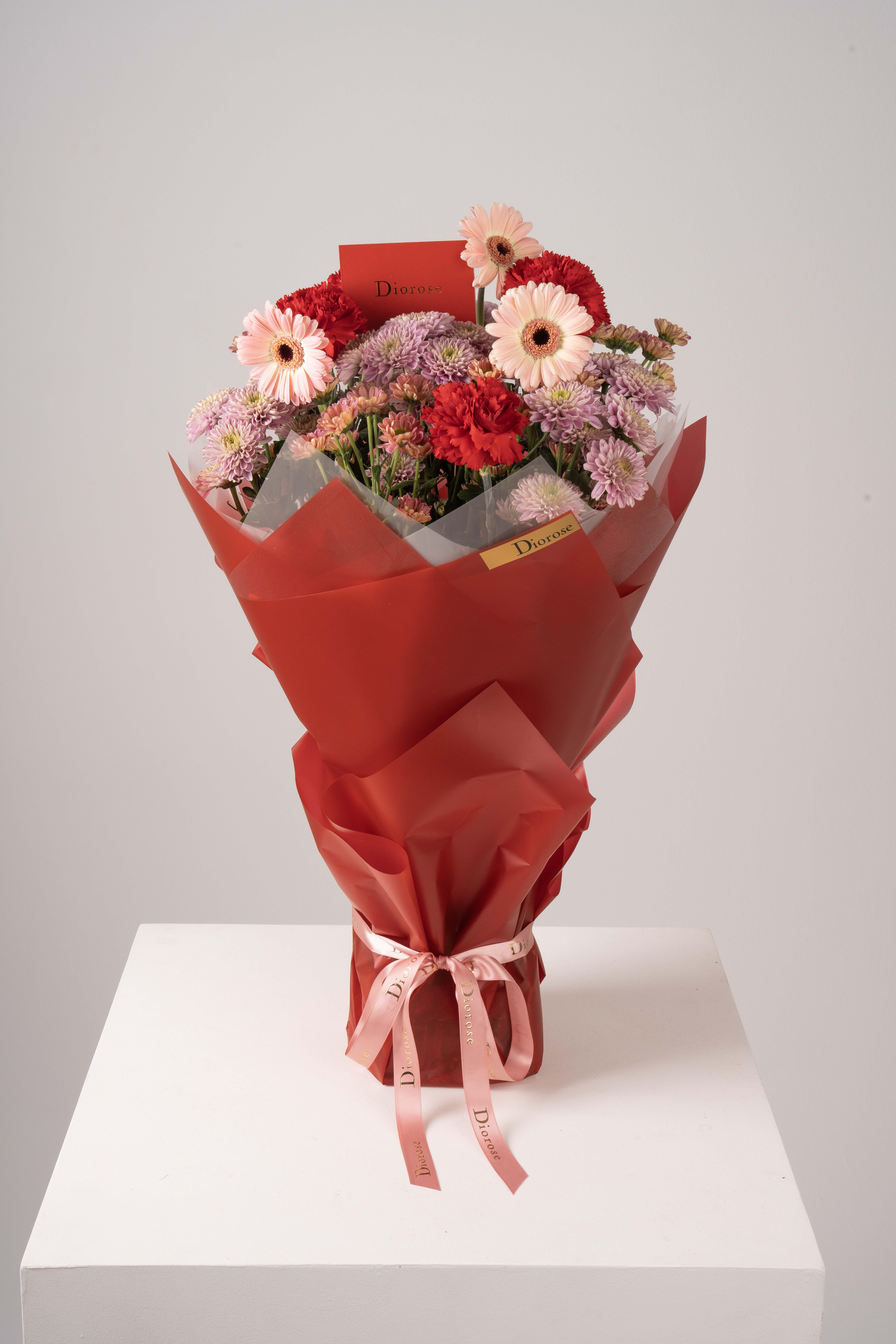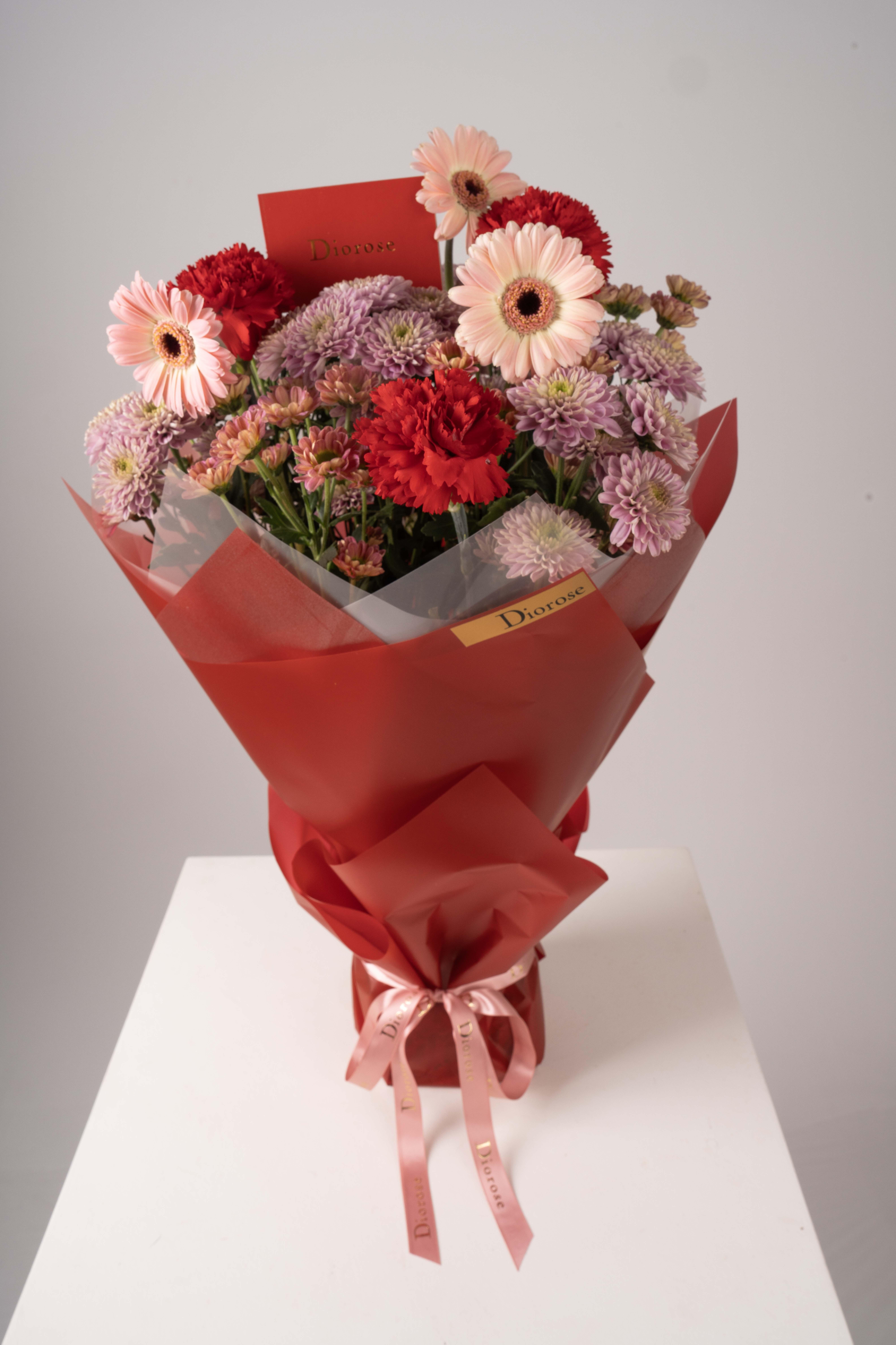 HAND BOUQUETA vibrant and elegant mix of red carnations, soft pink gerberas, delicate light purple button chrysanthemums, and charming beige baby chrysanthemums. Wrapped beautifully in red paper, this hand bouquet exudes sophistication, warmth, and timeless luxury — perfect for making any occasion memorable.
