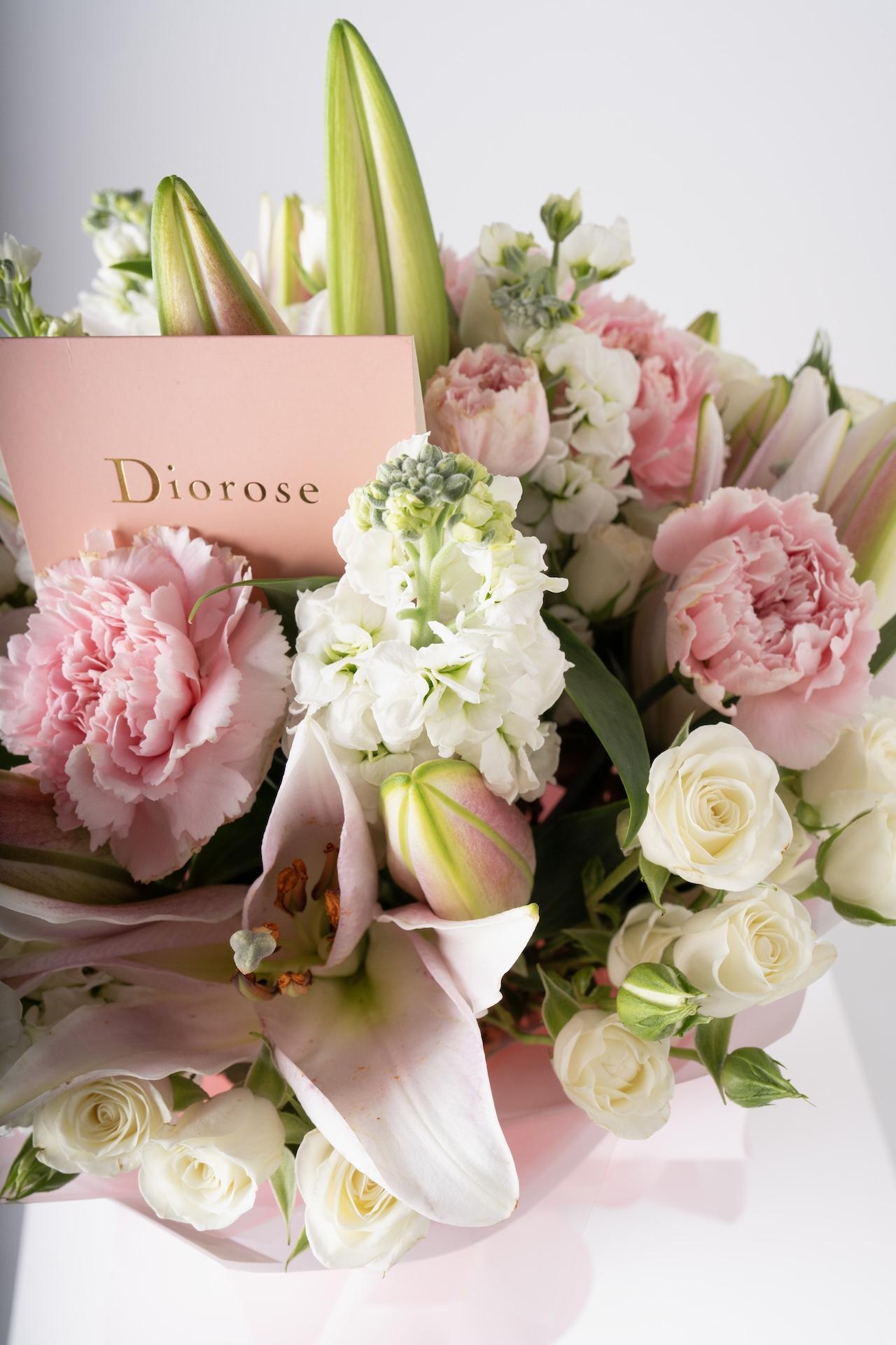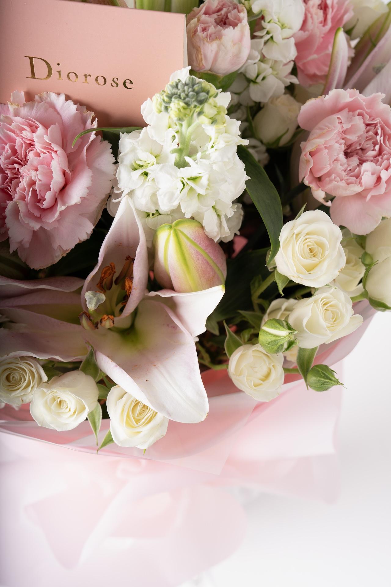 HAND BOUQUETThis beautiful bouquet features lilies, pink carnations, snow white spray roses, and pink matthiola, wrapped in your choice of pink or white wrapping. The soft, delicate blend of pink and white blooms creates an elegant, timeless arrangement that’s perfect for any occasion or as a thoughtful gift.