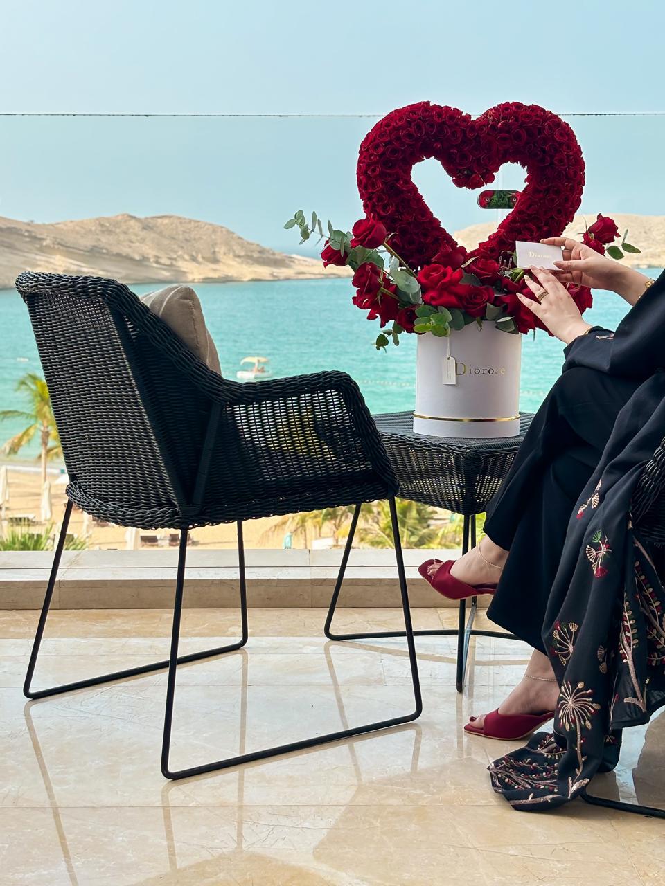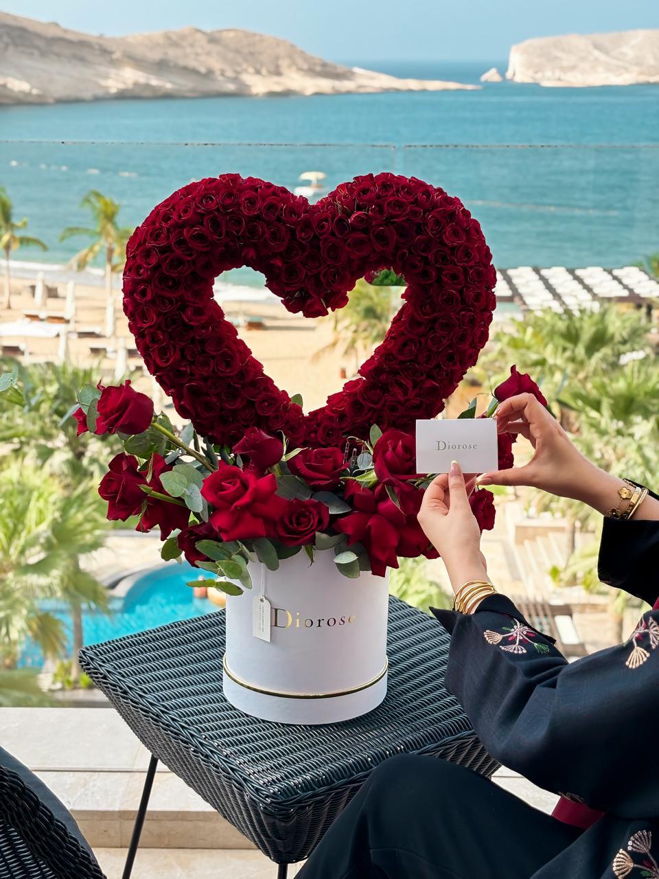 Set in our signature round Diorose box, this romantic piece radiates elegance and passion. The deep red hues, accented by soft greenery, symbolize devotion, romance, and lasting affection. Whether gifted for a special someone or used to mark a meaningful occasion, this arrangement turns emotions into art.