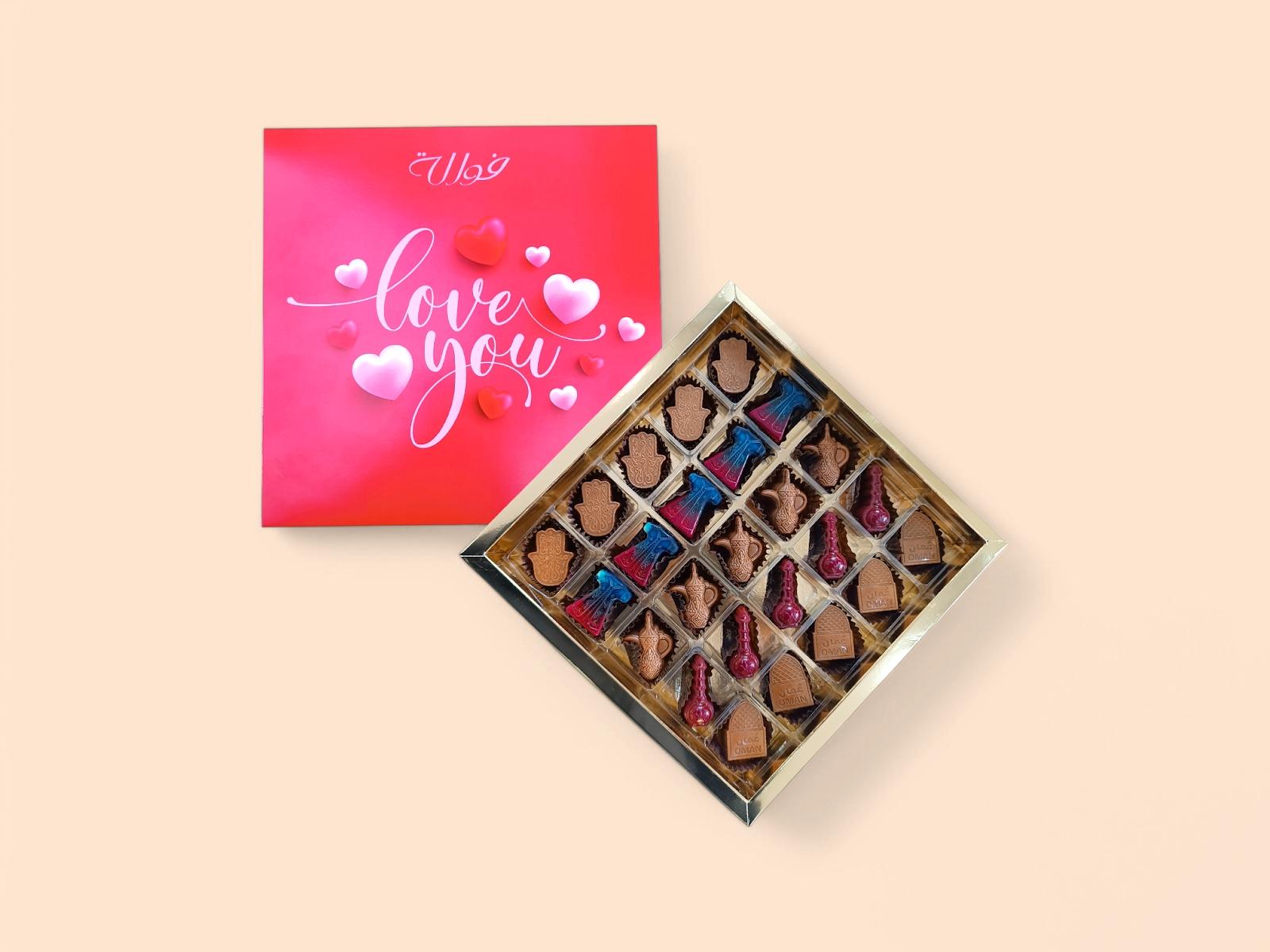 25 pieces assorted flavors chocolates with Omani delicacy such as Omani Coffee, Luban, Rose Water, Halwa and many more, inside, on a box designed to share love on Valentines day.