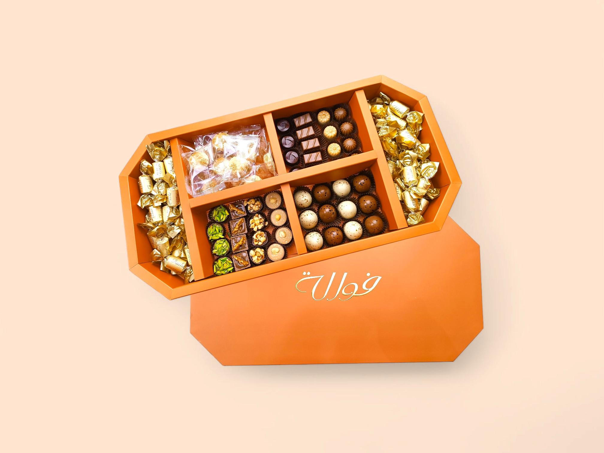 A large box containing a special selection of Fawalh's finest products, including chocolate-covered cornflakes, egg-shaped chocolates, chocolates with and without nuts, and delicious traditional sweets… all presented in an elegant orange box.