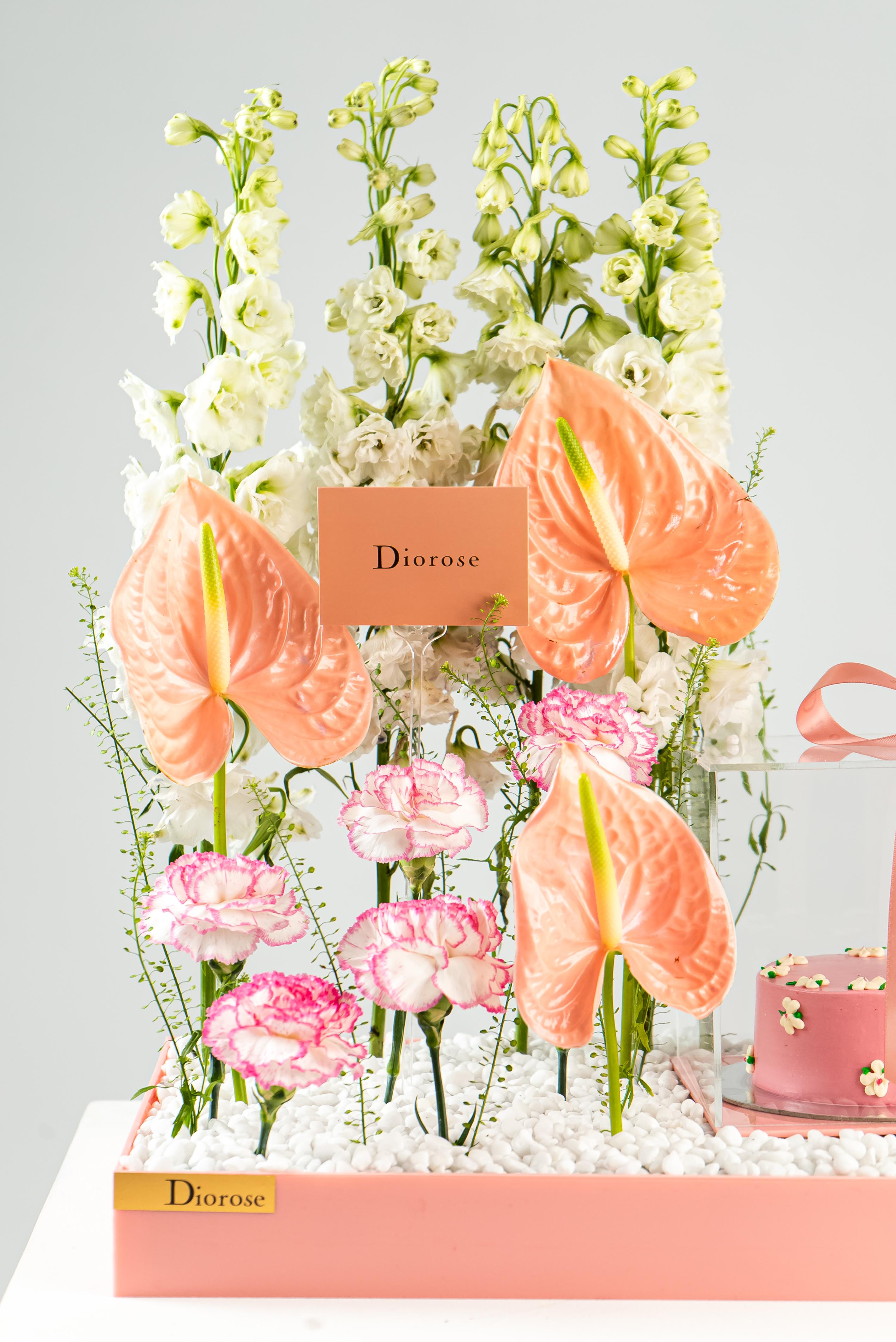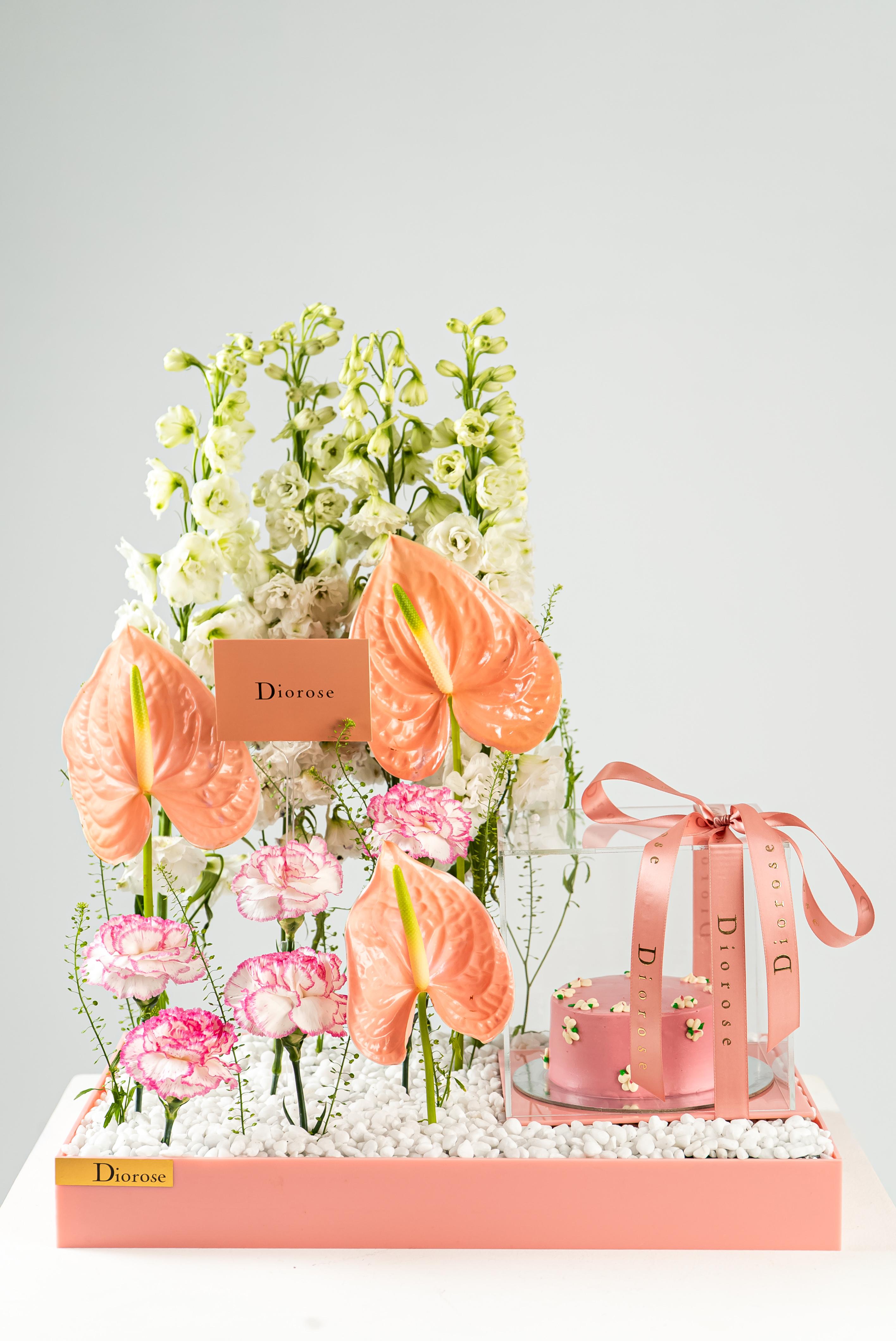 ACRYLICCelebrate beauty and sweetness with this exquisite pink acrylic tray, thoughtfully designed to delight the senses. A graceful arrangement of white Delphinium, soft pink Carnation, vibrant green Anthurium, and delicate Lipidium creates a harmonious floral display that radiates freshness and elegance. Nestled beside the blooms is a pink cake, perfectly encased in a transparent acrylic box, showcasing its charming detail while keeping it pristine. This stunning ensemble is ideal for gifting on birthdays, anniversaries, or any special moment—where flowers and sweetness come together in perfect harmony.