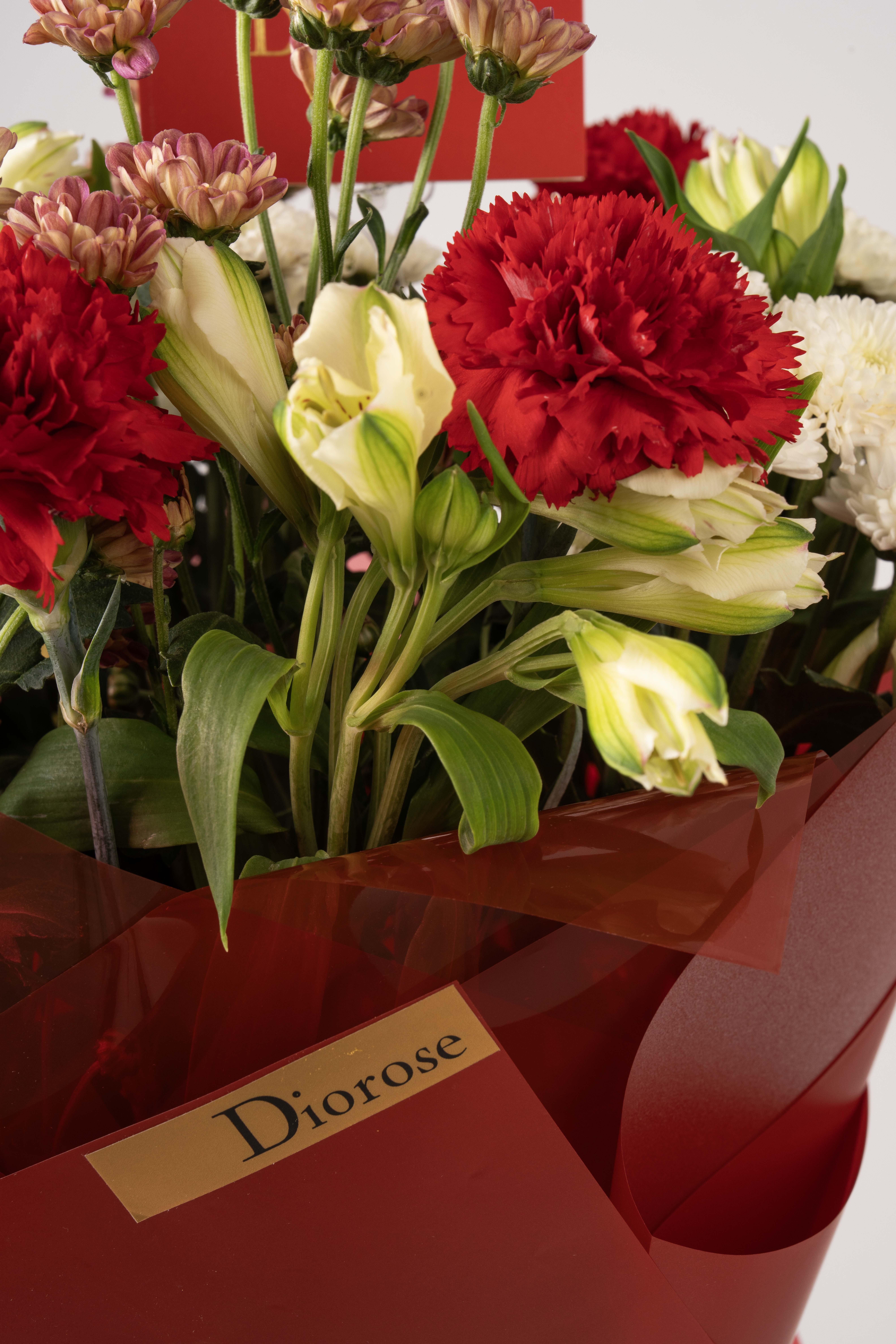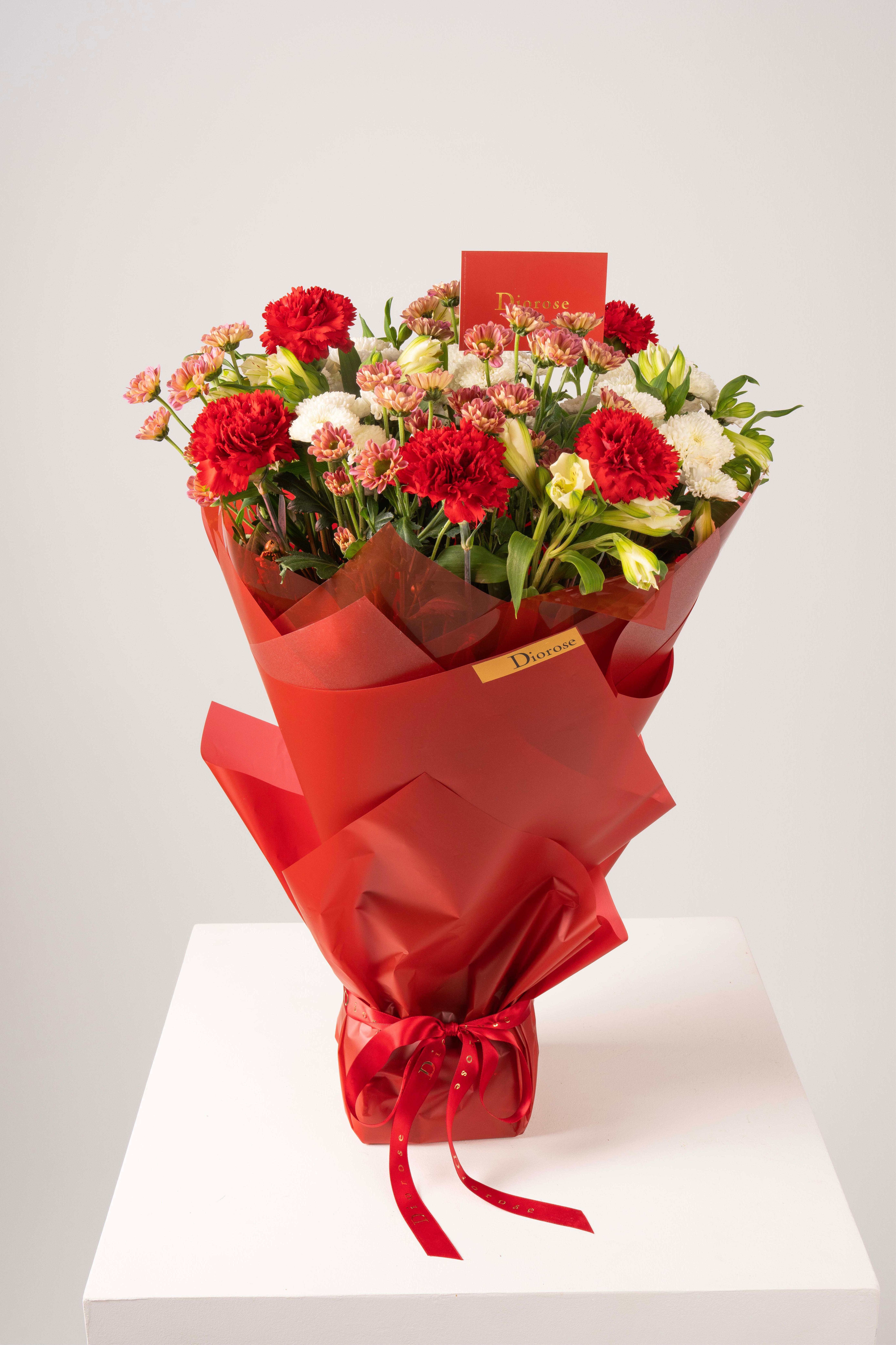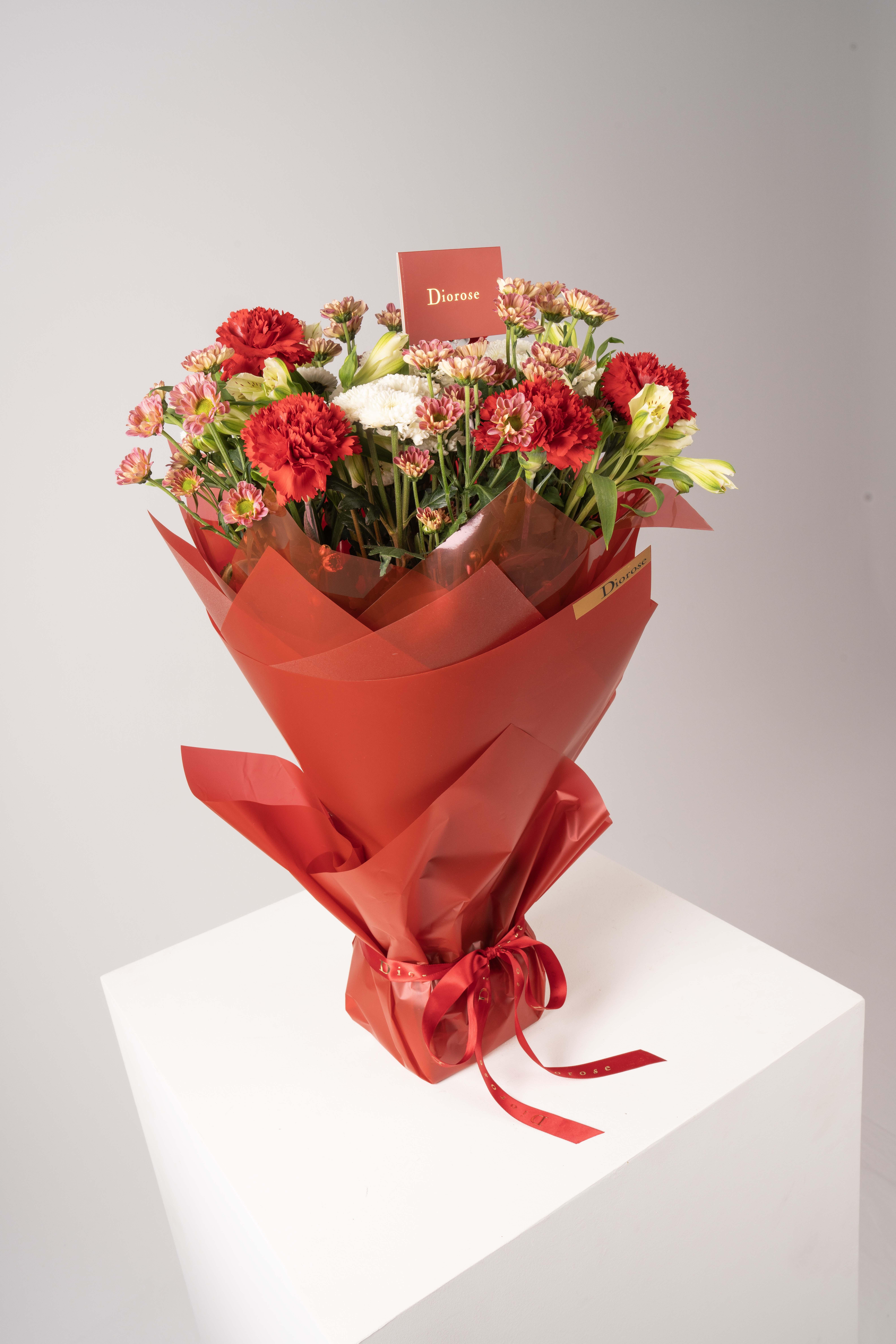 HAND BOUQUETRadiate love and warmth with the Crimson Elegance Hand Bouquet. Beautifully arranged with vibrant red carnations, soft white blooms, and delicate pink accents, this bouquet is wrapped in luxurious red paper and tied with a satin ribbon. Perfect for expressing passion, admiration, or heartfelt celebration — an ideal gift for anniversaries, birthdays, or any special moment.