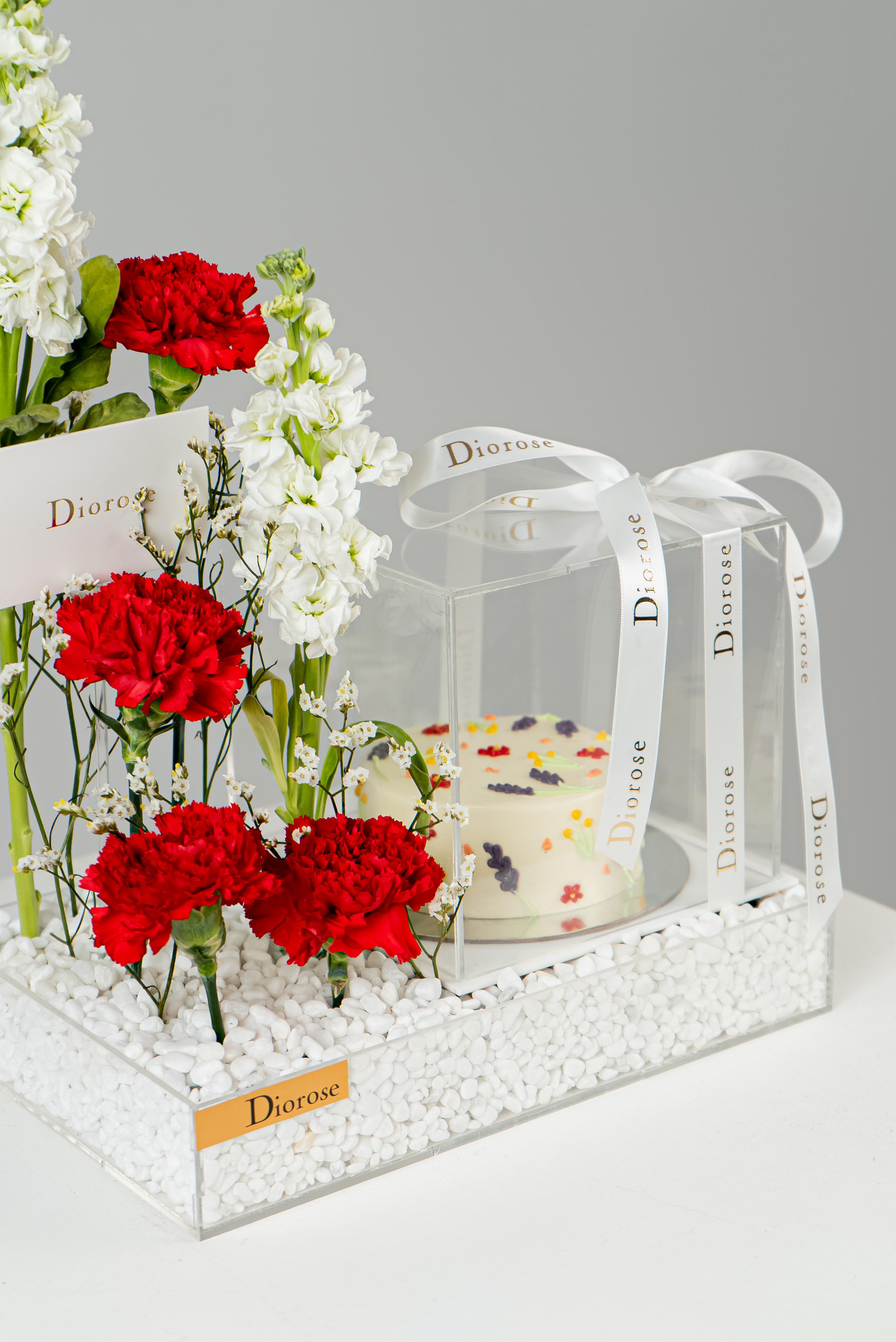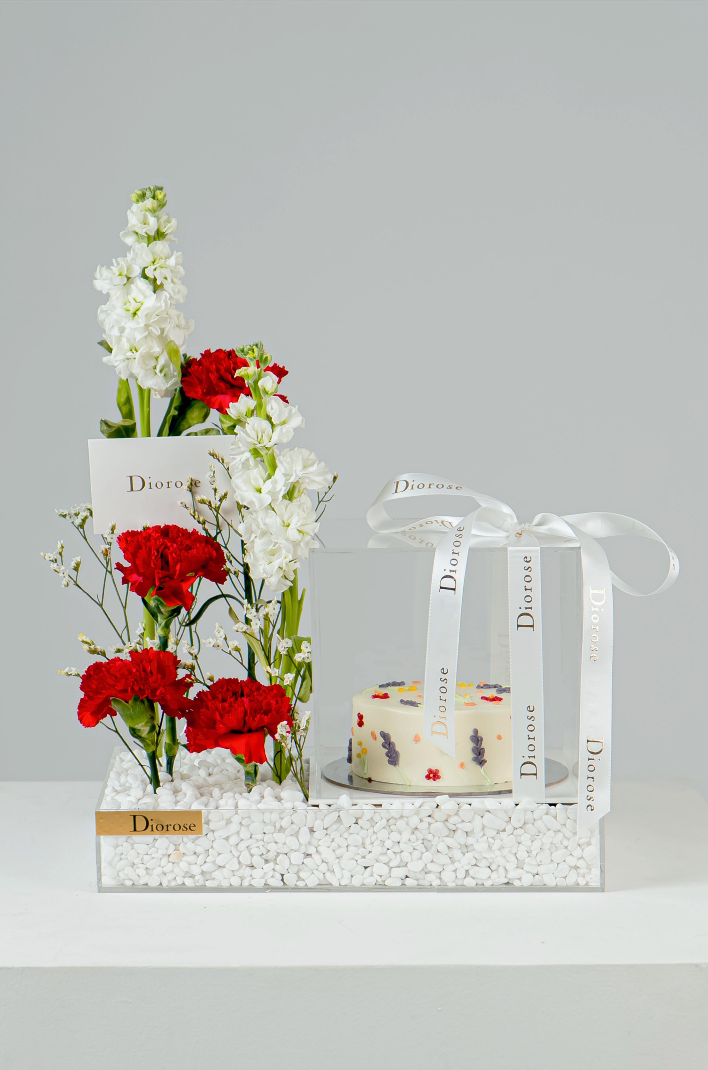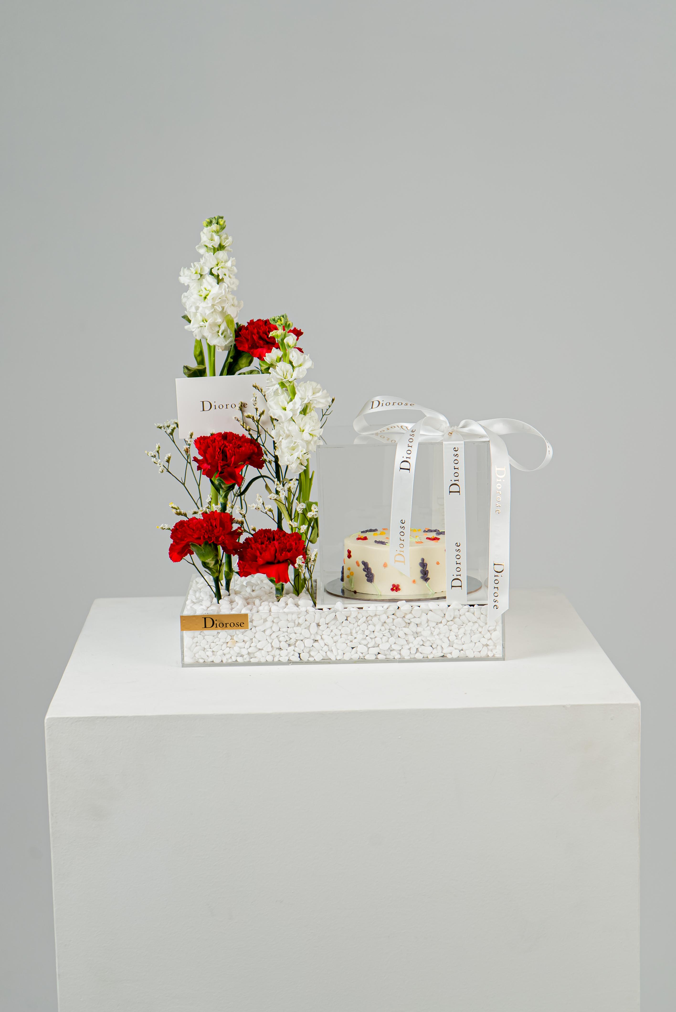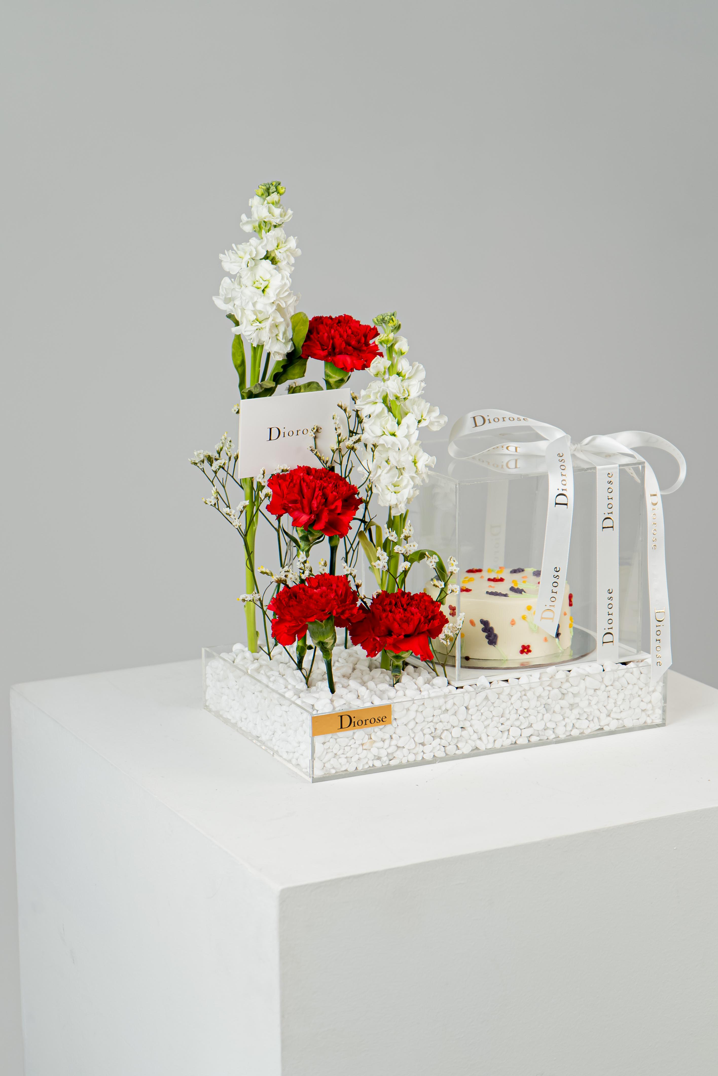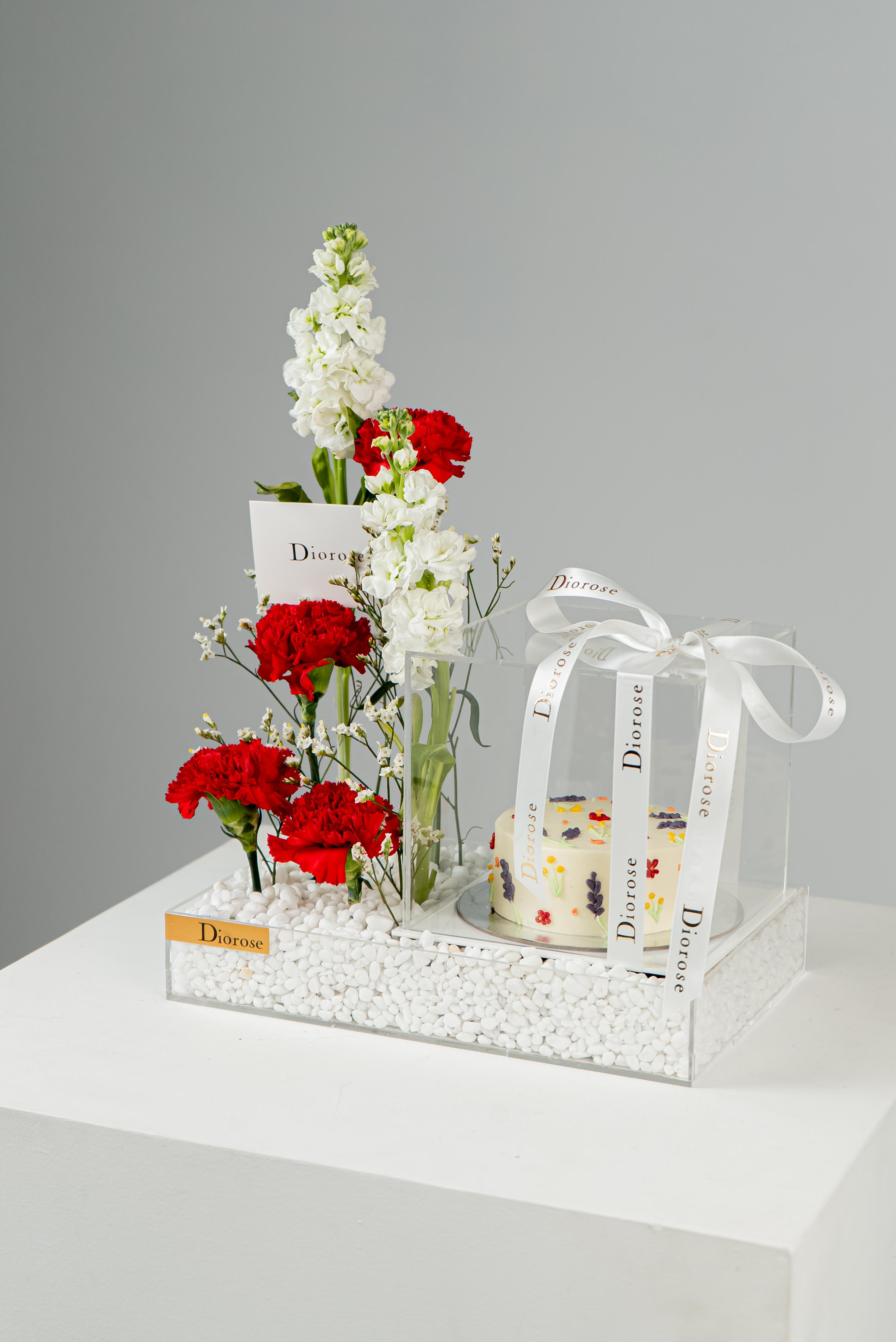 ACRYLICCelebrate love and timeless elegance with our Romantic Harmony Set. Deep red carnations and pure white matthiola and limonium are artfully arranged on a clear acrylic tray, enhanced with sparkling decorative stones. Accompanied by a sumptuous white cake, this luxurious ensemble is perfect for anniversaries, romantic gestures, or any special occasion that deserves a touch of sophistication and heartfelt charm.