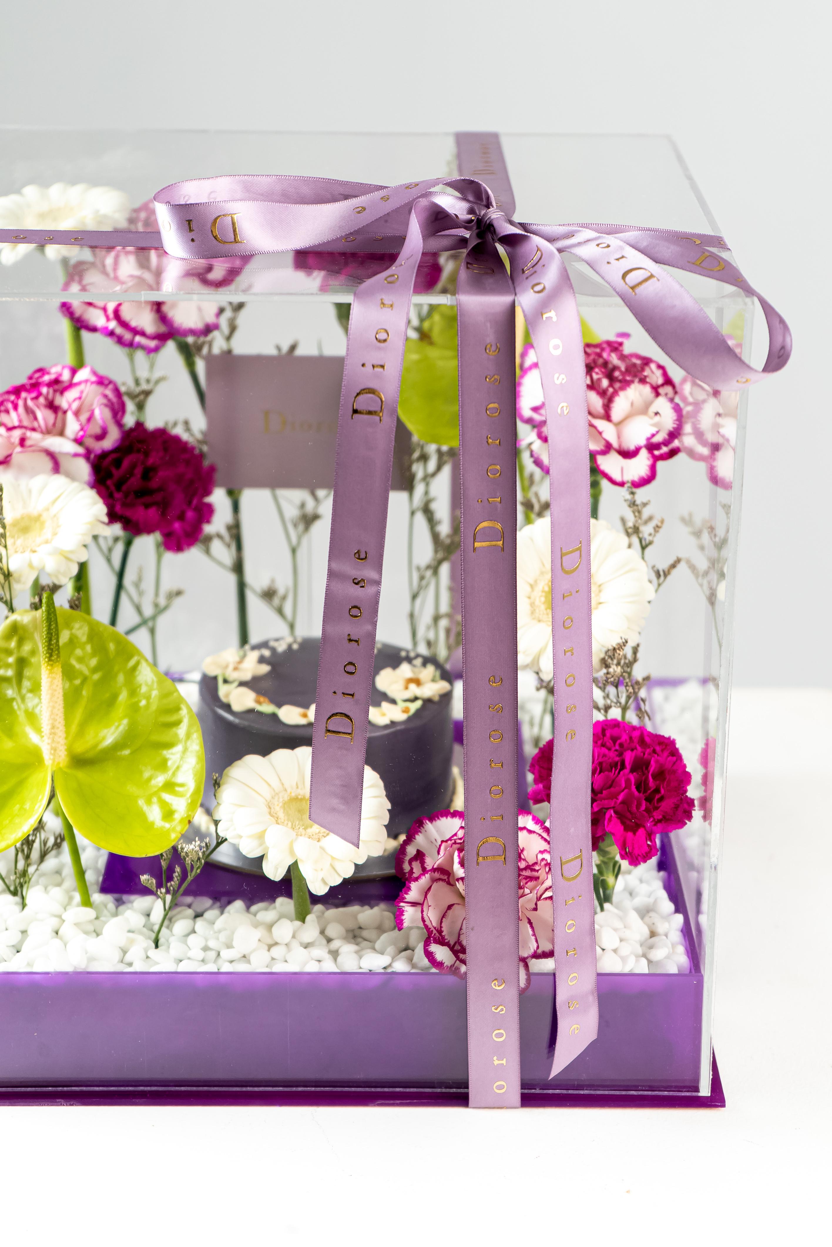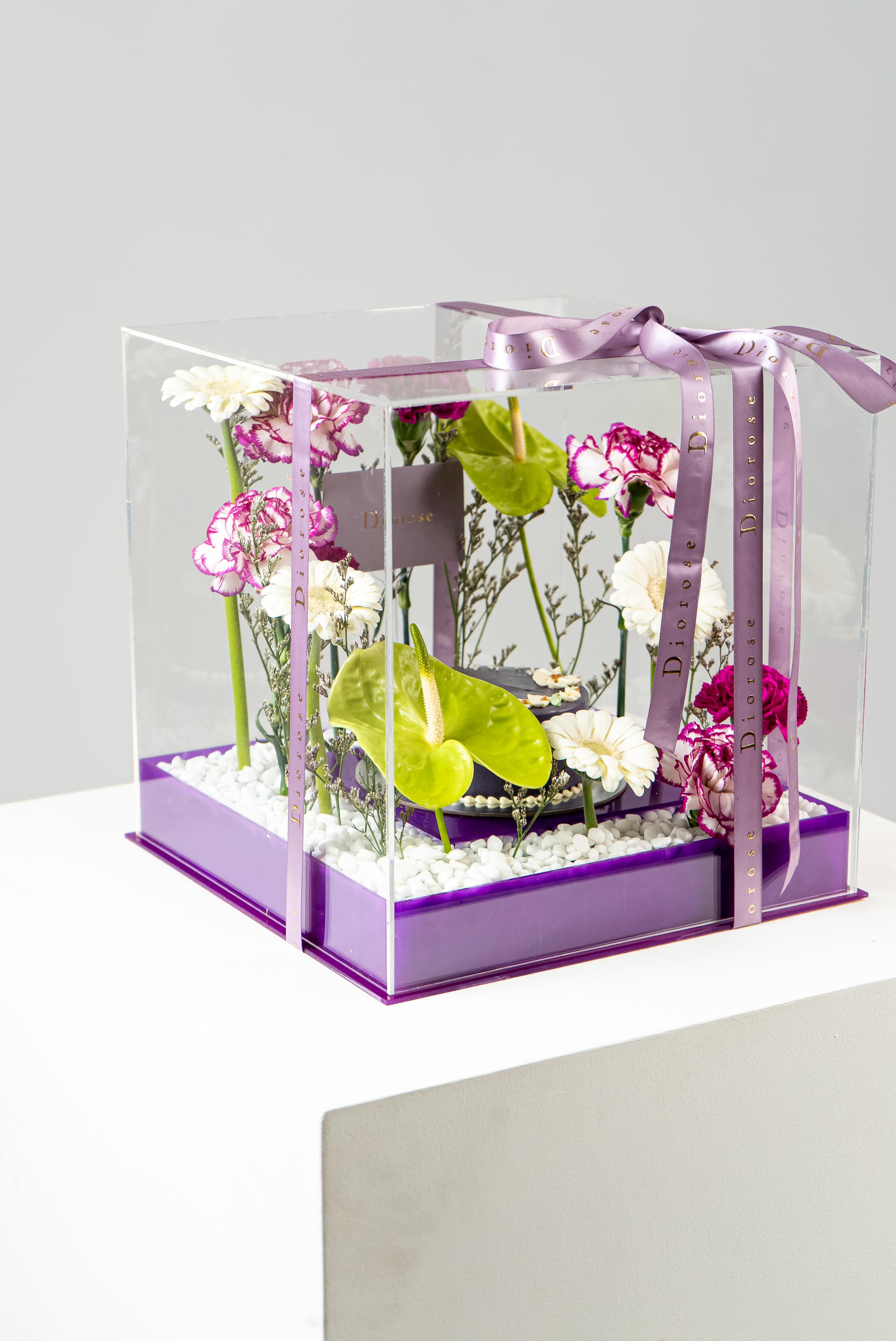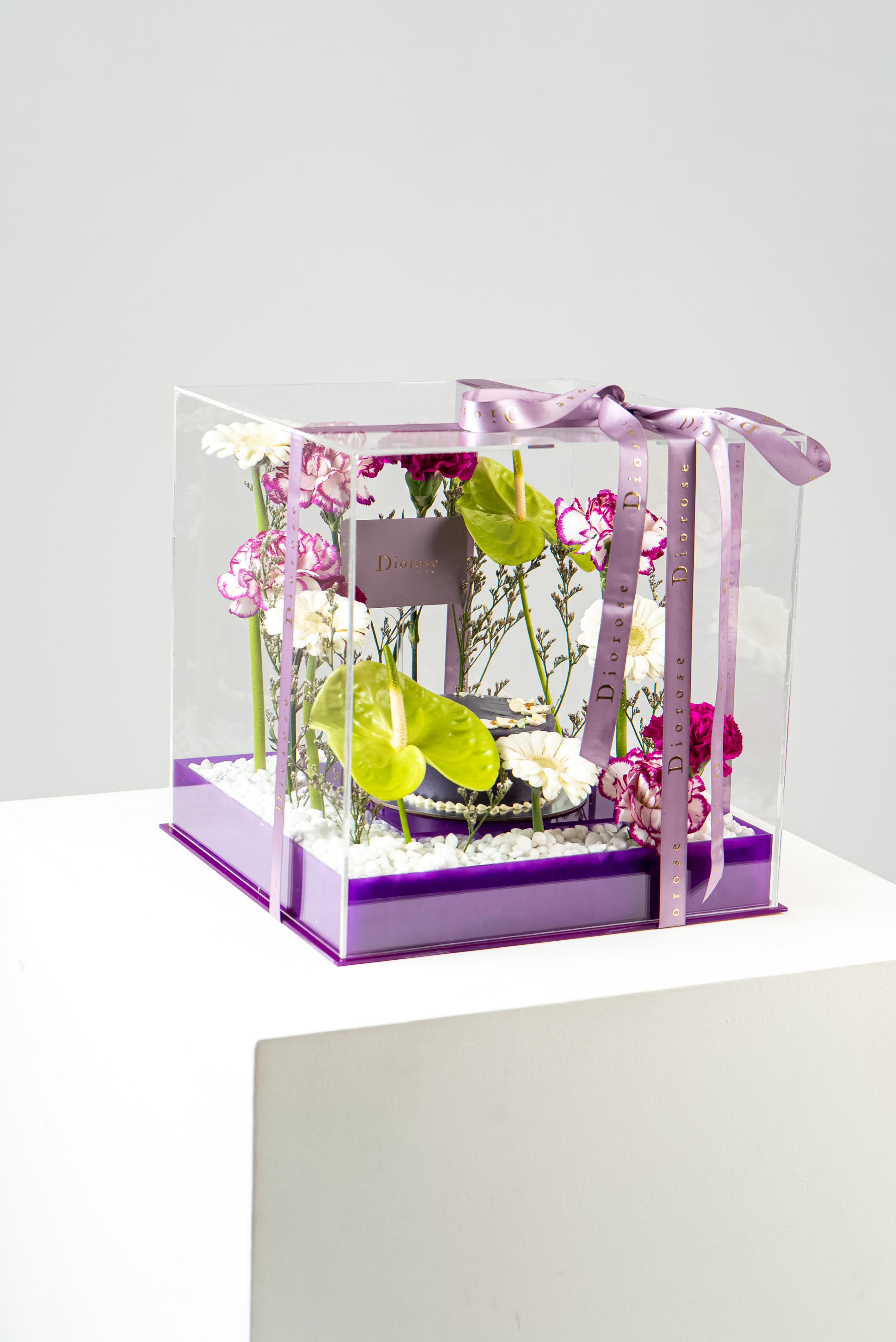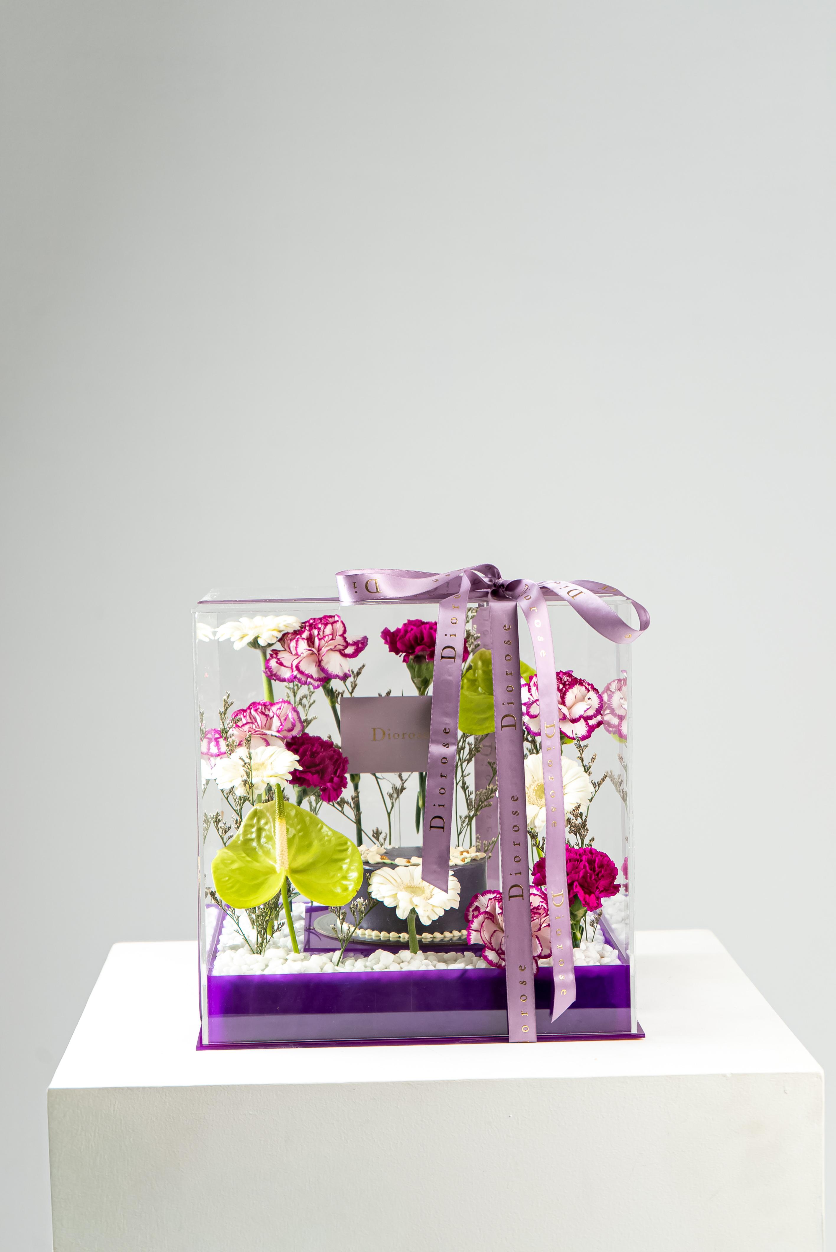 ACRYLICA striking celebration of elegance and color, this luxurious arrangement is presented in a clear acrylic box with a rich purple acrylic base. At its heart sits a beautifully crafted purple cake, surrounded by a refined floral composition. Green anthuriums add a bold, modern accent, while white gerberas bring softness and balance. Layers of purple carnations and double-color purple carnations create depth and texture, complemented by delicate purple limonium. Finished with white decorative stones, this arrangement is perfect for birthdays, anniversaries, and sophisticated celebrations.