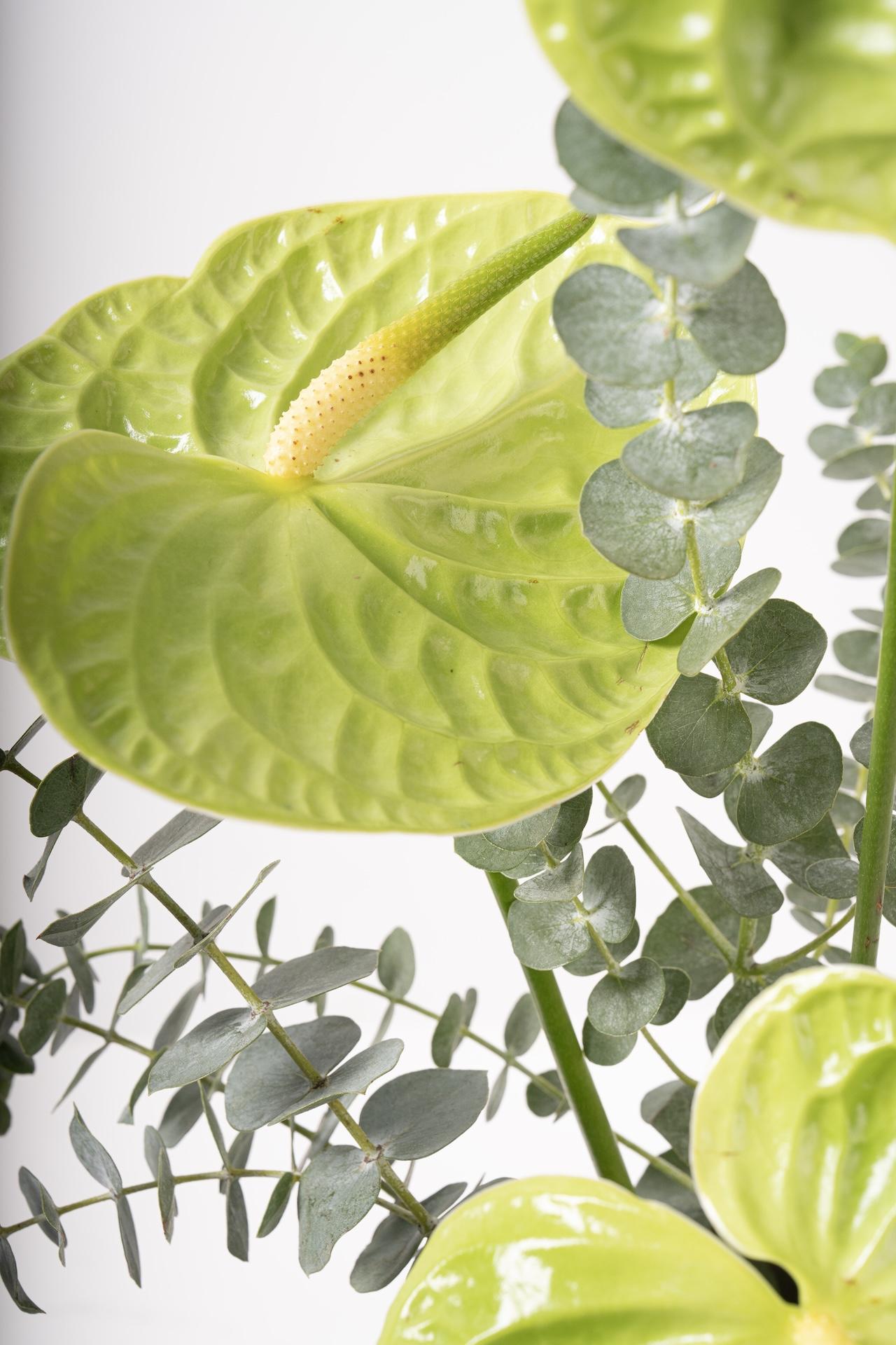 VASESAdd a touch of hotel elegance to your home or office with this sophisticated floral arrangement. Set in a sleek ceramic vase, the striking green anthurium pairs effortlessly with soft eucalyptus, creating a fresh, modern look inspired by luxury interiors.