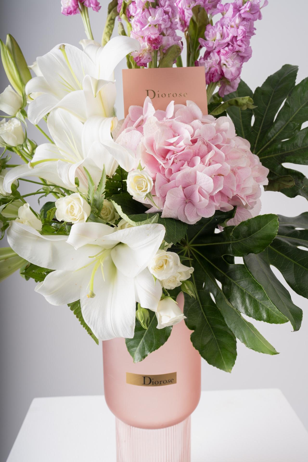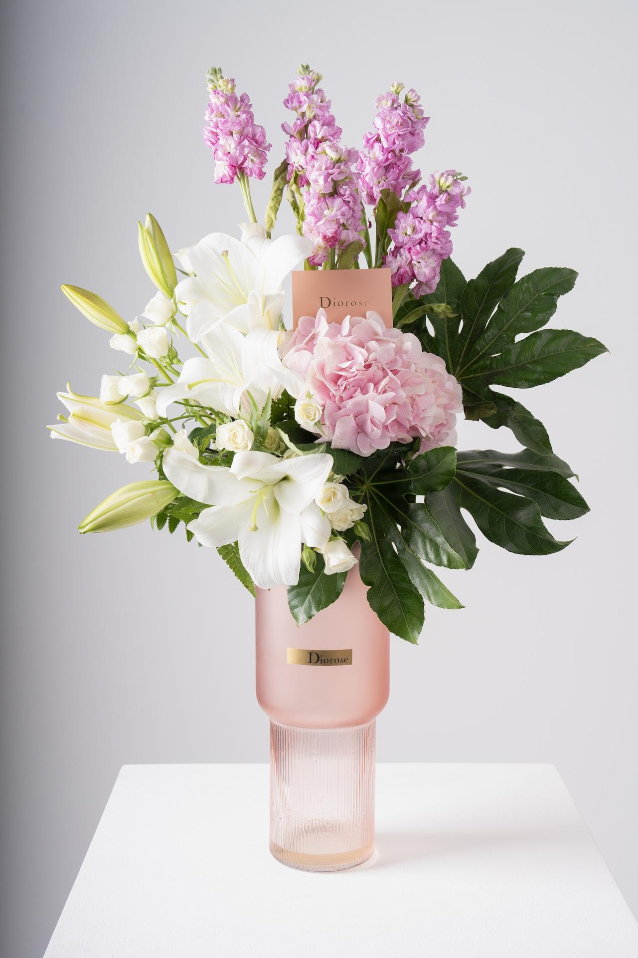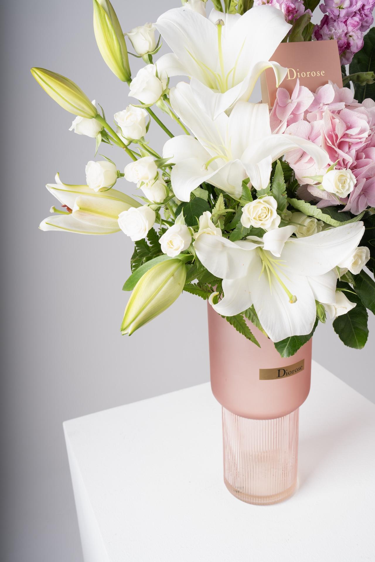 VASESBrighten your space with this beautiful blend of pink matthiola, hydrangea, lilies, and white spray roses, complemented by lush greenery. Choose from a selection of vases to match your style, making it the perfect gift or home décor addition.