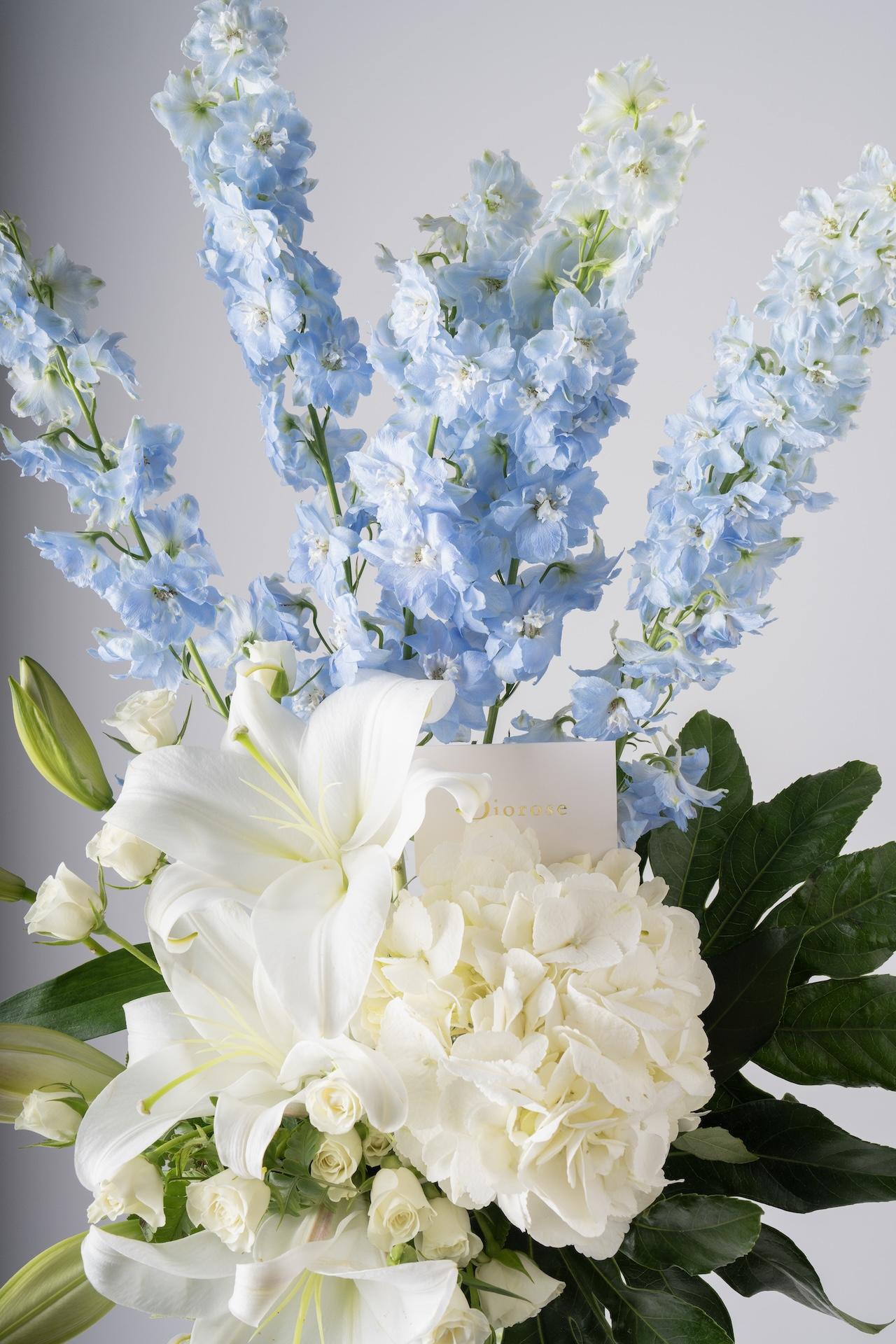 VASESEnhance your space with this exquisite blend of light blue delphinium, hydrangea, lilies, and white spray roses, beautifully accented with lush green leaves. You can select from a variety of elegant vases to make this the perfect gift or stylish addition to any room.