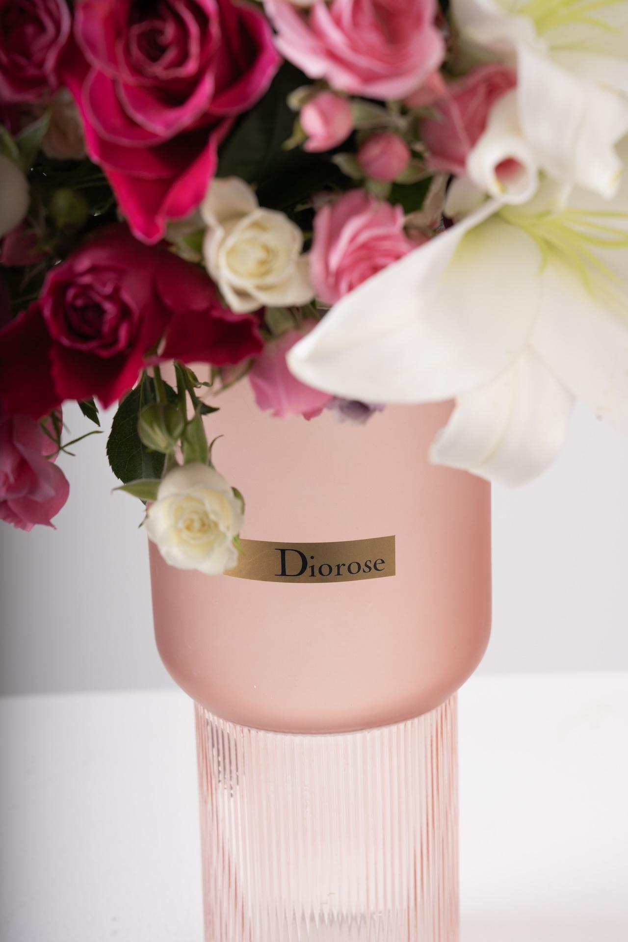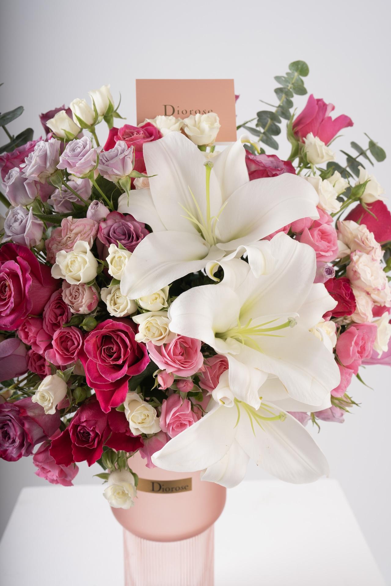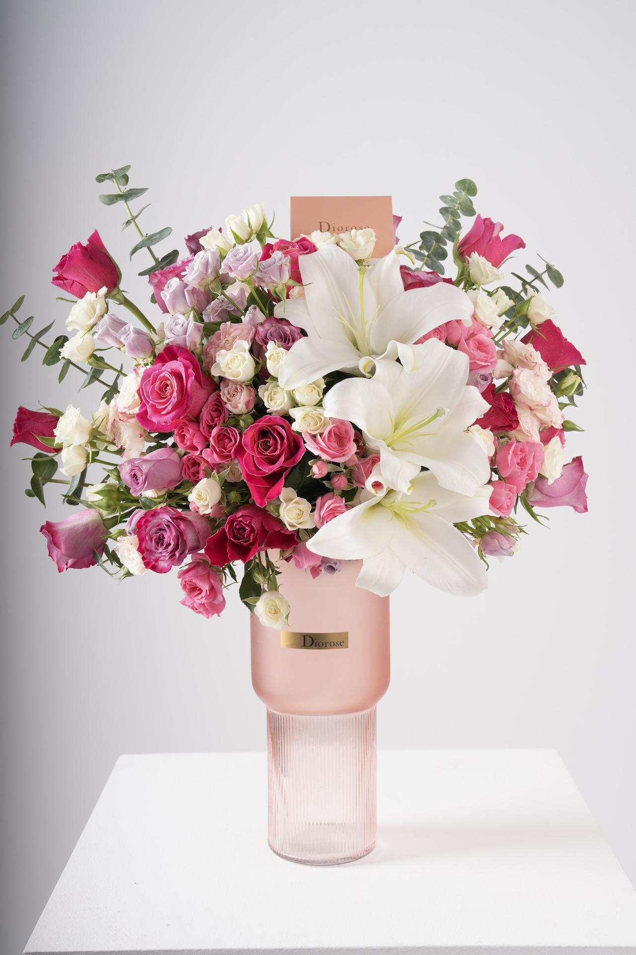 Indulge in the elegance of this stunning arrangement featuring pink blooms and graceful lilies, thoughtfully presented in a vase of your choice. With a selection of beautiful vases to complement the display, this arrangement makes an ideal gift and adds a luxurious touch to any décor or occasion.
