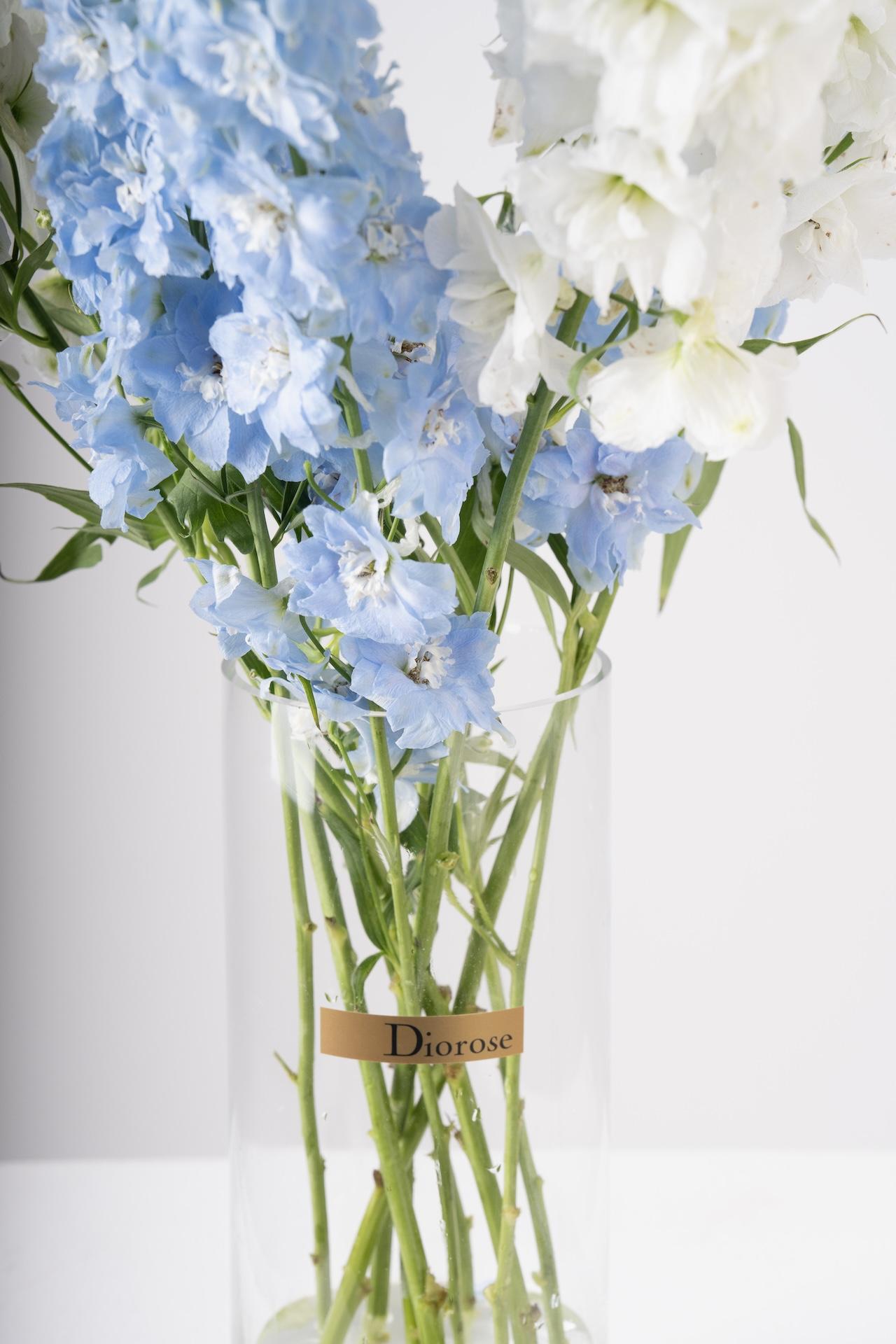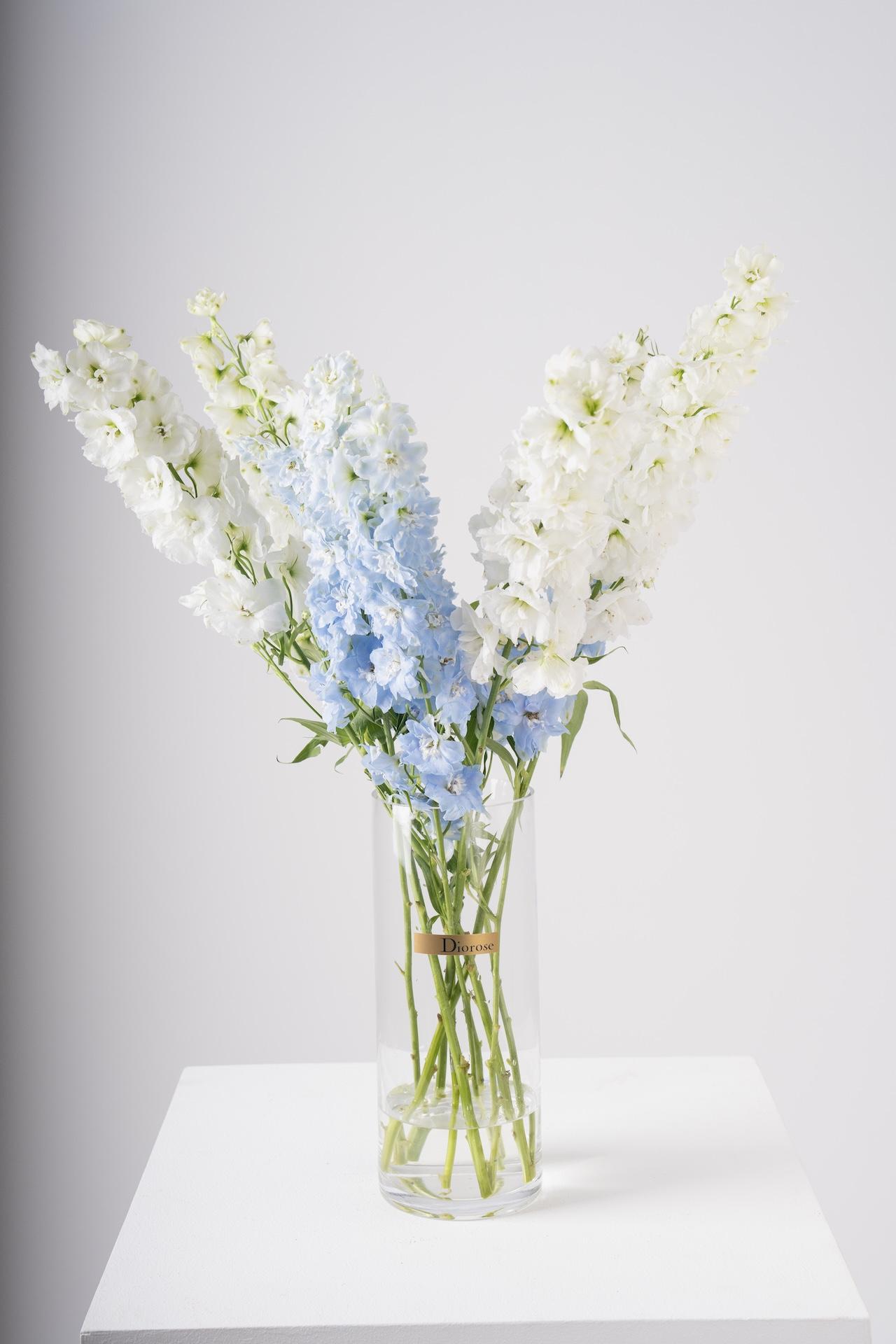 VASESAdd a touch of elegance and tranquility with this beautiful arrangement of light blue and white delphinium, arranged in a clear vase. The soft, calming hues of the delphinium bring a serene and sophisticated feel to any space, perfect for brightening up your home, office, or as a graceful gift.